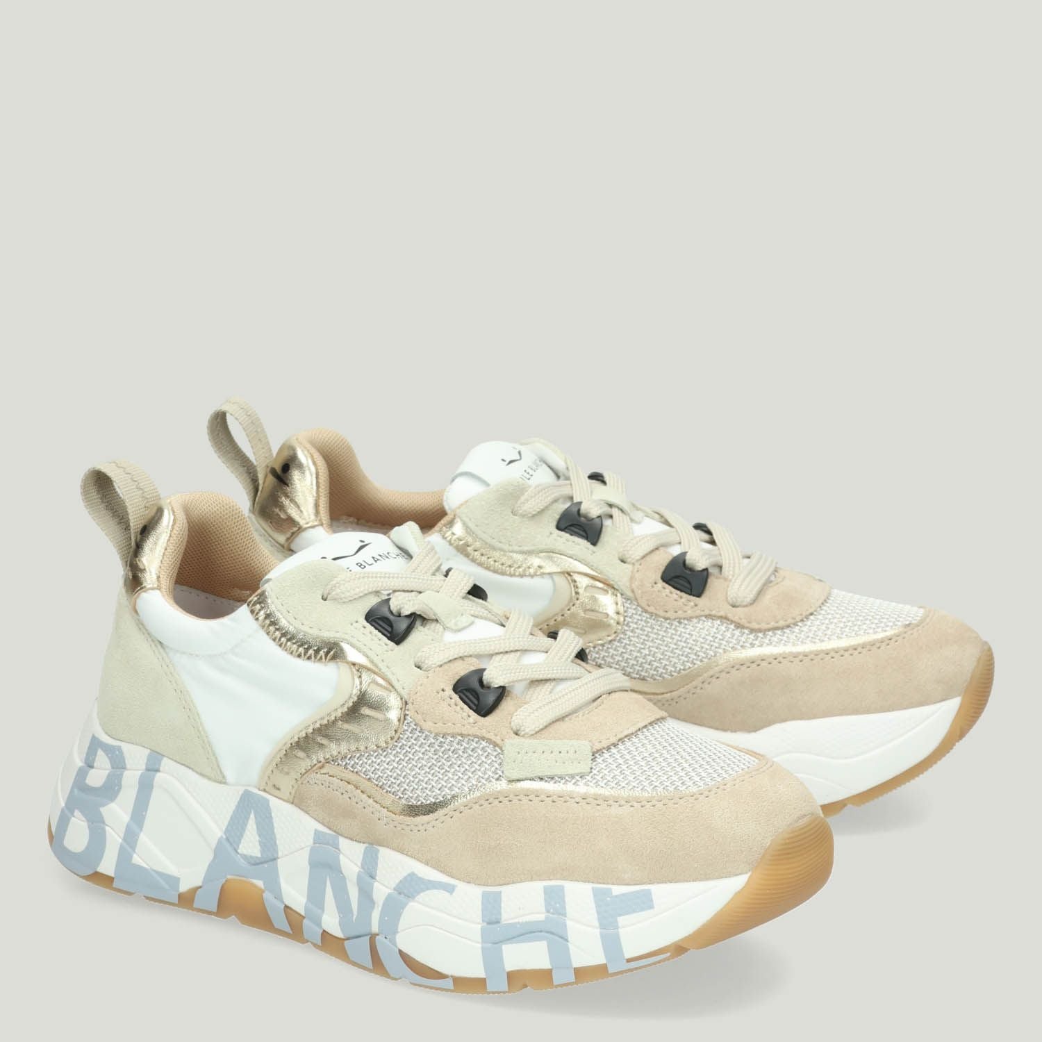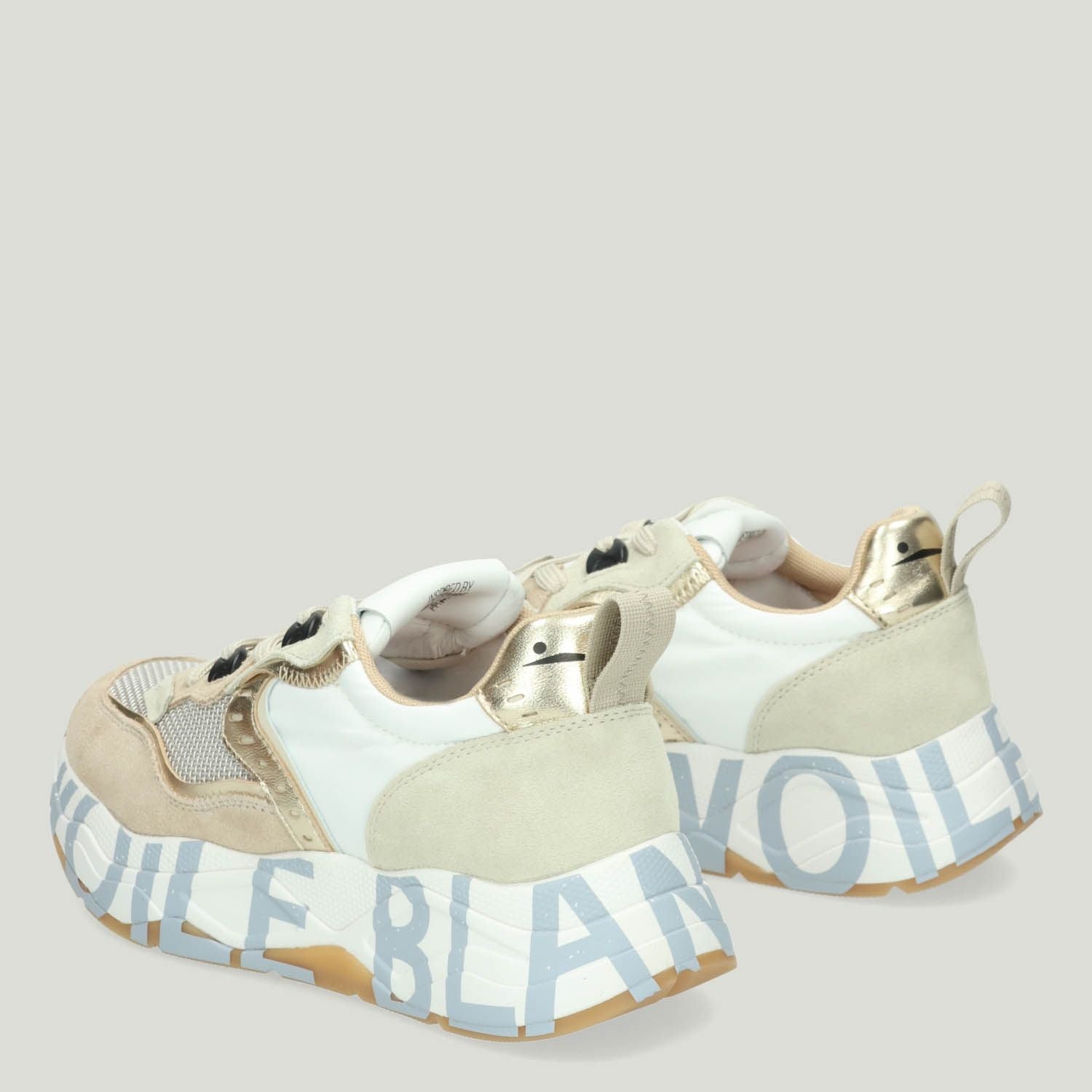 Club105 sneakers. Beige/gold and ivory mesh nylon upper with beige suede trim. Matching lace-up closure. Leather and fabric lining. Removable insole. 5 cm white rubber platform sole with lettering. Women's Voile Blanche collection.