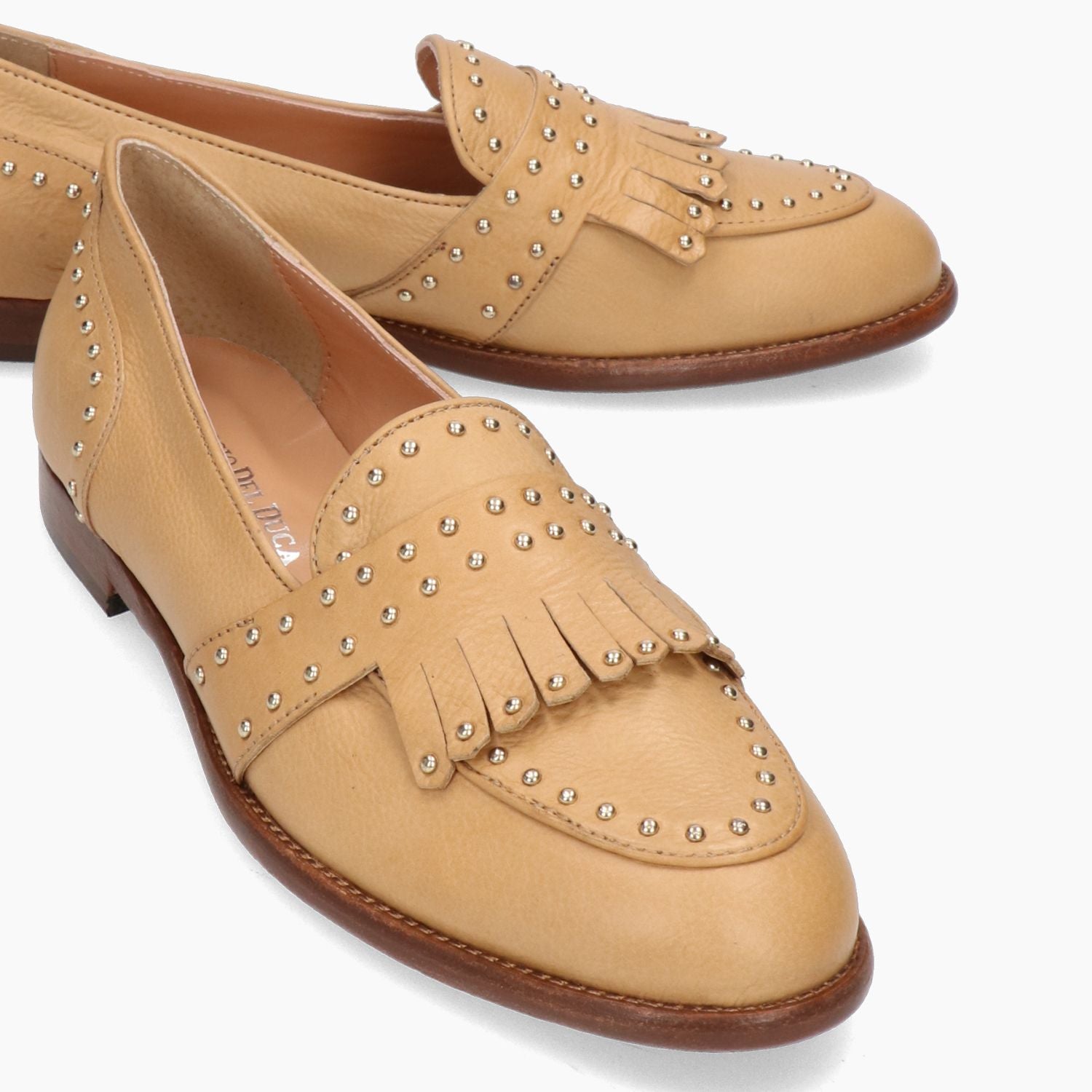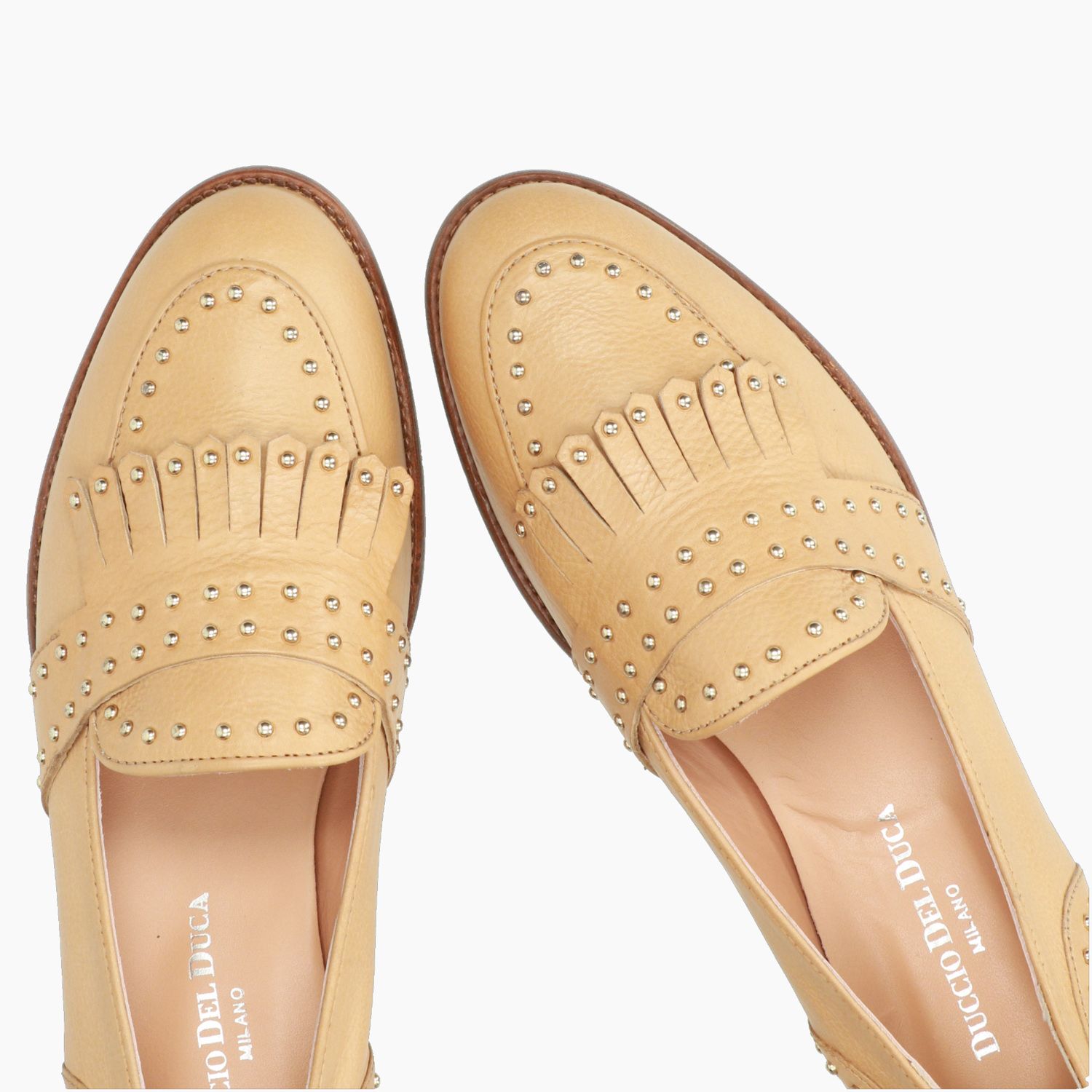 Camel leather loafer with gold studs. Fringe strap. Leather lining. Leather sole with 2 cm heel. Duccio Del Duca Milano collection.