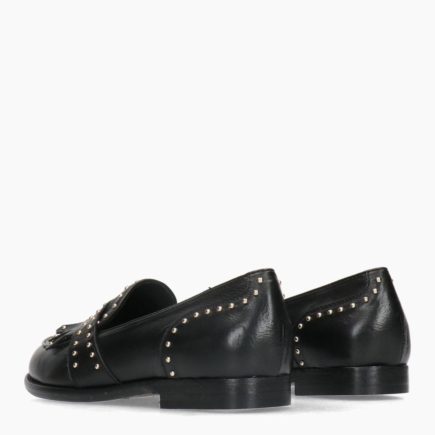 Black leather loafer with gold studs. Fringe strap. Leather lining. Leather sole with 2 cm heel. Duccio Del Duca Milano collection.
