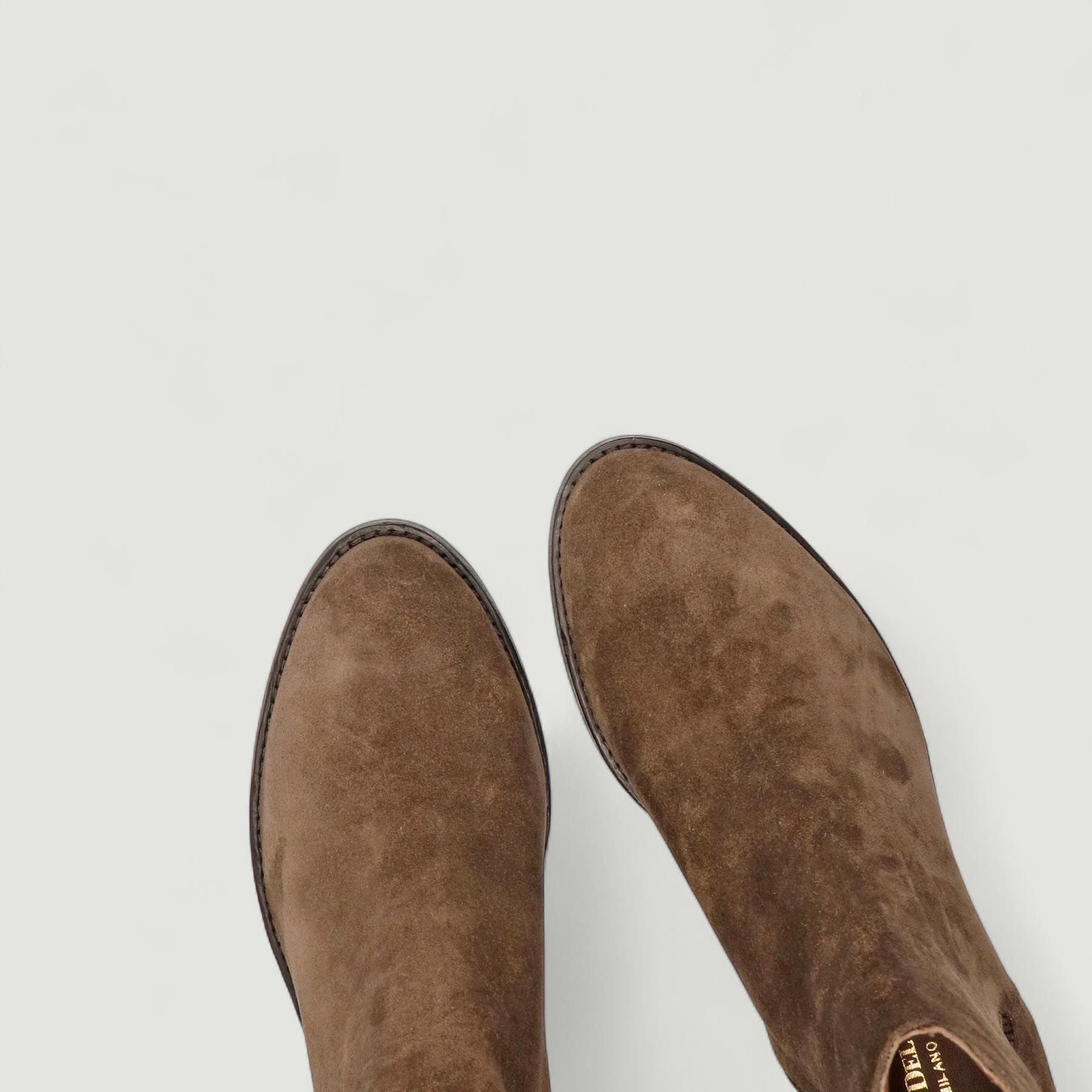 Ankle boots with brown suede upper. Small side vent with matching elastic. Leather lining. Leather and rubber sole with 5 cm heel. Duccio Del Duca women's Fall/Winter collection.