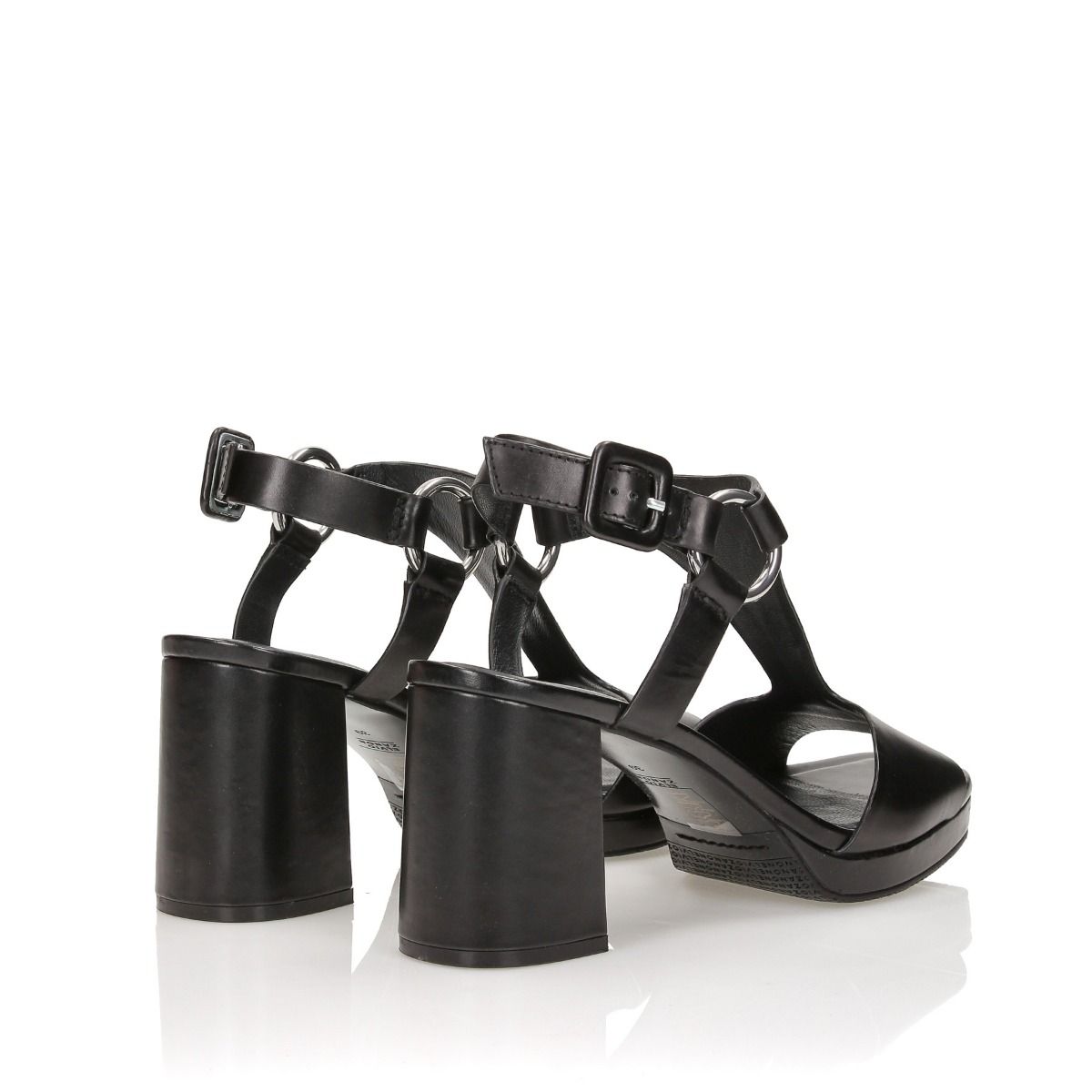 Black leather sandals with metal rings on the sides, 80 cm heel, 15 cm platform, rubber sole.