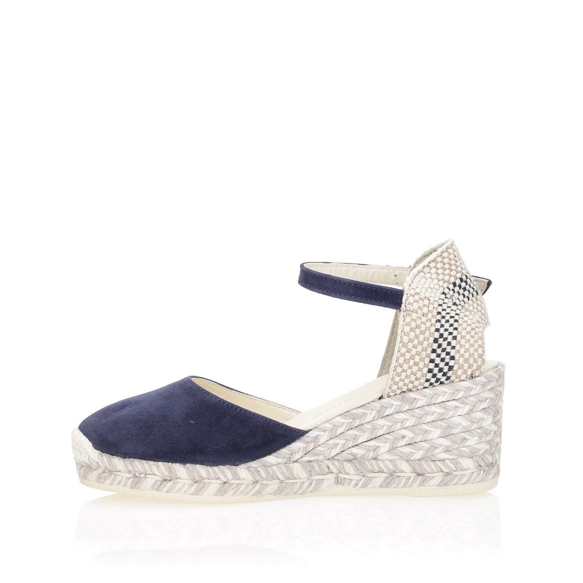 Blue suede espadrilles. Round toe. Strap closure. Fabric and leather lining. Rubber sole. 7 cm wedge. Women's Spring/Summer Espadrilles Collection.