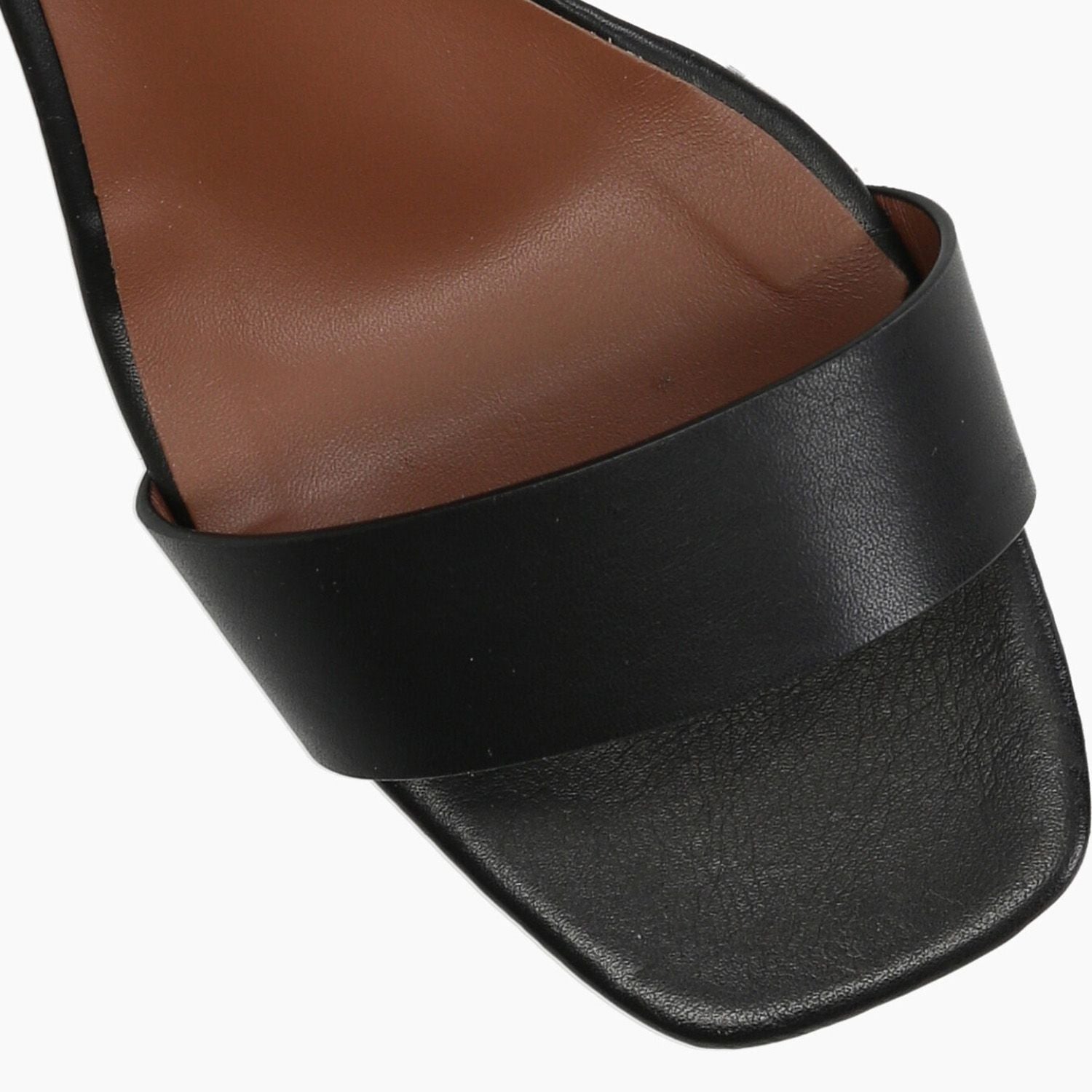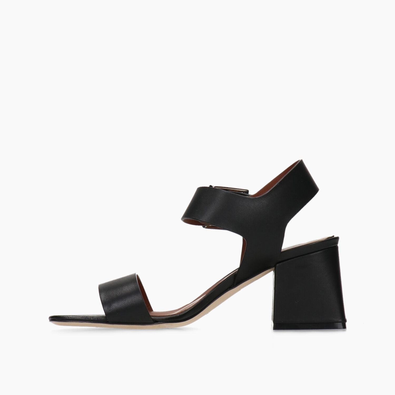 Black leather sandals with side buckle, 65cm heel, leather sole.
