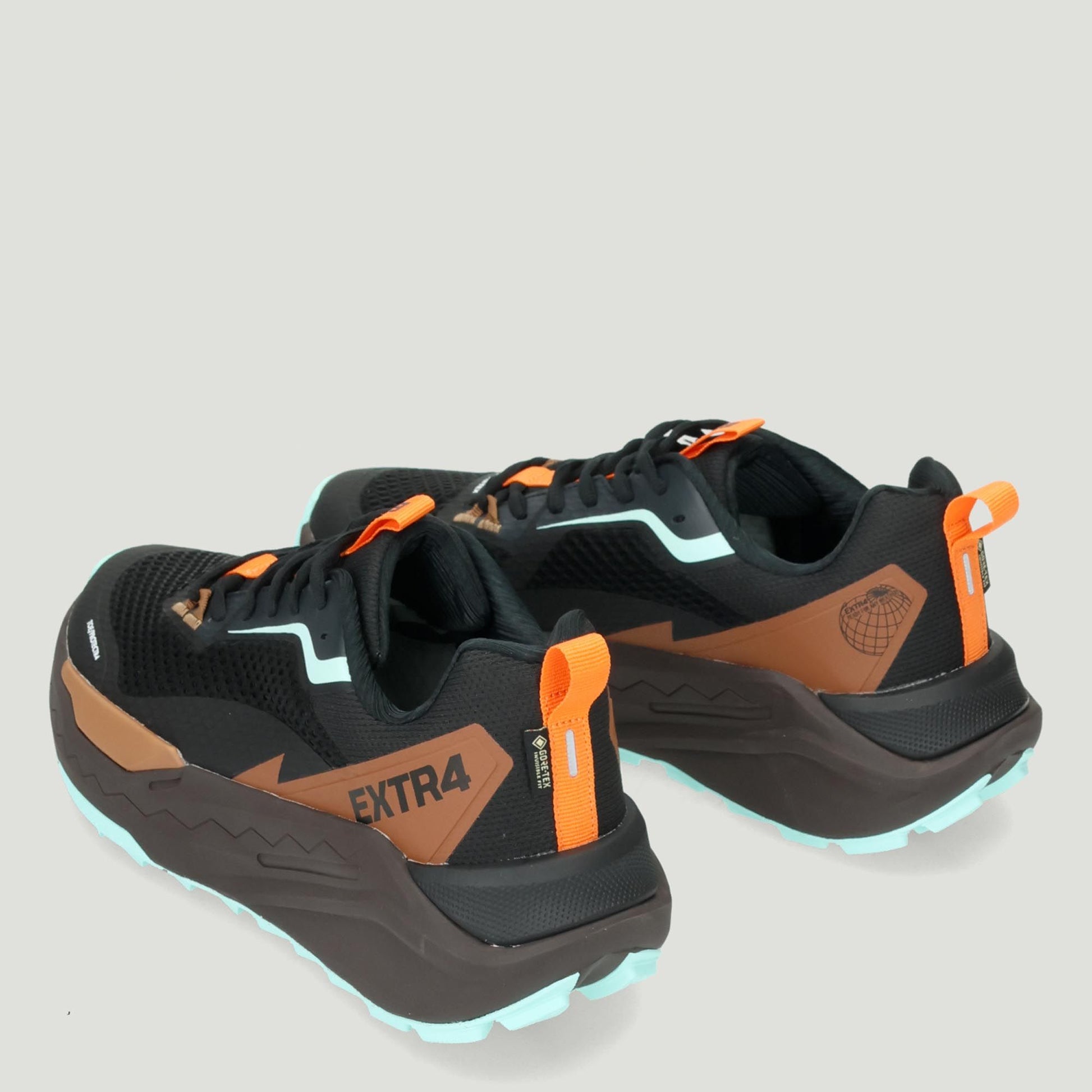 Black fabric sneaker with brown and aquamarine details. Fabric lining. Upper with the special Invisible Fit Gore-Tex application that ensures waterproofness and maximum breathability. Hyper-cushioning Phyton rubber sole. Removable Rapid-Tech insole. Men's Extr4 collection.