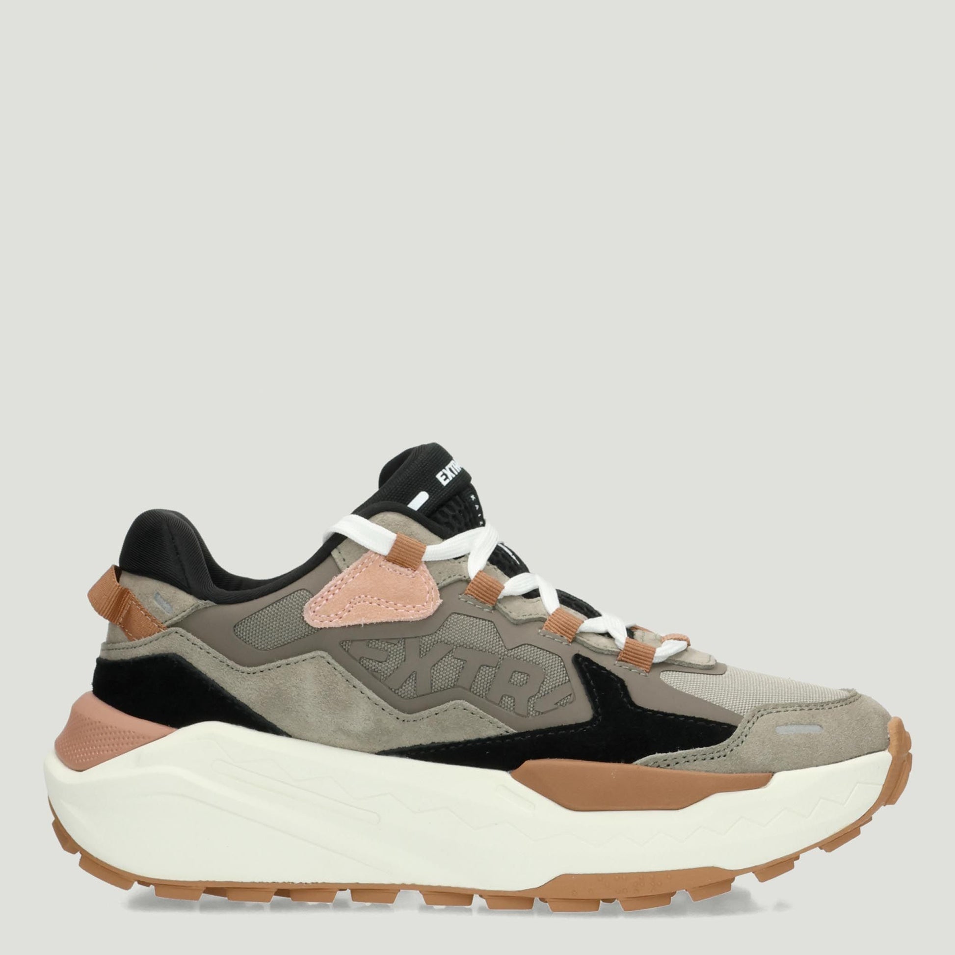 Sneaker in dove gray technical fabric with beige and black suede inserts. Fabric lining. Hyper-shock absorbing Phyton rubber sole. Removable insole. Women's Extr4 collection.