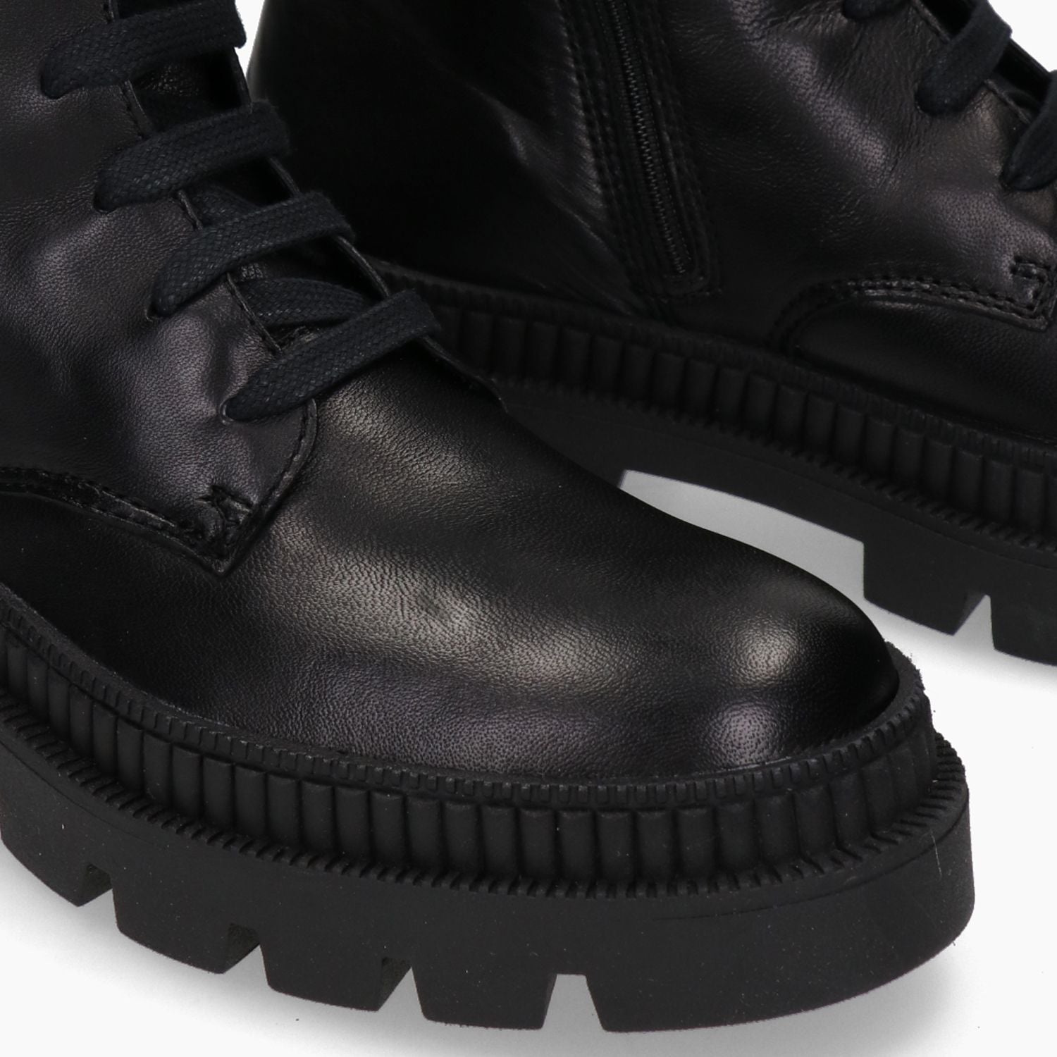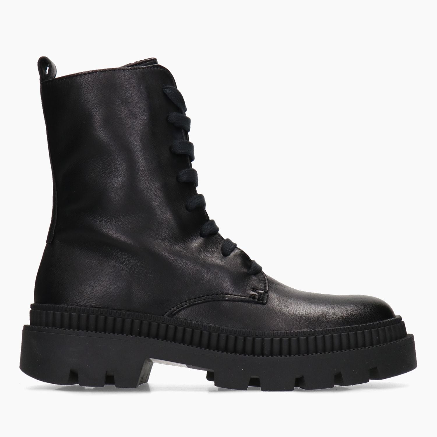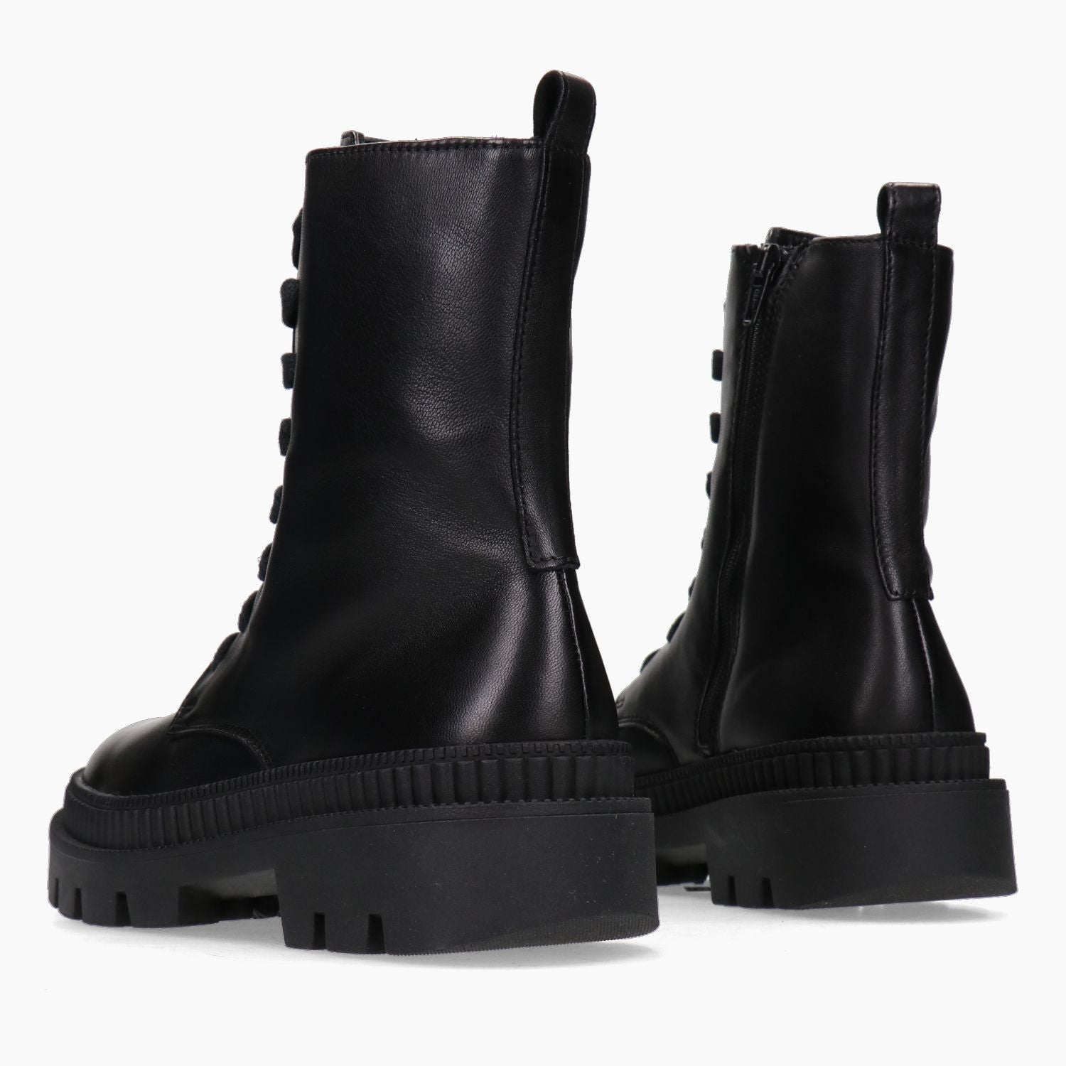Black leather ankle boots with internal zip and rubber sole.