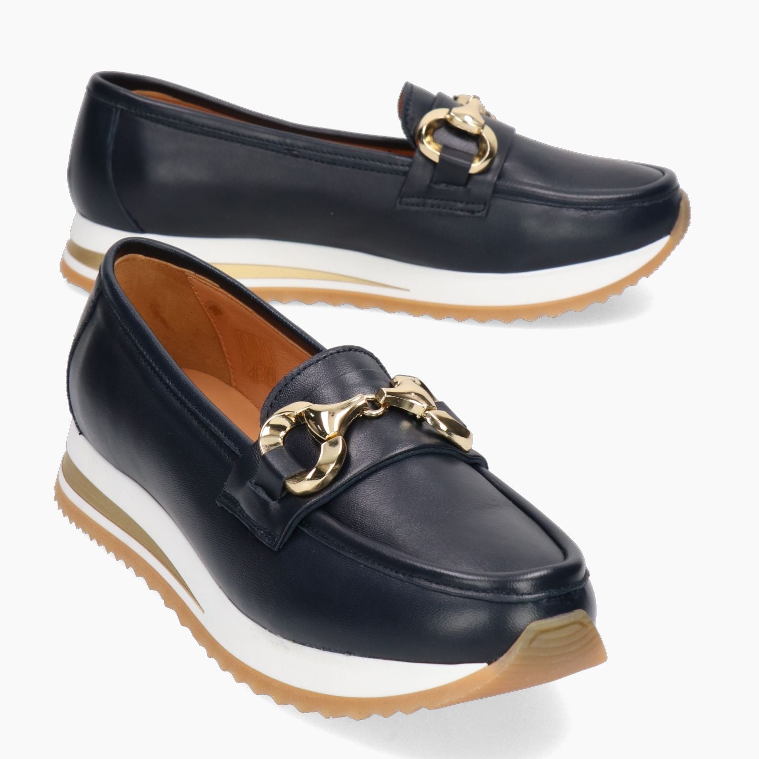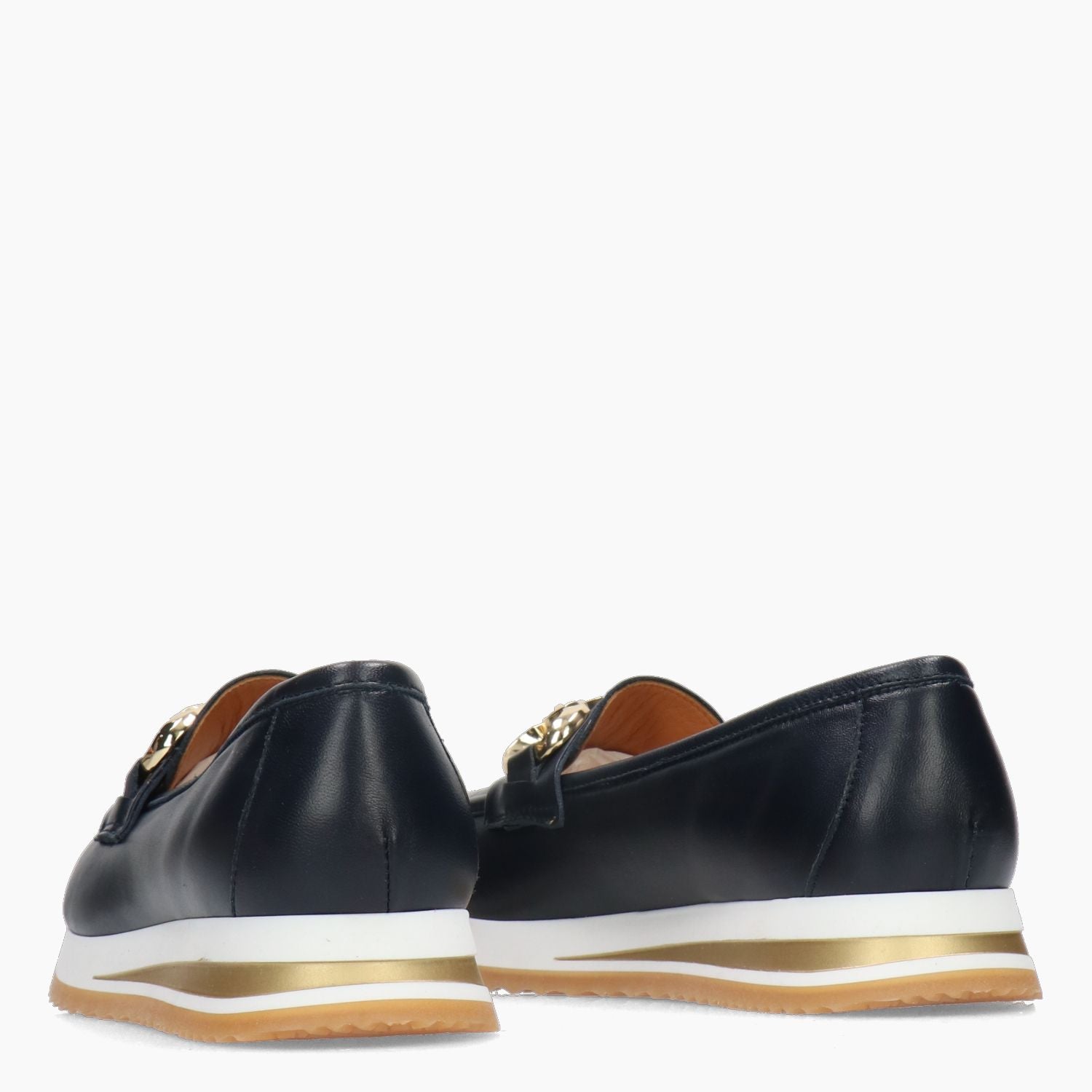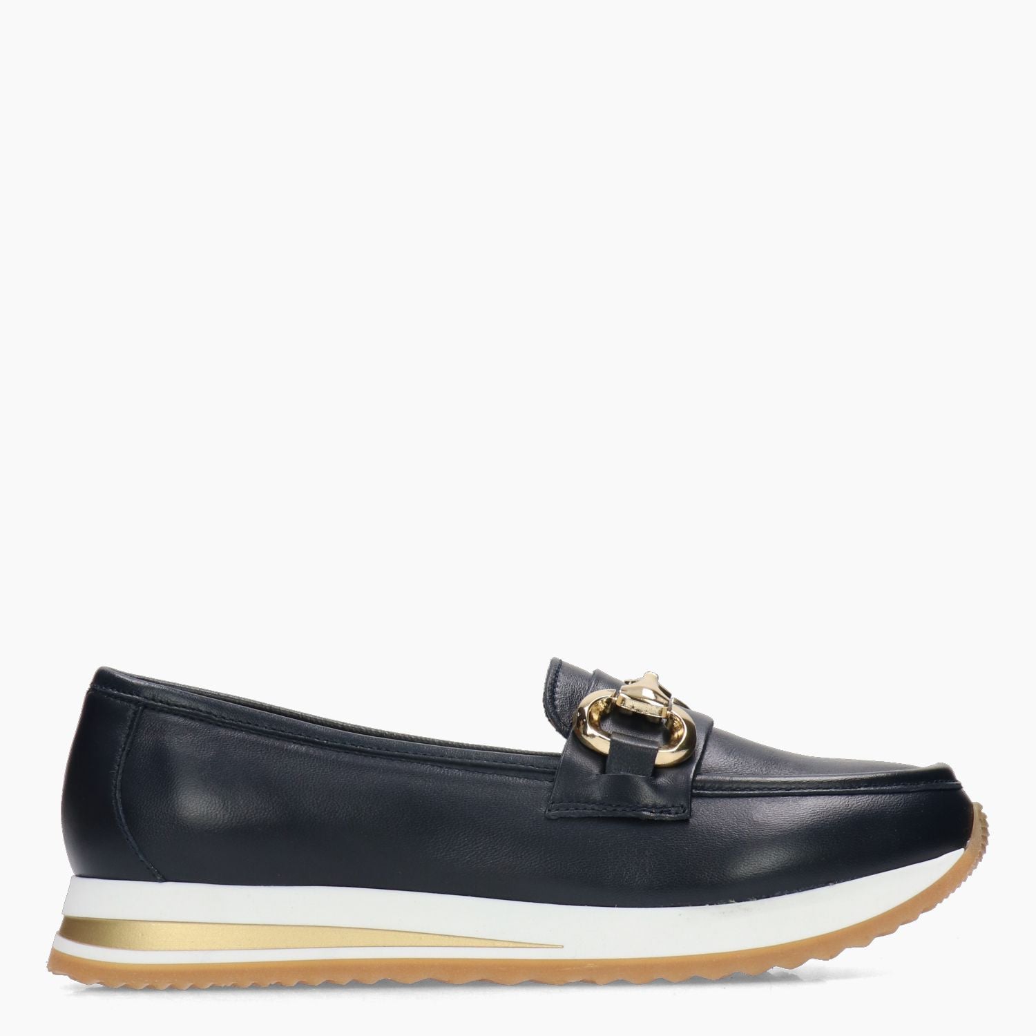 Blue leather loafer with gold-tone metal buckle. Leather lining with non-removable insole. 3 cm rubber sole. G.Luca women's spring/summer collection.