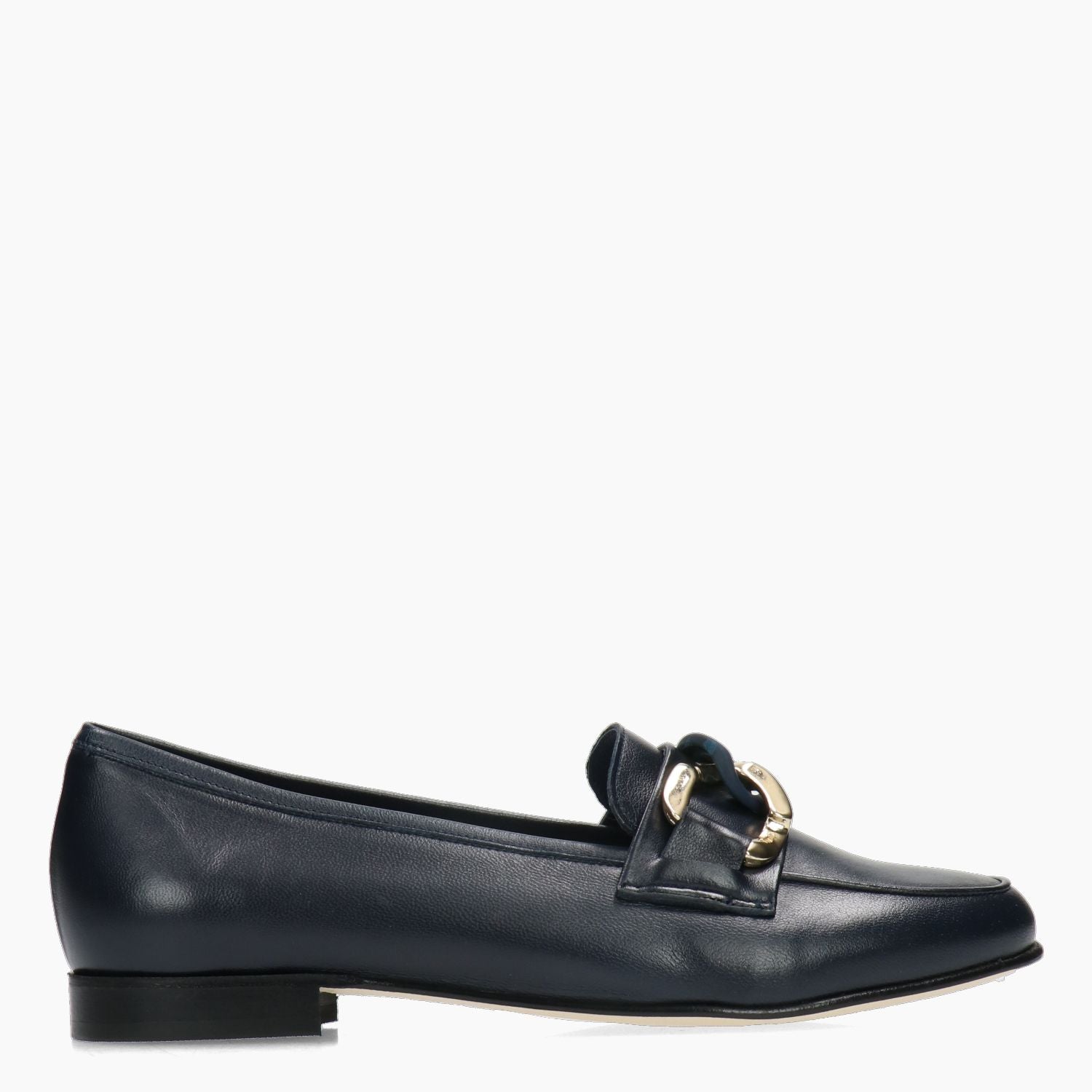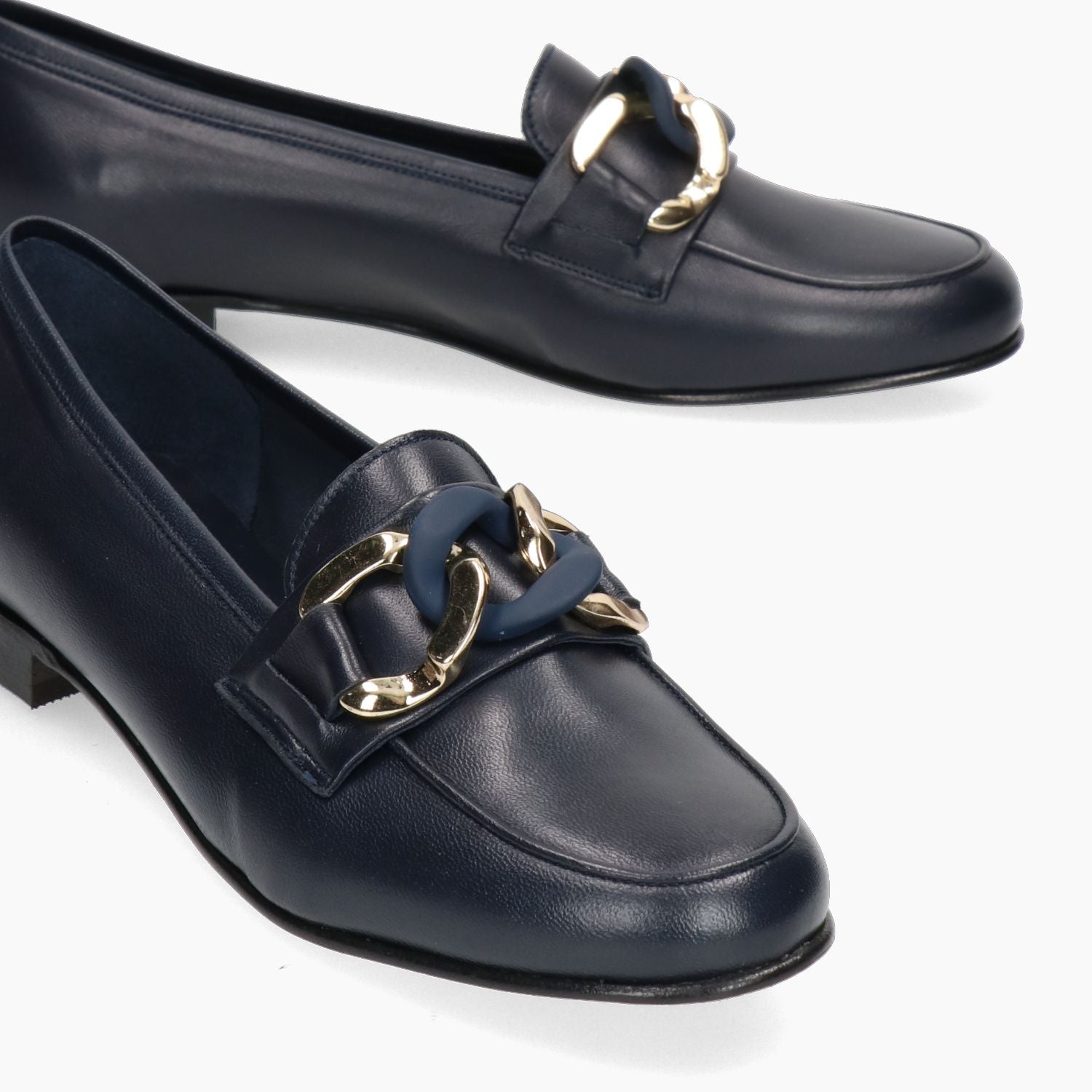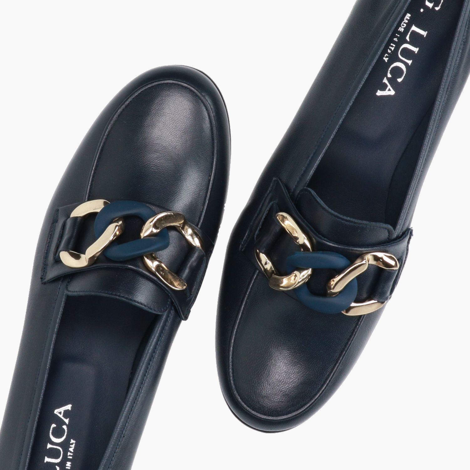 Blue leather loafer with gold and blue metal chain. Half-lined leather interior. Leather sole with 1.5 cm heel. G.Luca women's spring/summer collection.