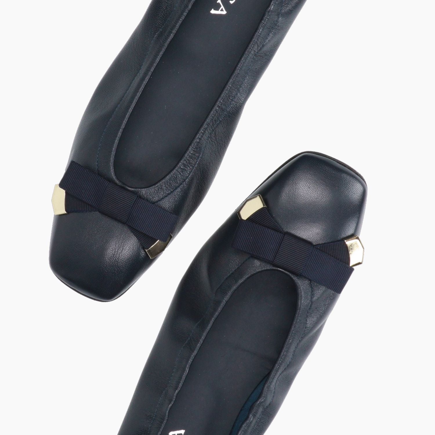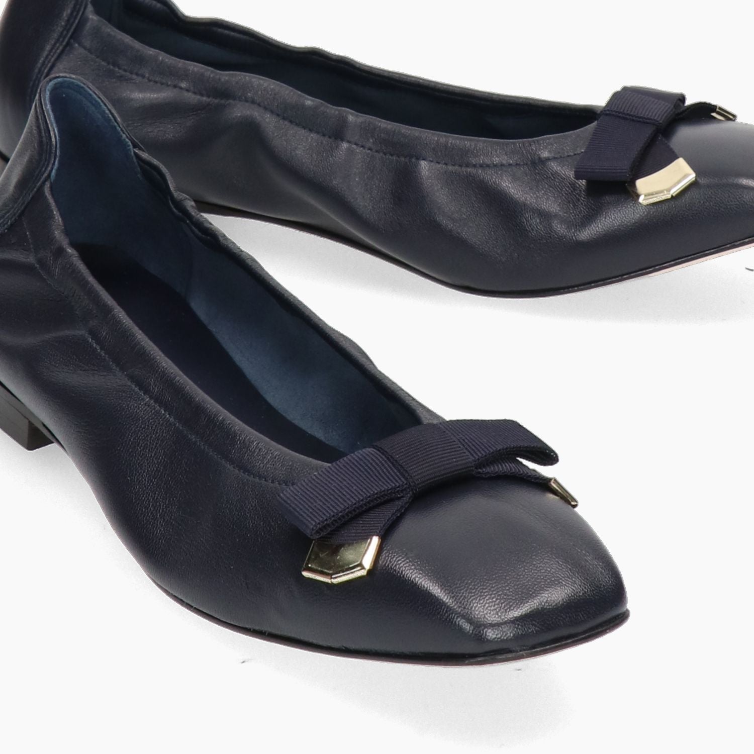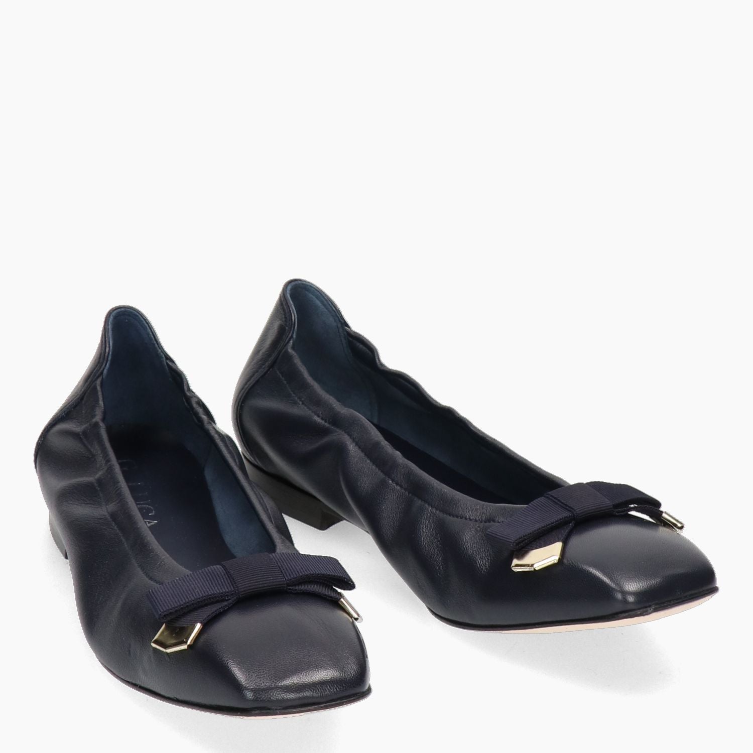 Navy blue leather ballerina flat with a blue grosgrain bow. Elasticated sides for a better fit. Leather lining with a non-removable insole. Square shape. Leather sole with a 1 cm heel. G.Luca women's spring/summer collection.