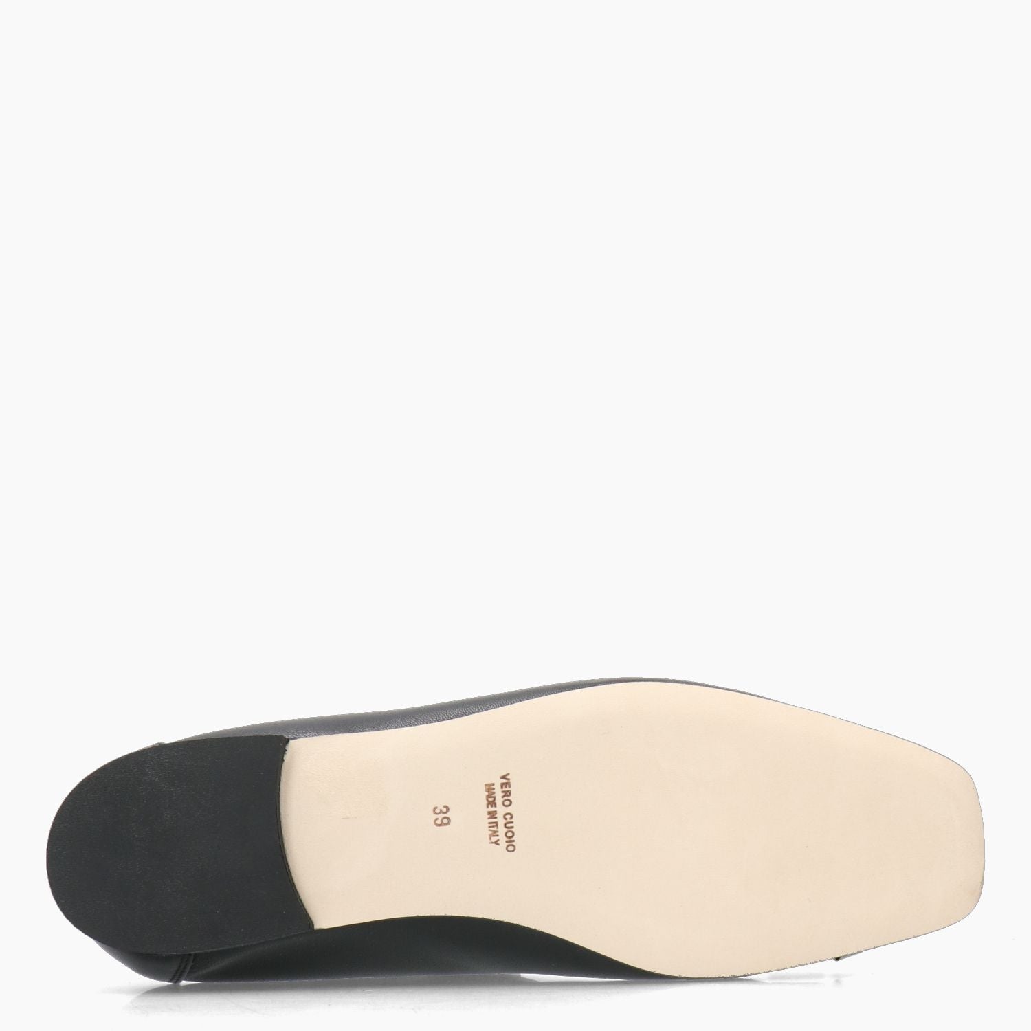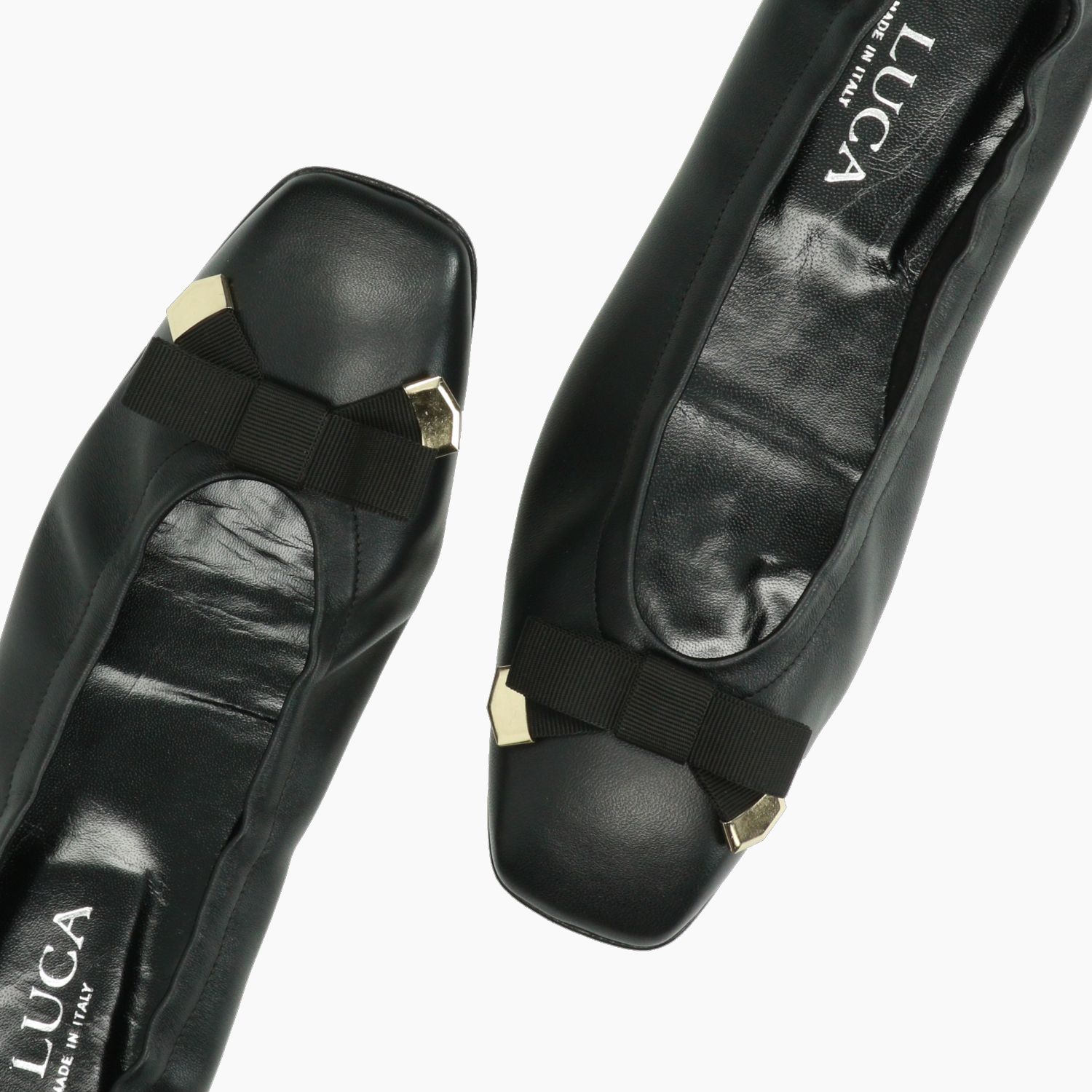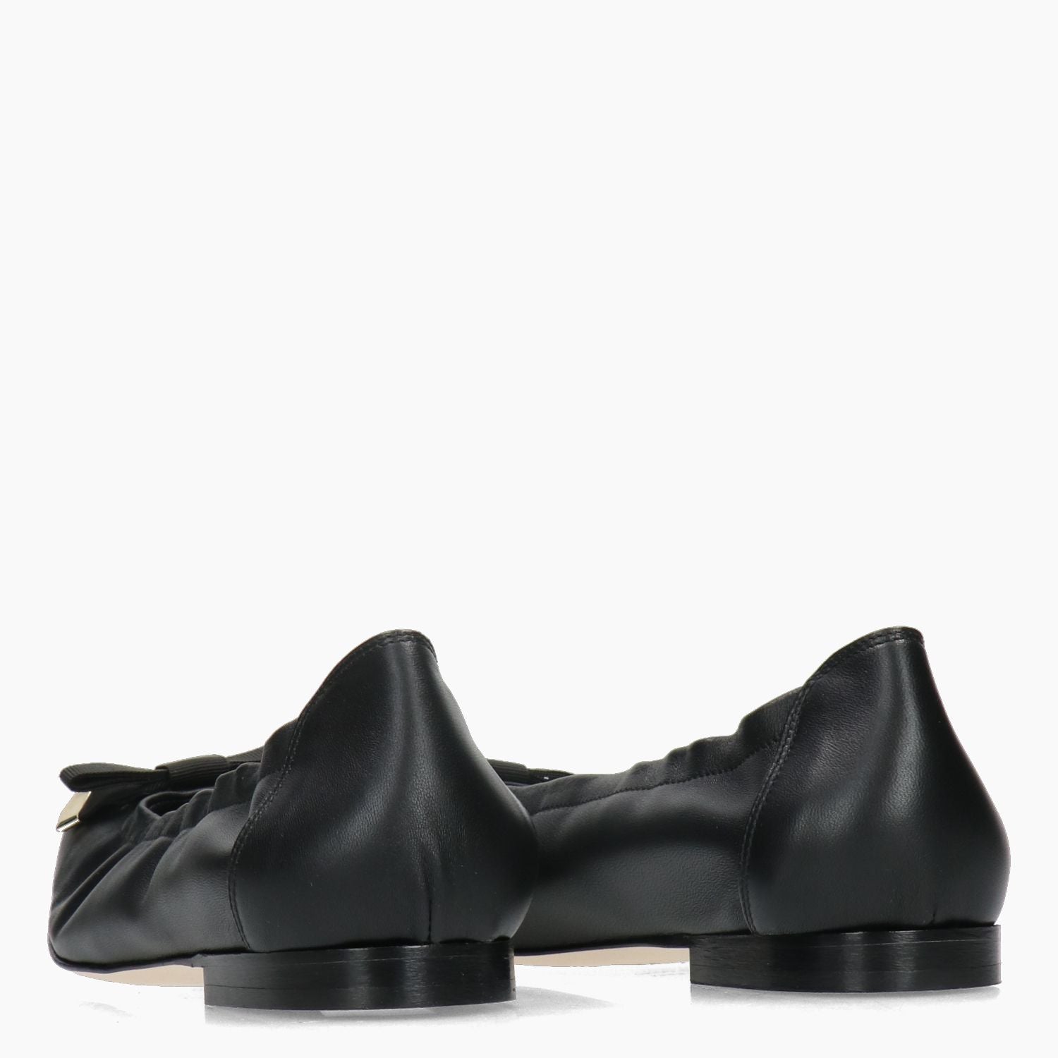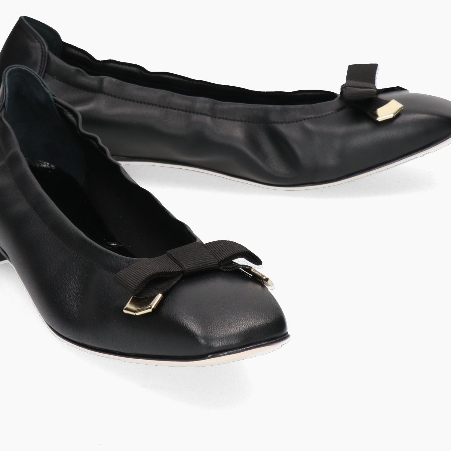 Black leather ballerina flat with black grosgrain bow. Elasticated sides for a better fit. Leather lining with non-removable insole. Square shape. Leather sole with 1 cm heel. G.Luca women's spring/summer collection.