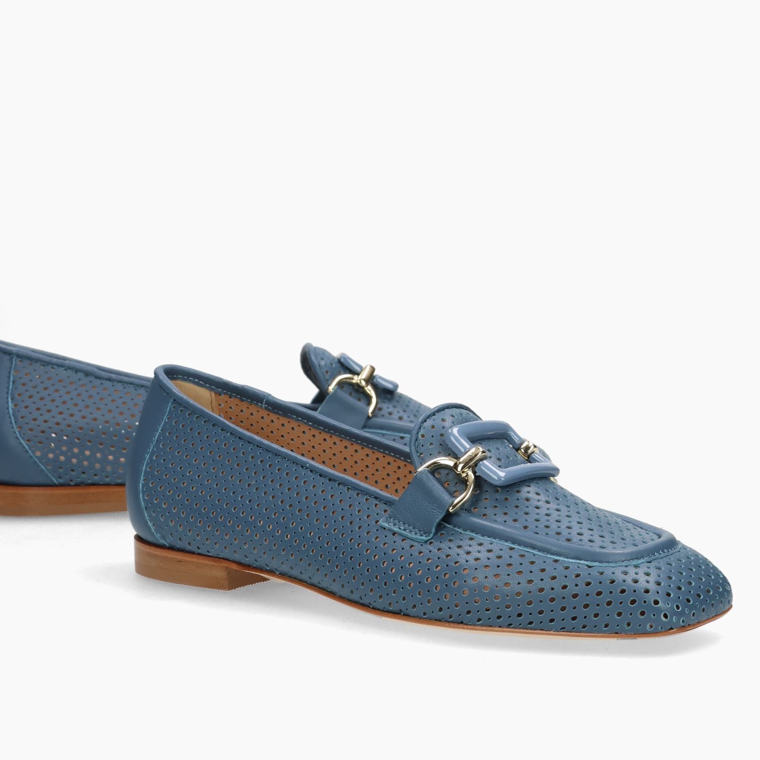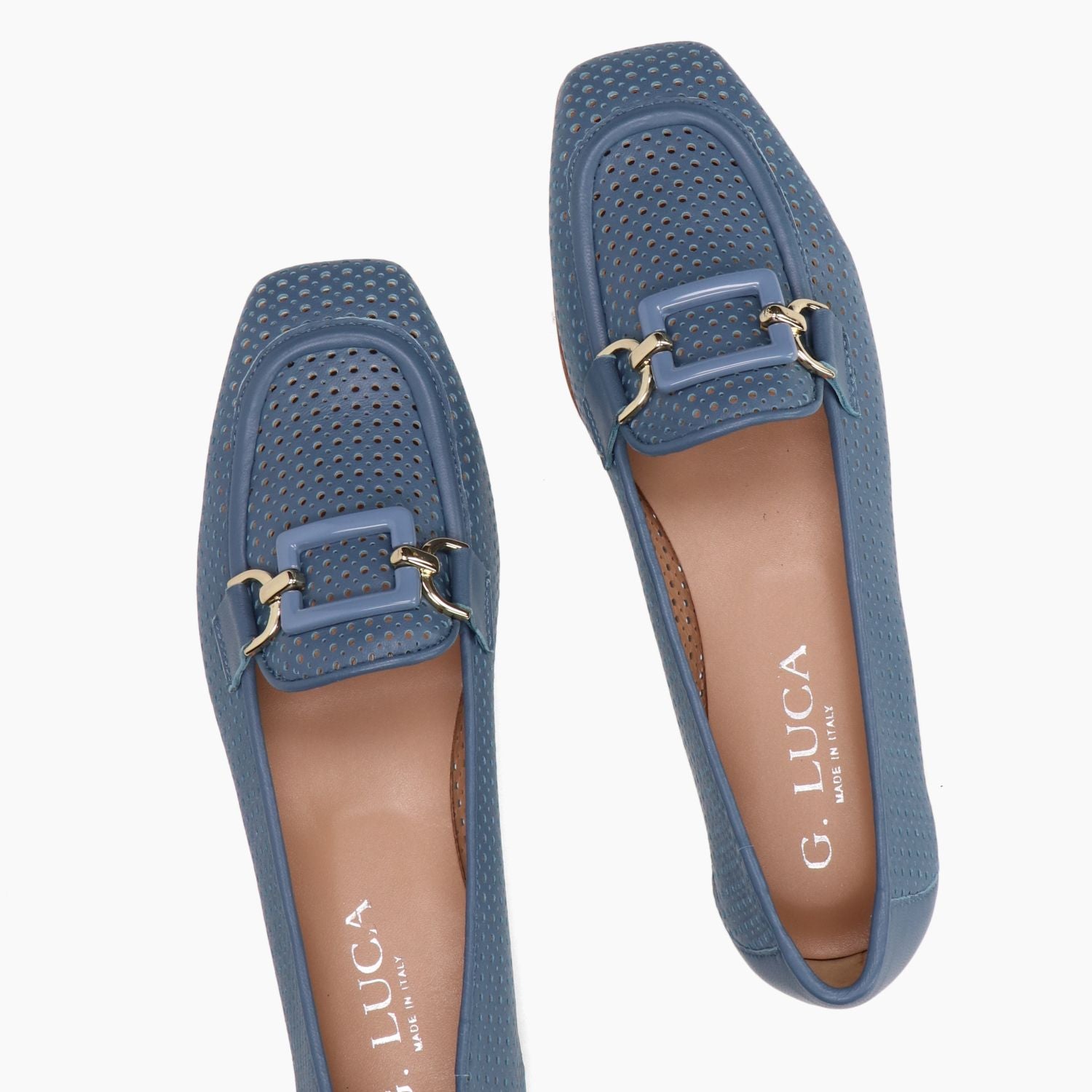 Perforated leather loafer in air force blue. Tone-on-tone and gold-tone enameled metal appliqué. Square toe. Leather lining. Leather sole with 1 cm heel. G.Luca women's Spring/Summer collection.