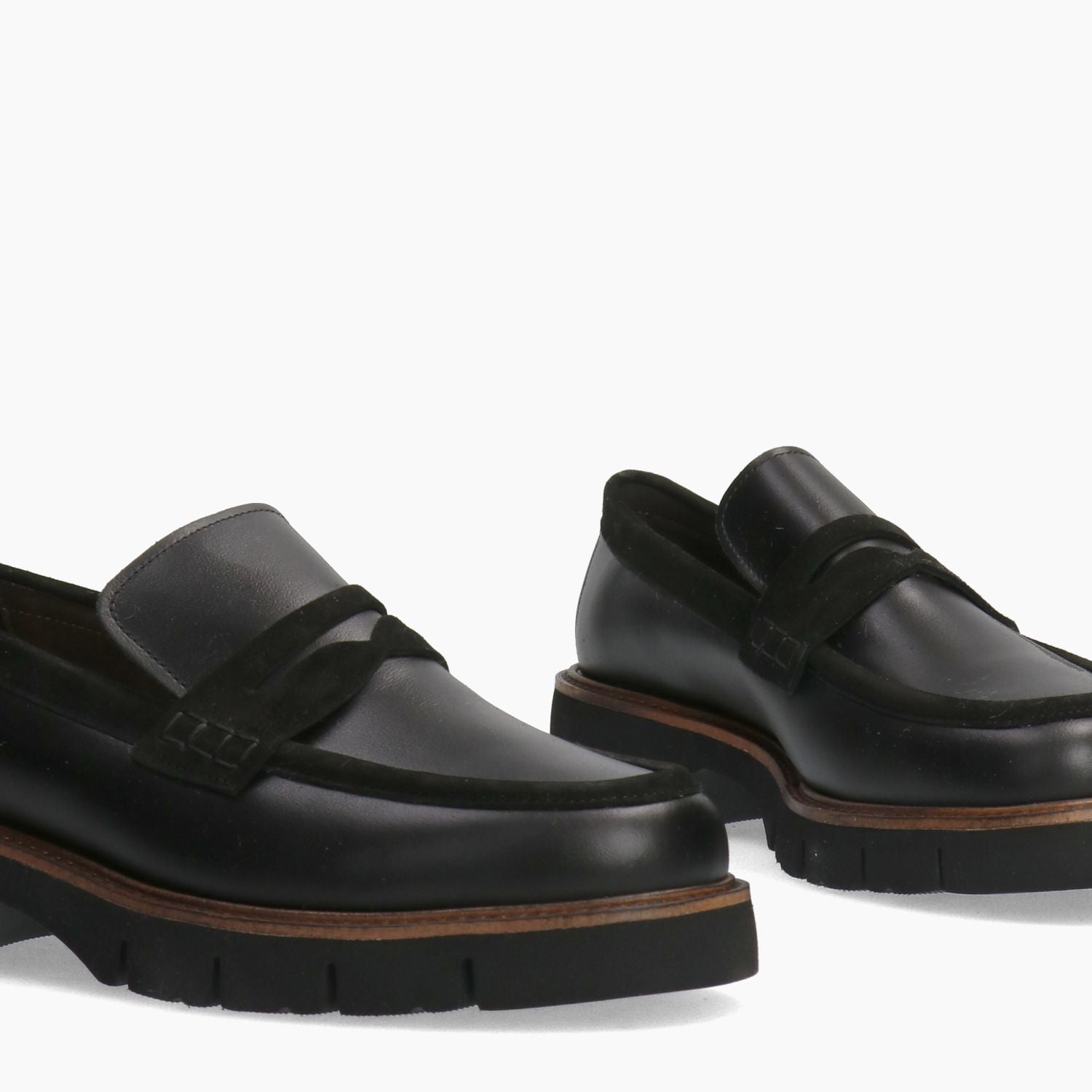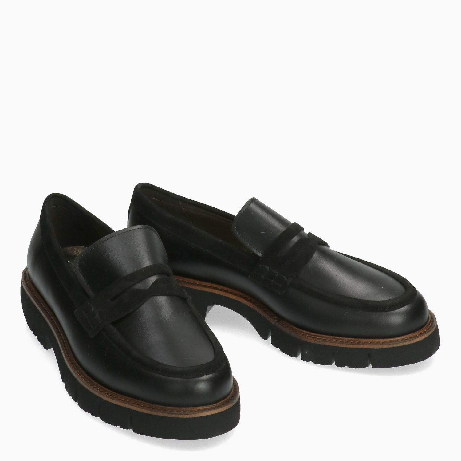 Black leather loafer with black suede trim and strap. Leather lining with non-removable insole. Lightweight microporous rubber sole with 3.5 cm heel. G.Luca women's fall/winter collection.