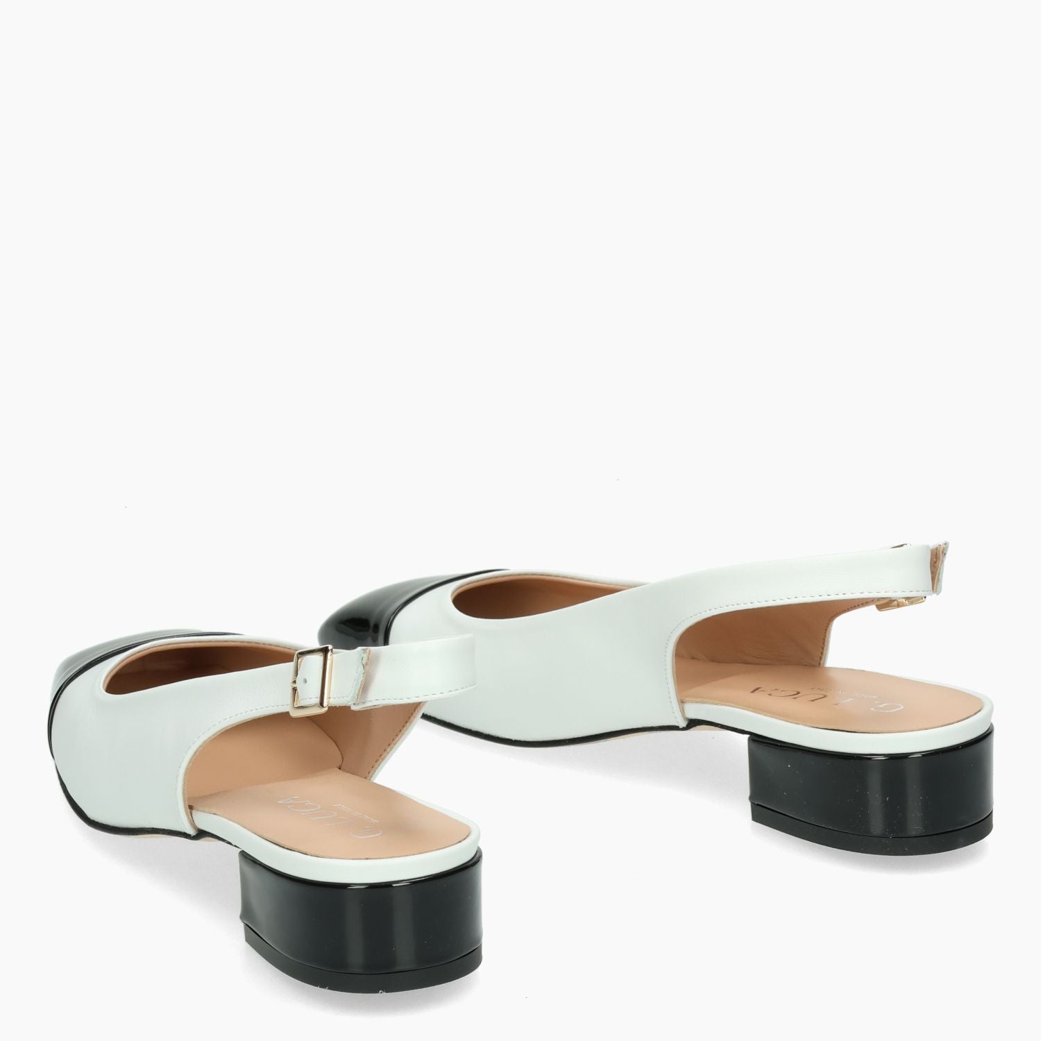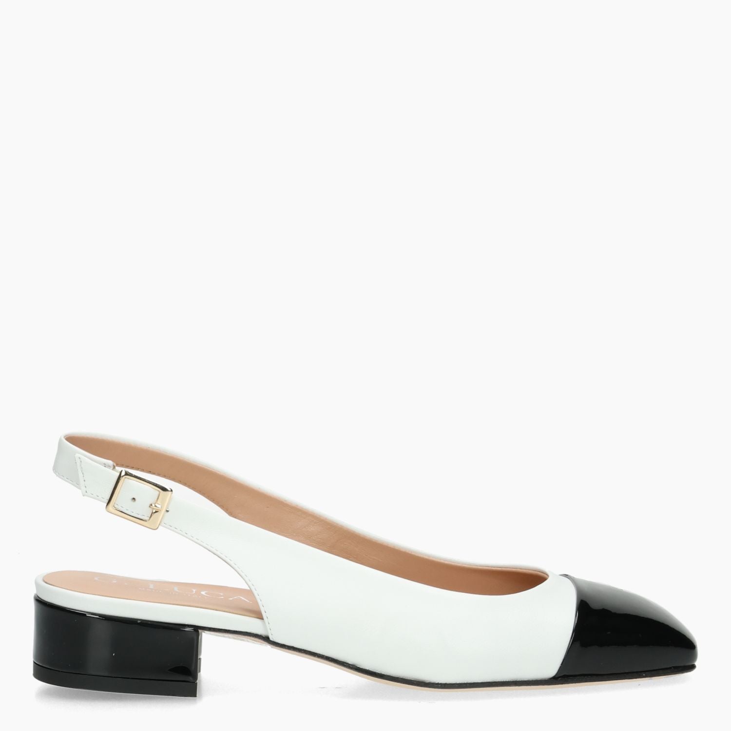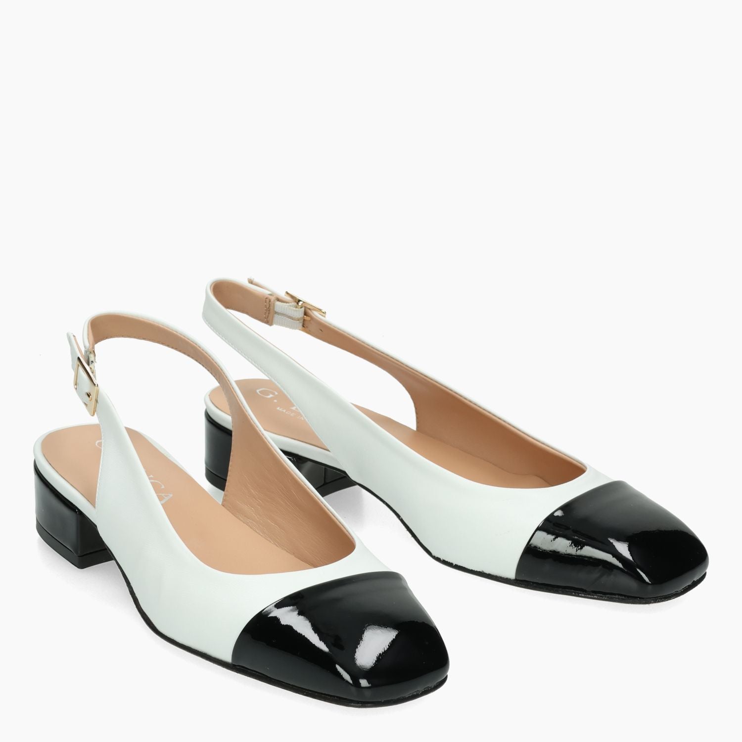 White leather Chanel pump with black patent leather toecap. Adjustable strap with gold buckle. Square toe. Leather lining. Leather sole with 3 cm heel. G.Luca women's Spring/Summer collection.