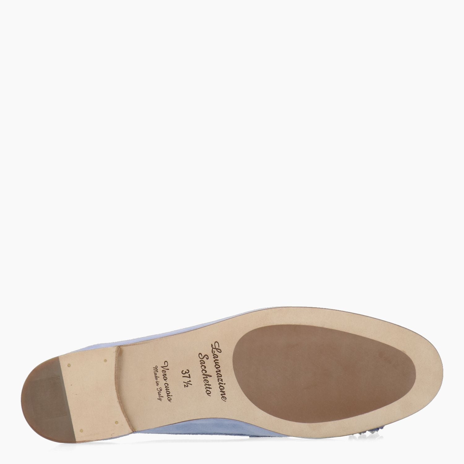 Lilac suede loafers with tassels. Leather lining with a slip-on finish. Leather and rubber sole with a 1 cm heel. Garlani women's Spring/Summer collection.