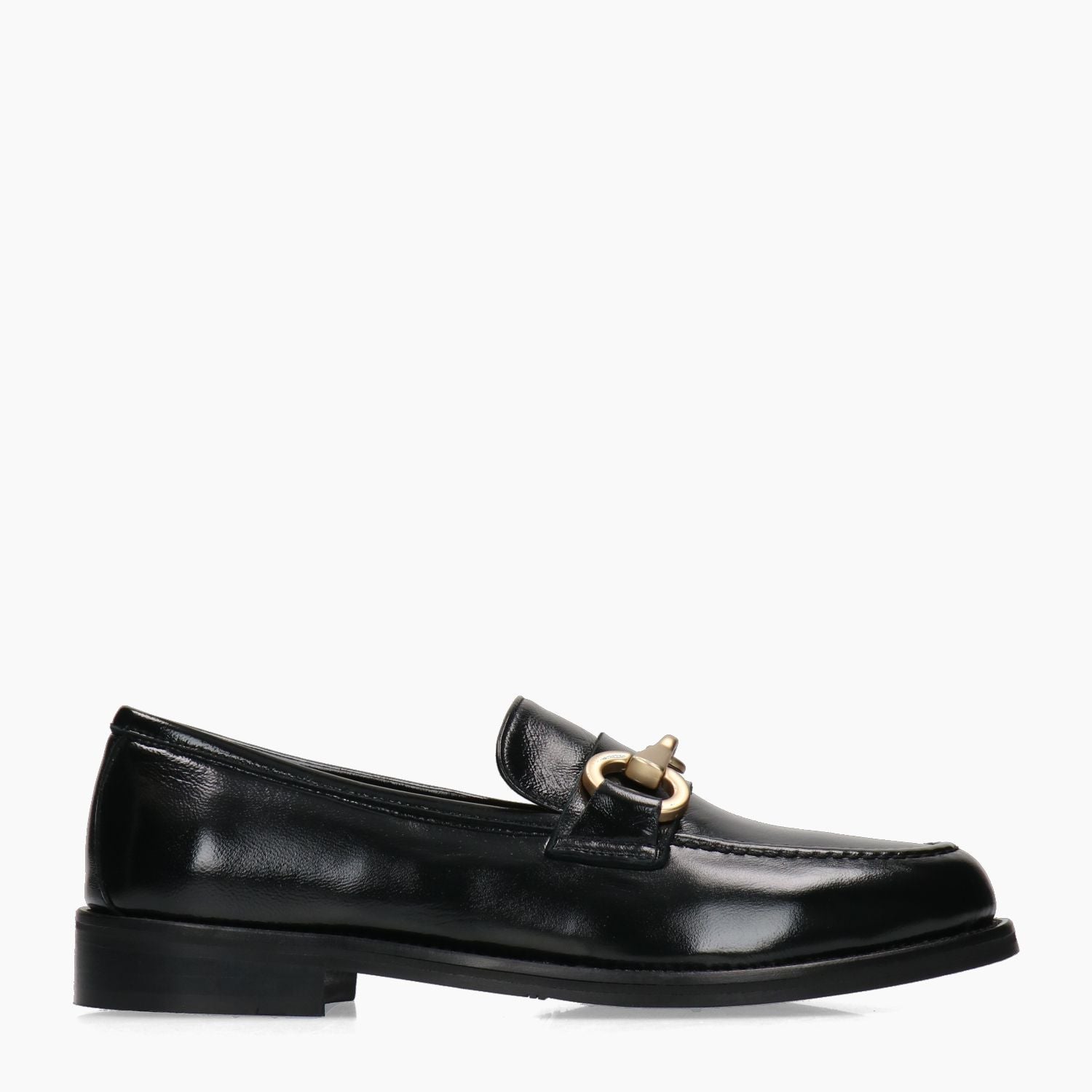 Moccasins with black patent leather upper and satin gold-tone buckle. Leather lining. Rubber slip-on sole. 2.5 cm heel. Garlani women's Fall/Winter collection.