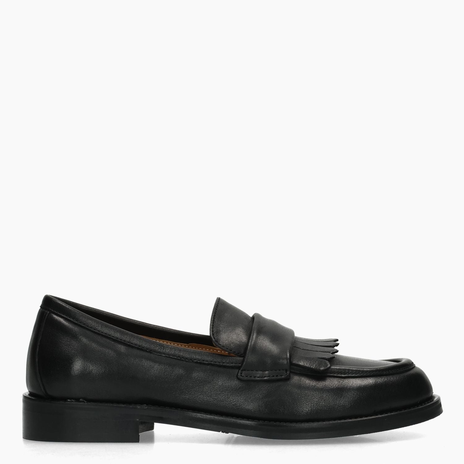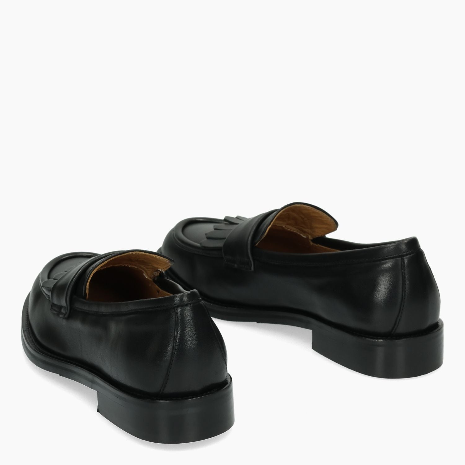Black leather loafers with fringe. Round toe. Leather lining. Rubber sole with slip-on construction. 1.5 cm heel. Garlani women's Fall/Winter collection.