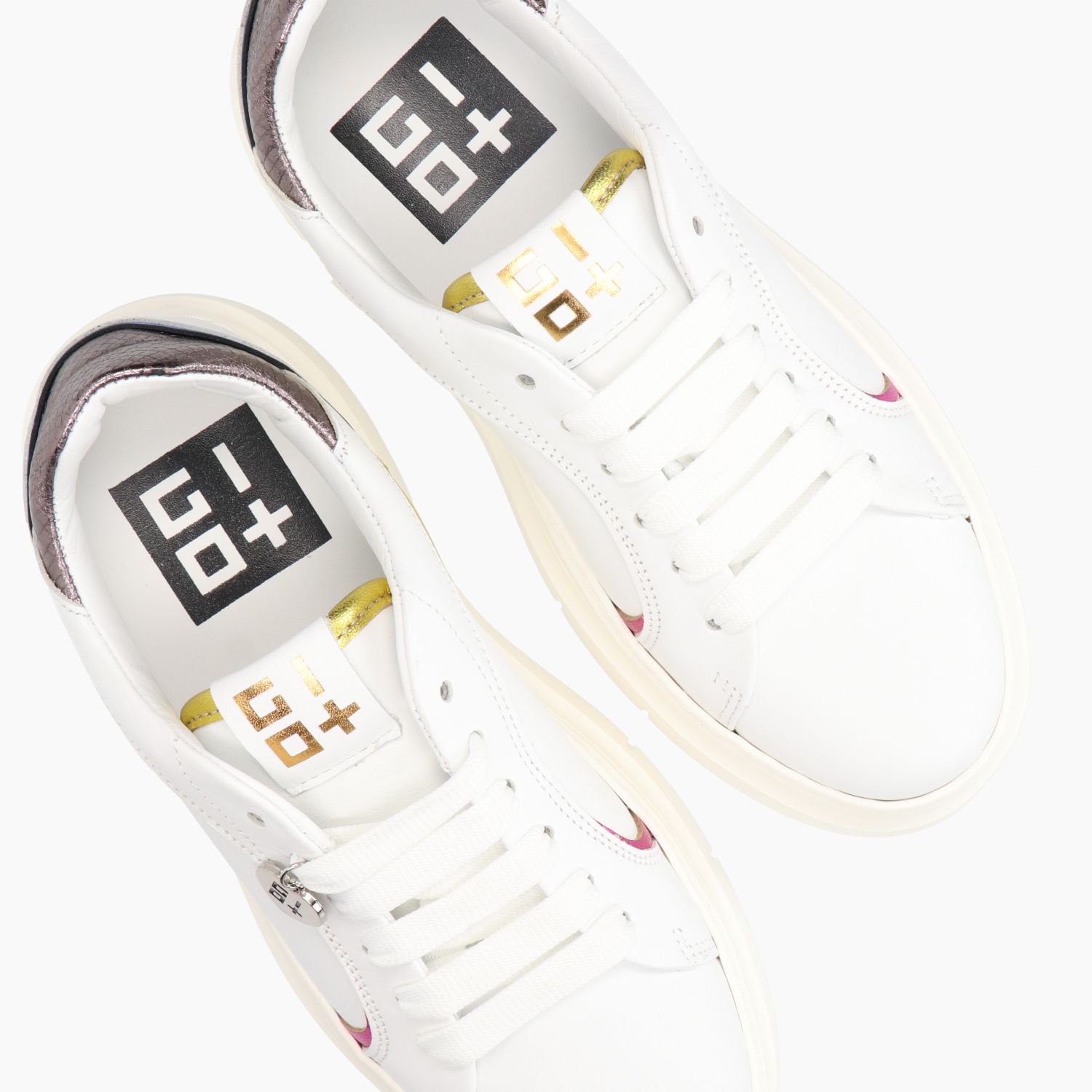 Gio+ sneakers with white leather upper. Cotton laces and logo tag. Gunmetal laminated leather heel tab. Leather and fabric lining with removable insole. Rubber sole with 4 cm platform. Women's Gio+ collection.