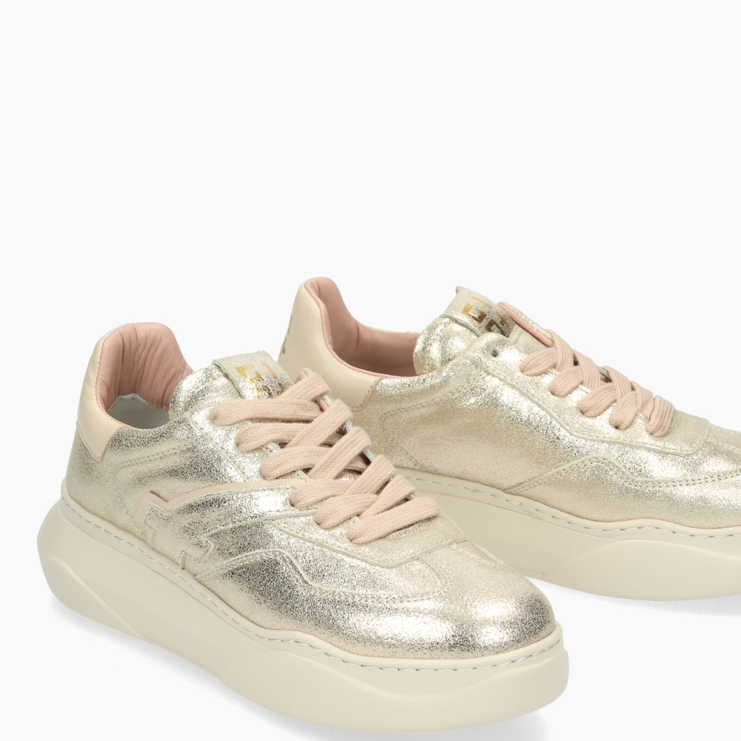 Gio+ sneakers with gold-tone laminated leather upper. Powder pink cotton laces. Beige leather heel tab with logo. Leather and fabric lining with removable insole. 4 cm rubber sole. Women's Gio+ collection.