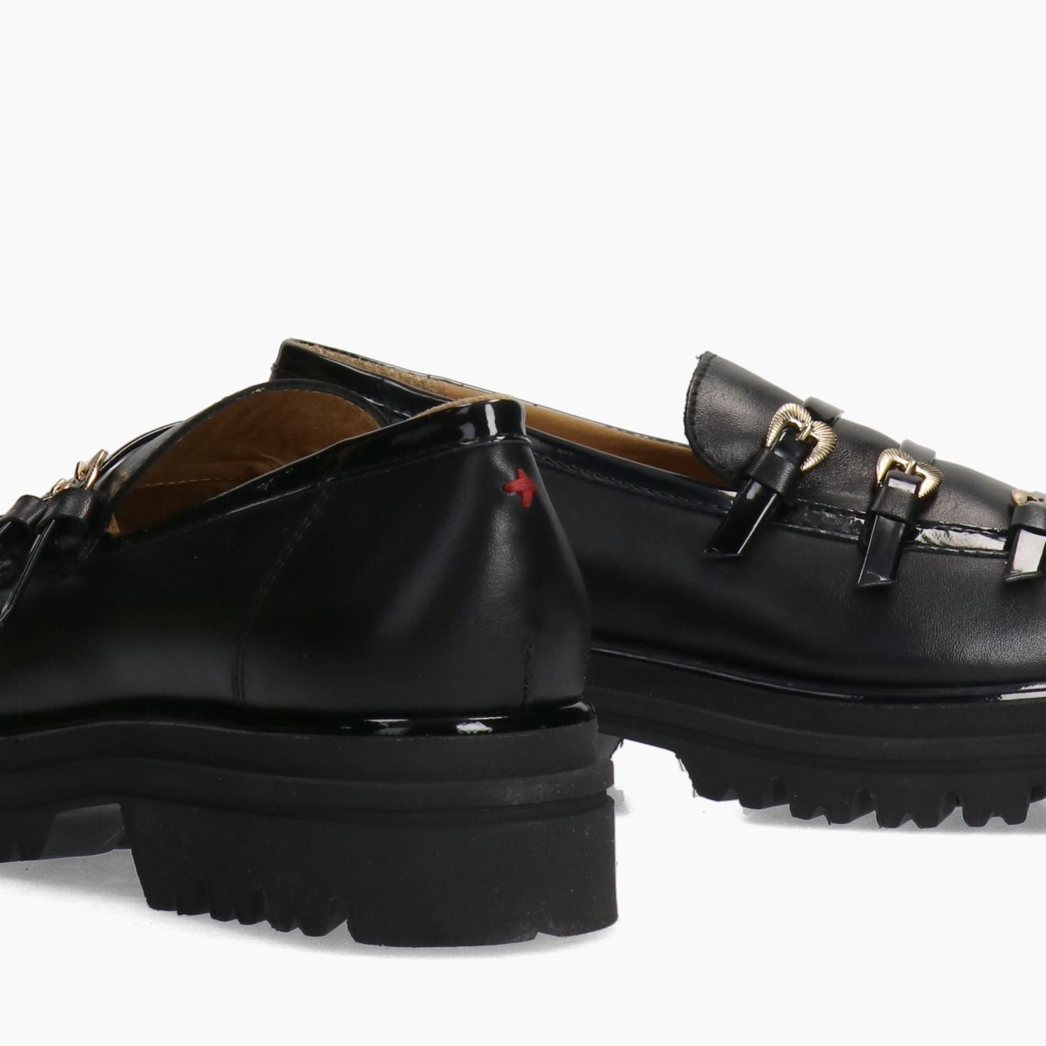 Black leather loafer with black patent leather trim and straps. Gold-tone heart-shaped buckles. Microporous rubber lug sole. 4 cm heel. From the Gio+ women's fall/winter collection.