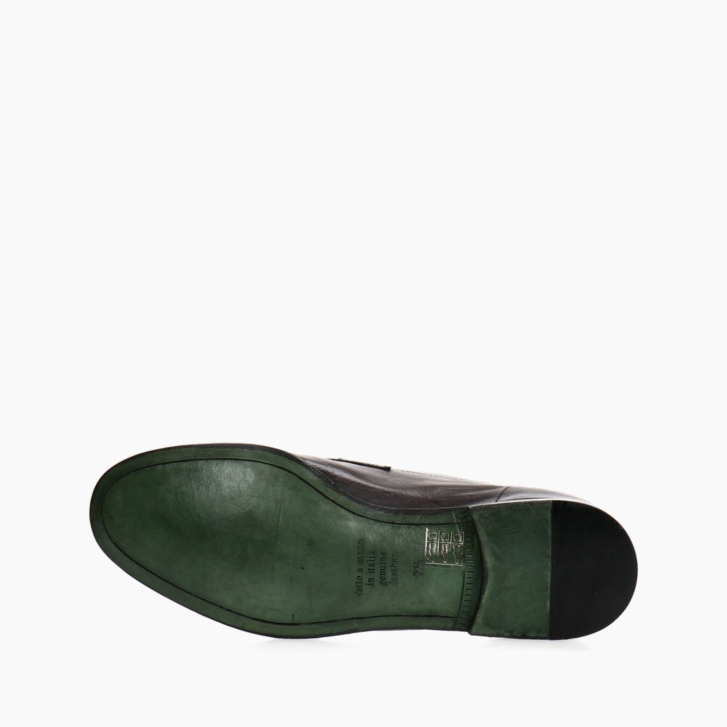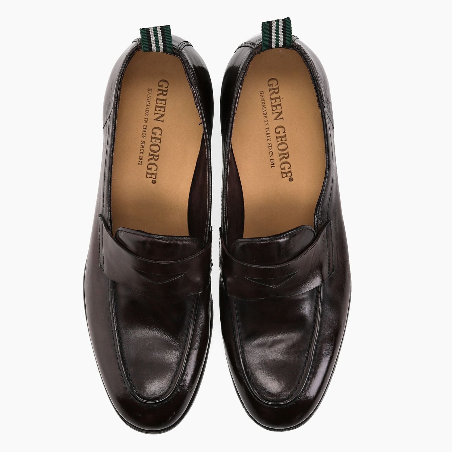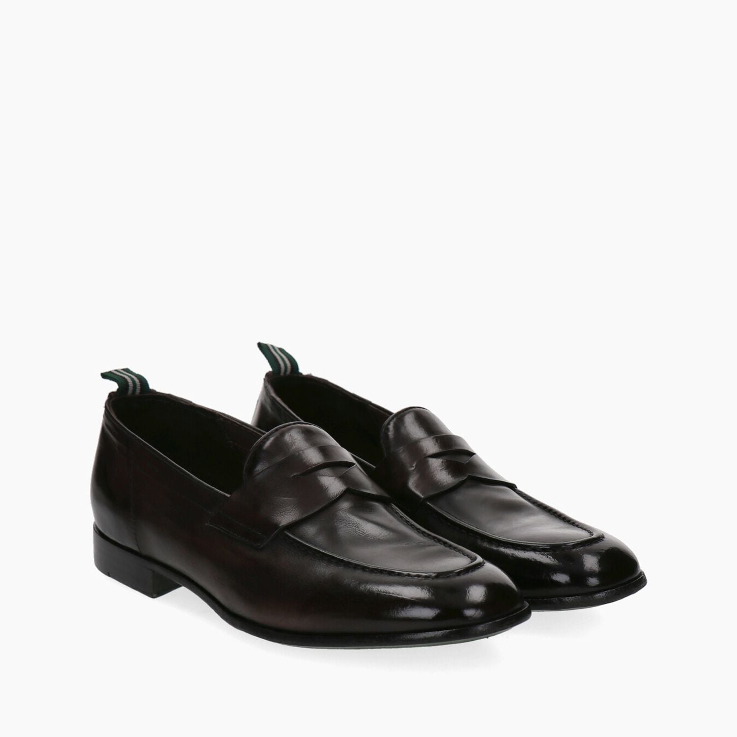Brown aged leather loafers, 25 cm heel, stitched leather sole.