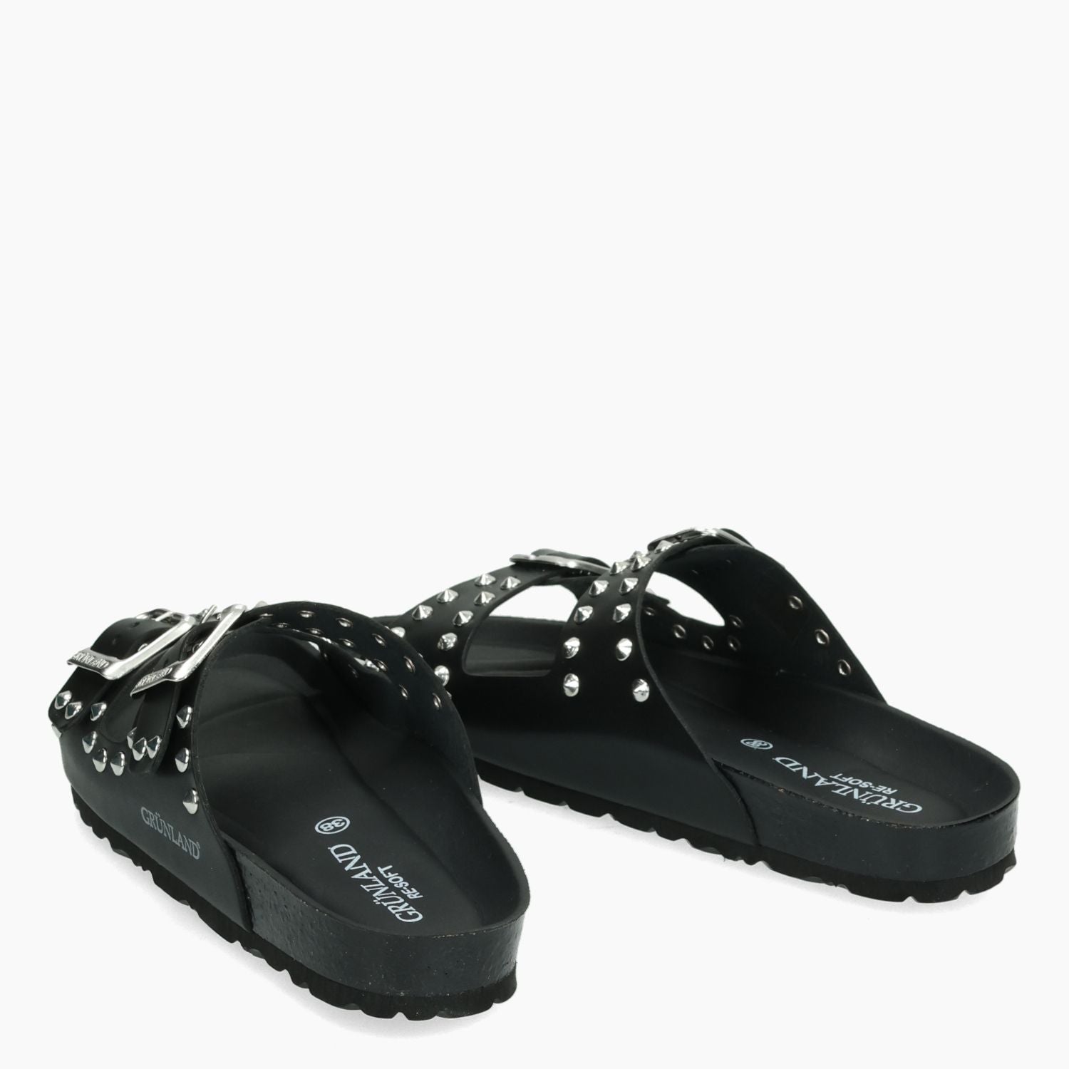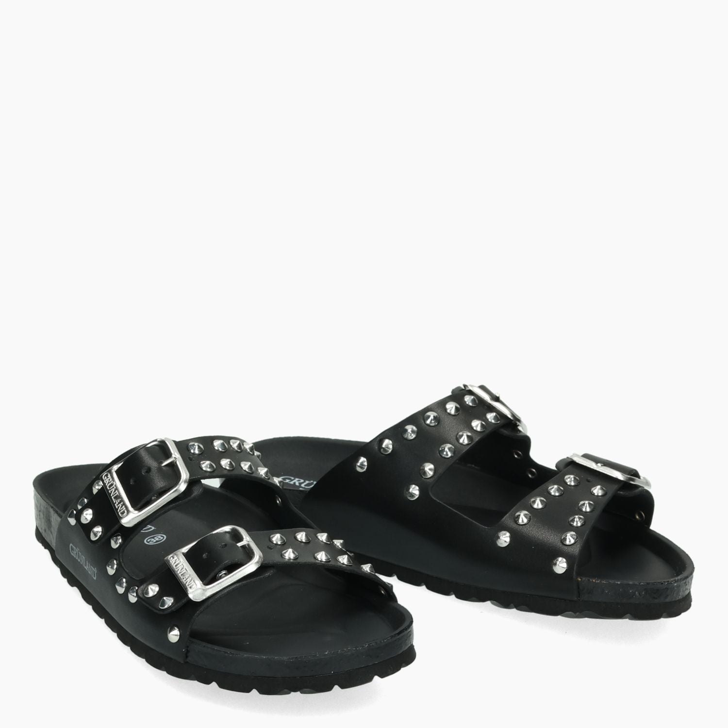 Grunland slipper with black faux leather upper and silver studs. Adjustable double buckle closure. Resoft anatomical insole. Rubber sole. Grunland women's Spring/Summer collection.