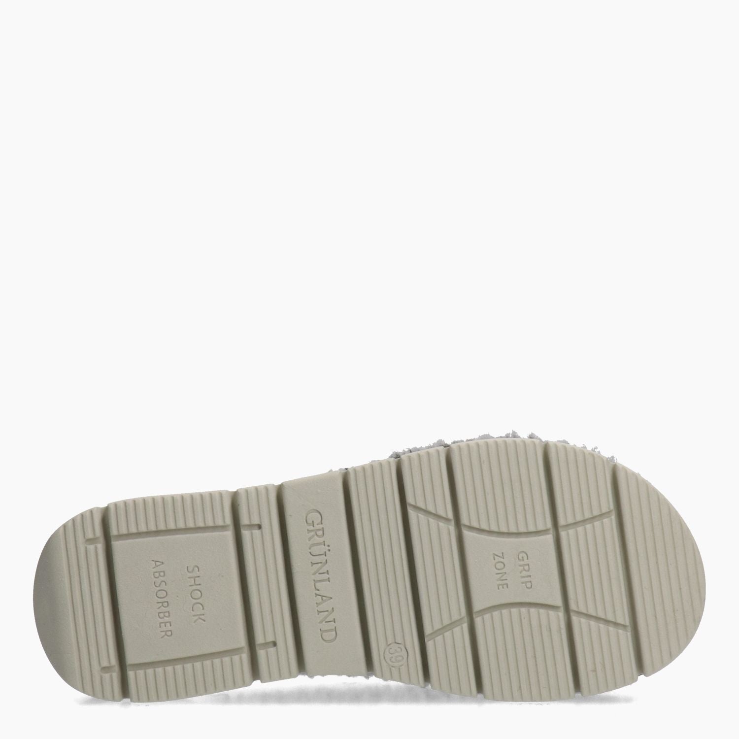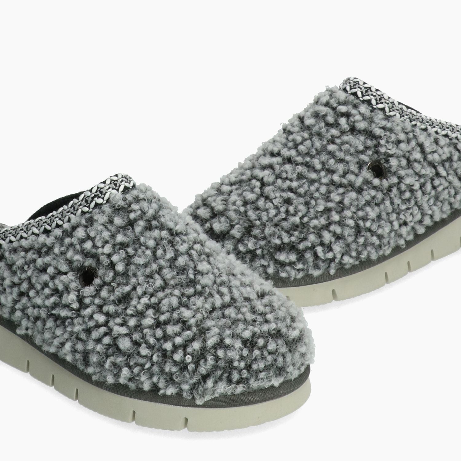 Grunland clog with gray curly wool upper. Gold logo stud. Fabric lining. Rubber sole. Grunland women's Fall/Winter collection.