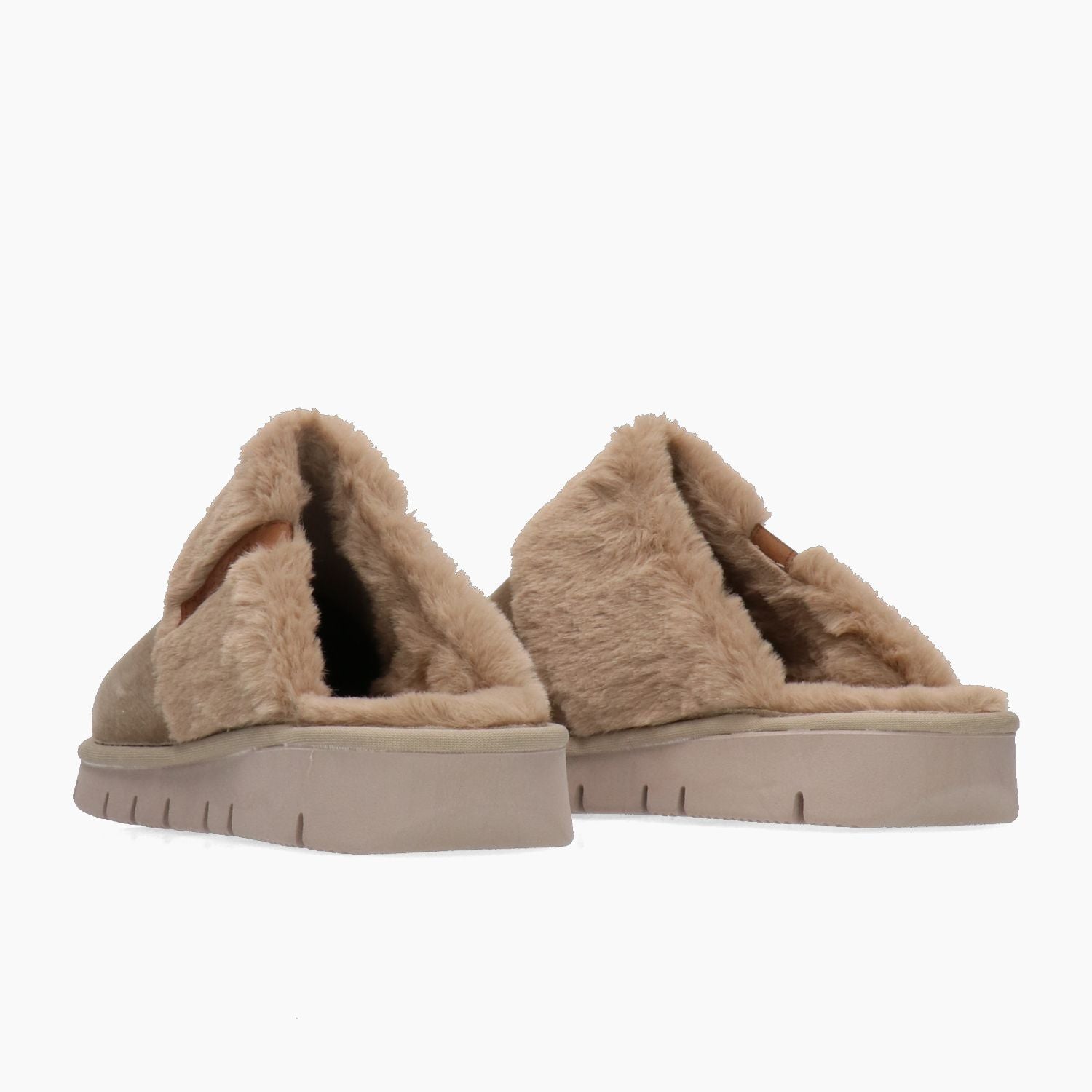 Grunland clogs with beige velvet upper. Round toe. Faux fur trim with logo. Faux fur lining. Rubber sole. Grunland women's Fall/Winter collection.