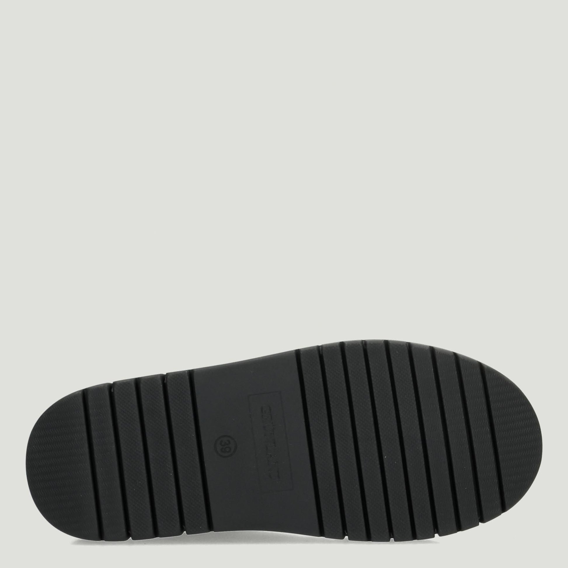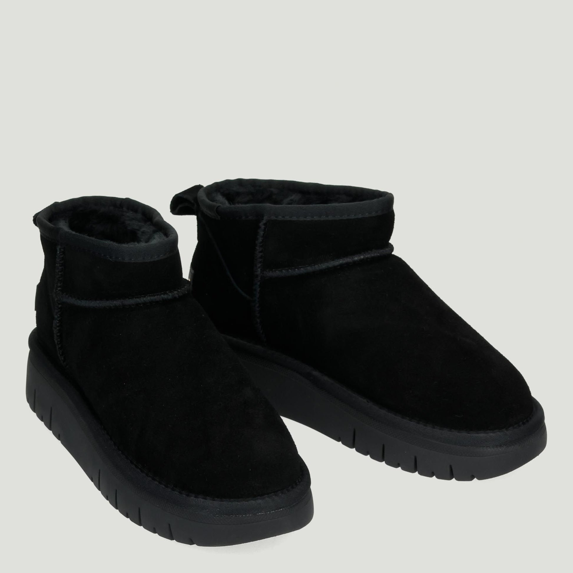 Black suede ankle boot. Leather logo on the heel. Faux fur lining. 4 cm platform rubber sole. Grunland women's Fall/Winter collection.