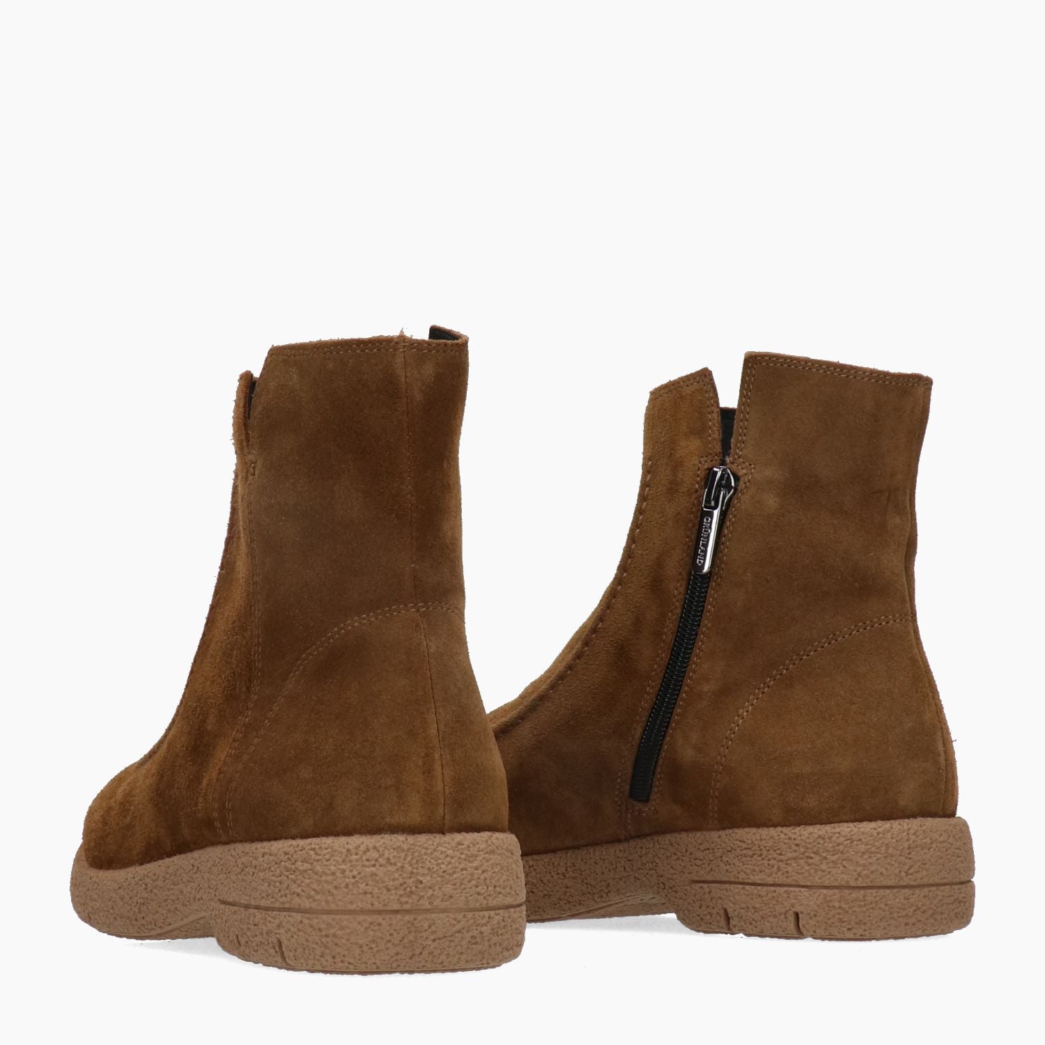 Grunland ankle boot with tan suede upper. Internal zip closure. Leather and fabric lining with removable insole. Rubber sole. Grunland women's Fall/Winter collection.