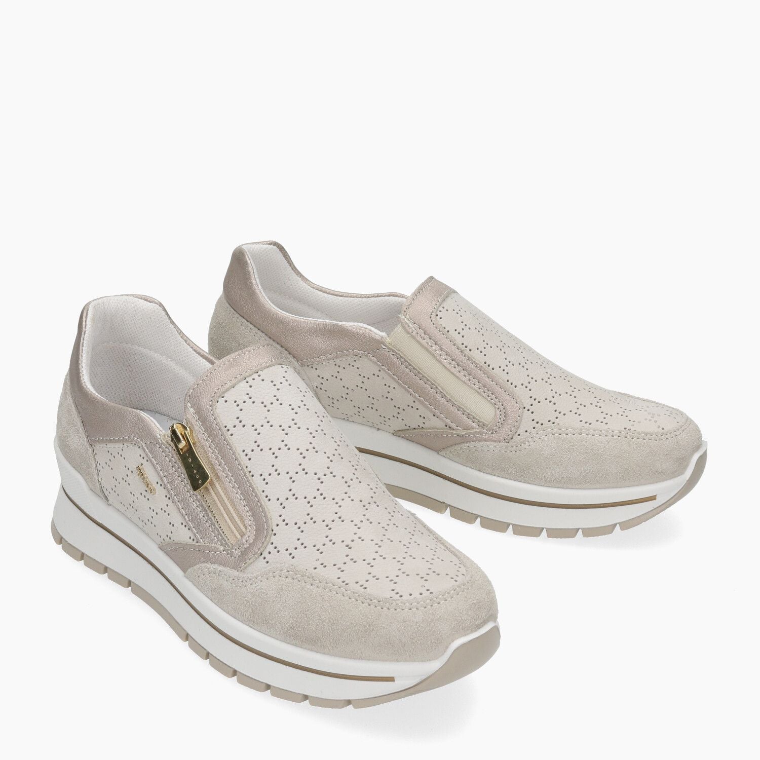 Igi&Co sneakers with perforated leather upper. Round toe. Side zip. Removable genuine leather insole with memory foam. Lugged rubber sole. 5 cm sole. Igi&Co women's Spring/Summer collection.