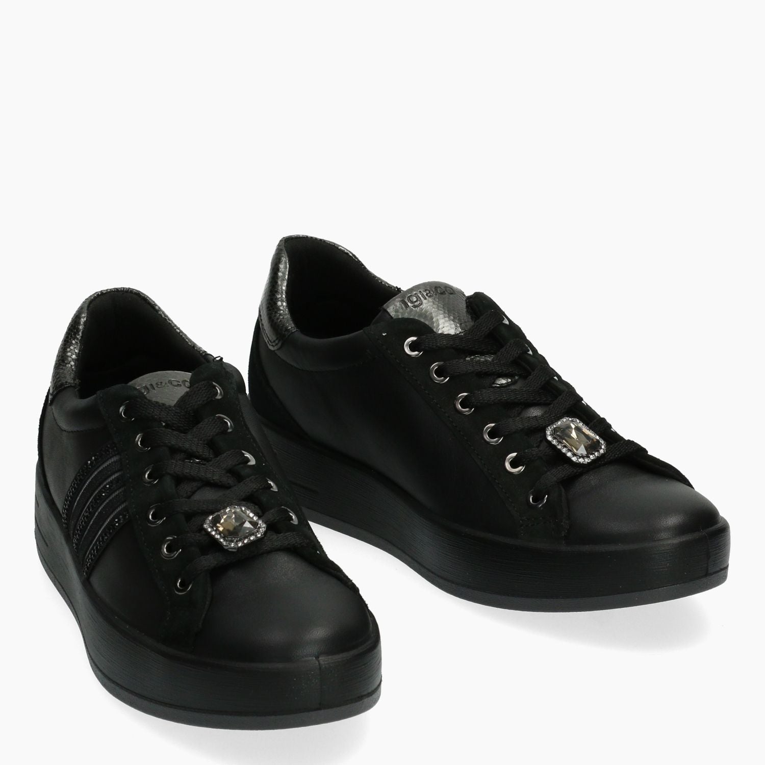 Igi&Co sneakers with black leather upper. Black rhinestone side stripe. Lace-up closure. Logo tongue. Removable genuine leather insole. 4 cm rubber sole. Igi&Co women's fall/winter collection.
