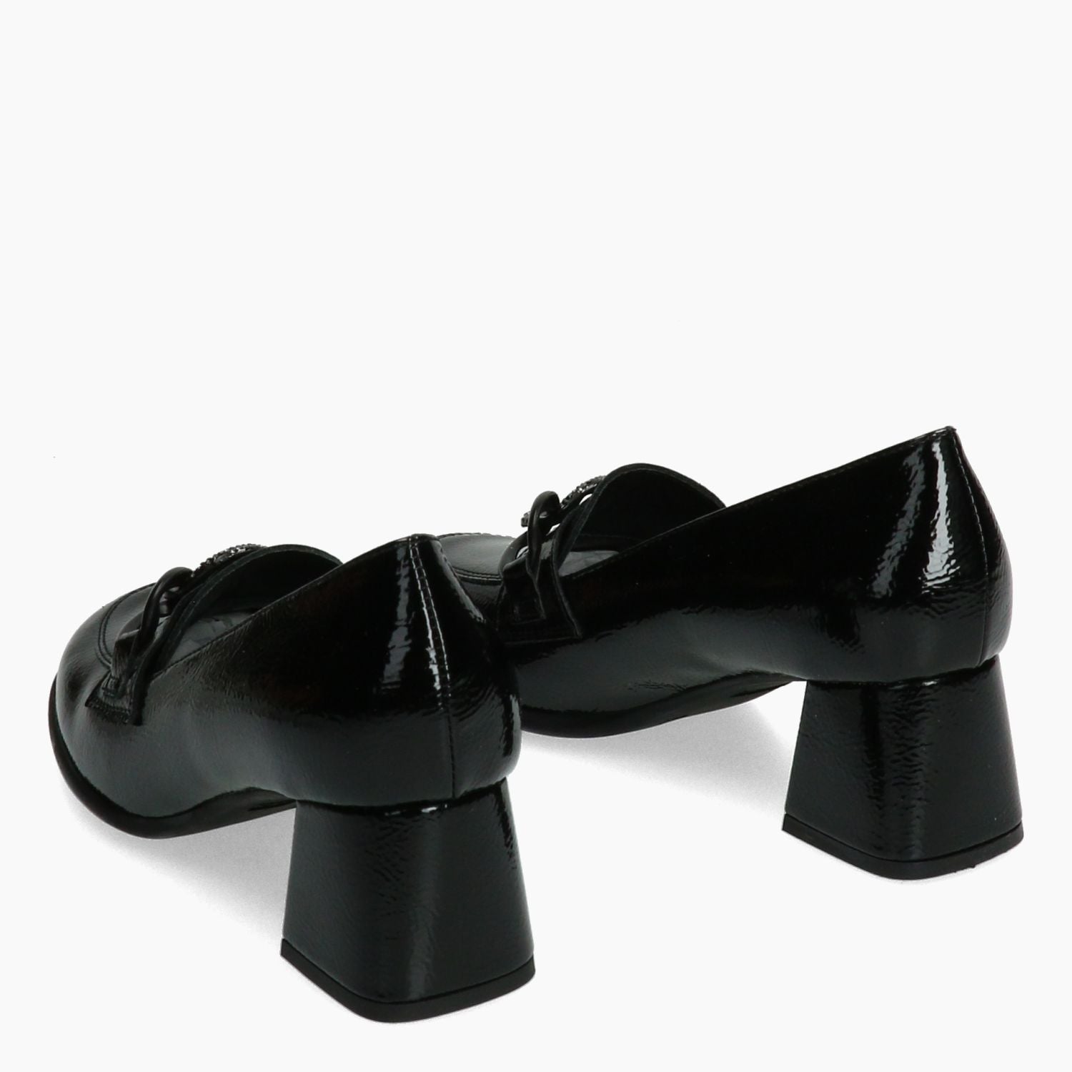 Black patent faux leather loafer with chain clip. Leather lining with non-removable insole. Rubber sole with 5 cm heel. Igi & Co women's Fall/Winter collection.