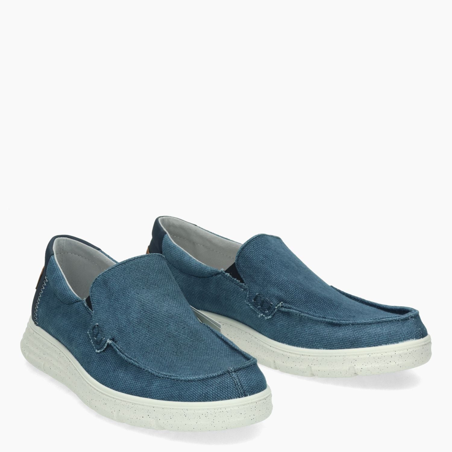 Slip-on sneakers with a faded blue canvas upper. Tag on the heel. Leather and fabric lining. Removable memory foam insole. Rubber sole. Igi&Co men's Spring/Summer collection.