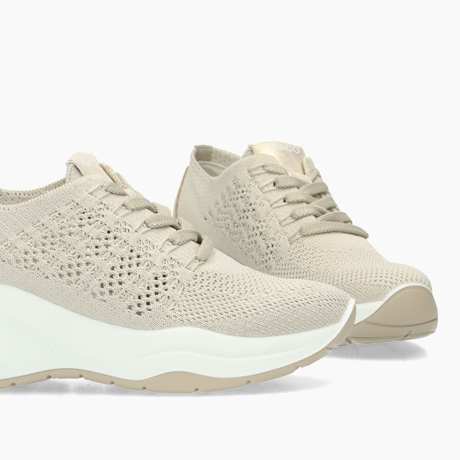 Gold sneakers with beige perforated fabric upper. Beige suede heel. Leather and fabric lining. Removable insole. Rubber sole with 5 cm wedge. Igi&Co women's Spring/Summer collection.