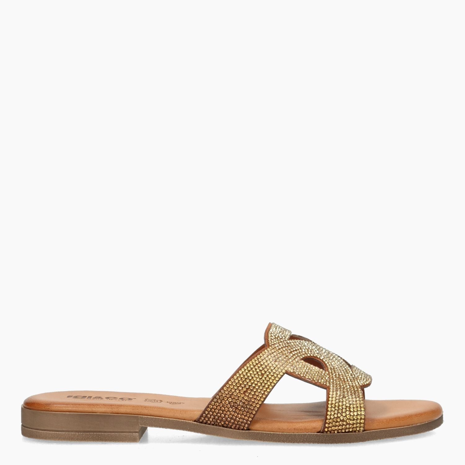 Slipper with gold rhinestone upper. Tan leather and fabric lining with padded insole. Rubber sole with 2 cm heel. Igi&Co women's Spring/Summer collection.