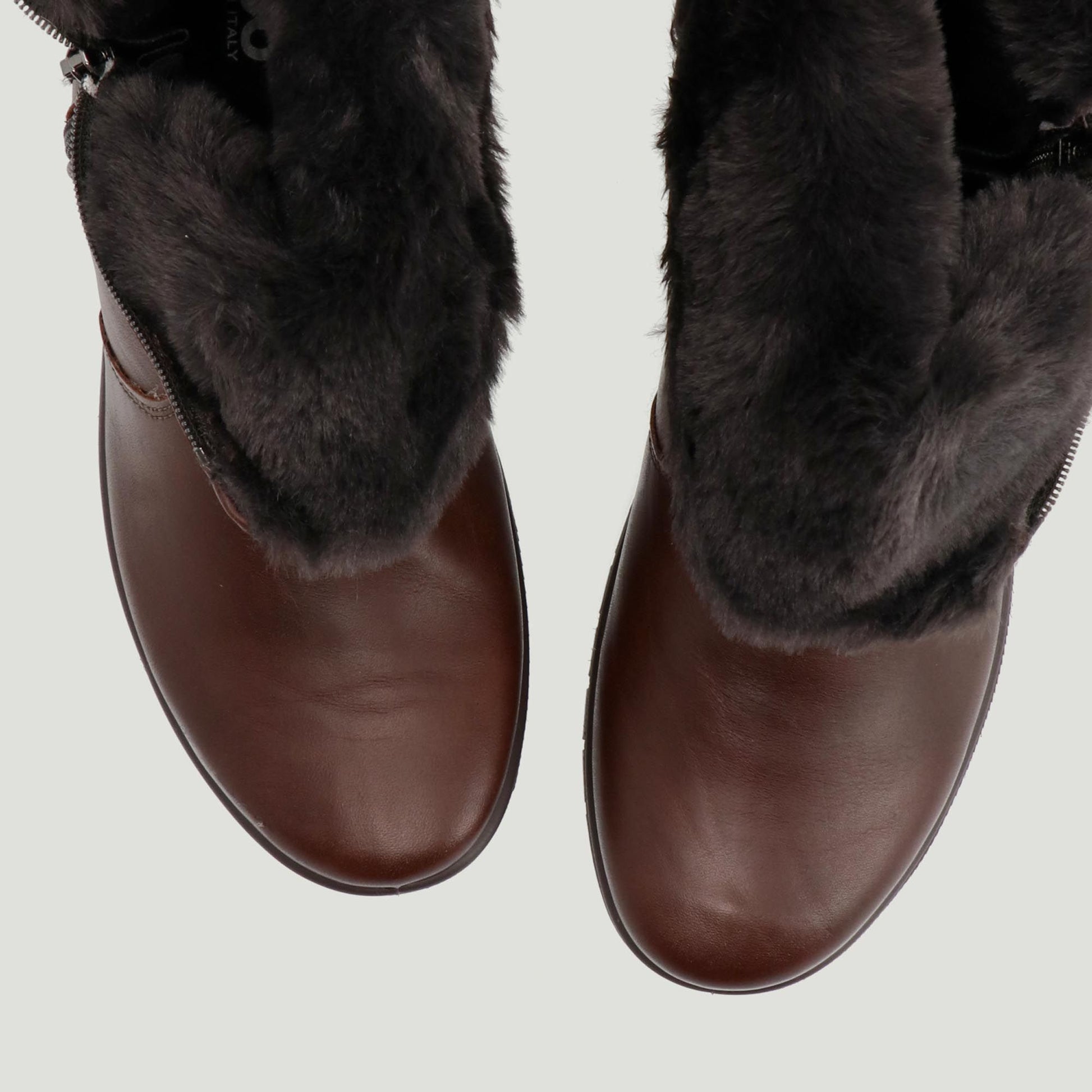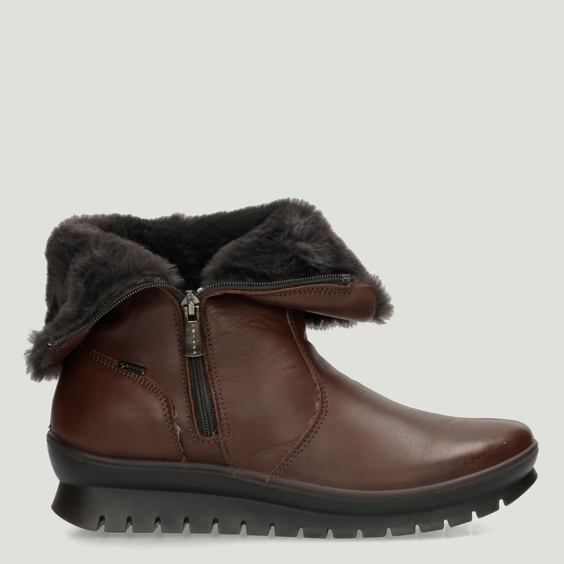Brown leather ankle boot. External side zip closure. Faux fur trim. Lining with Gore-Tex membrane and warm fabric. Removable insole. Black rubber sole. 4 cm wedge. Igi&Co women's Fall/Winter collection.
