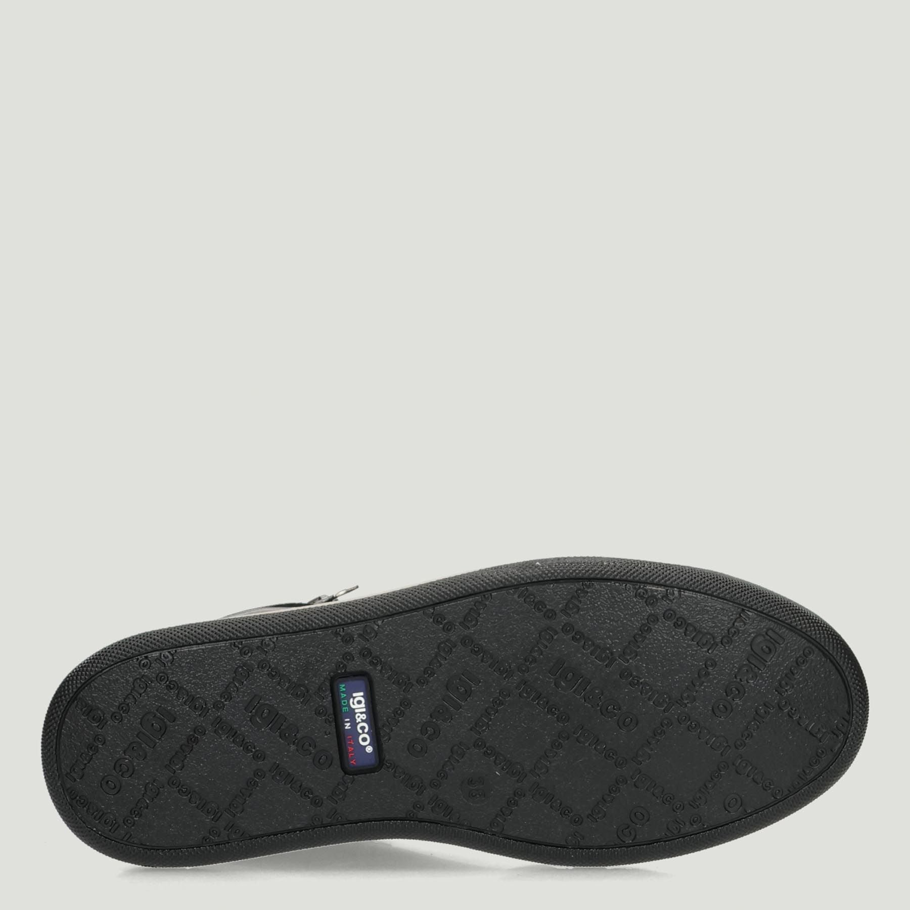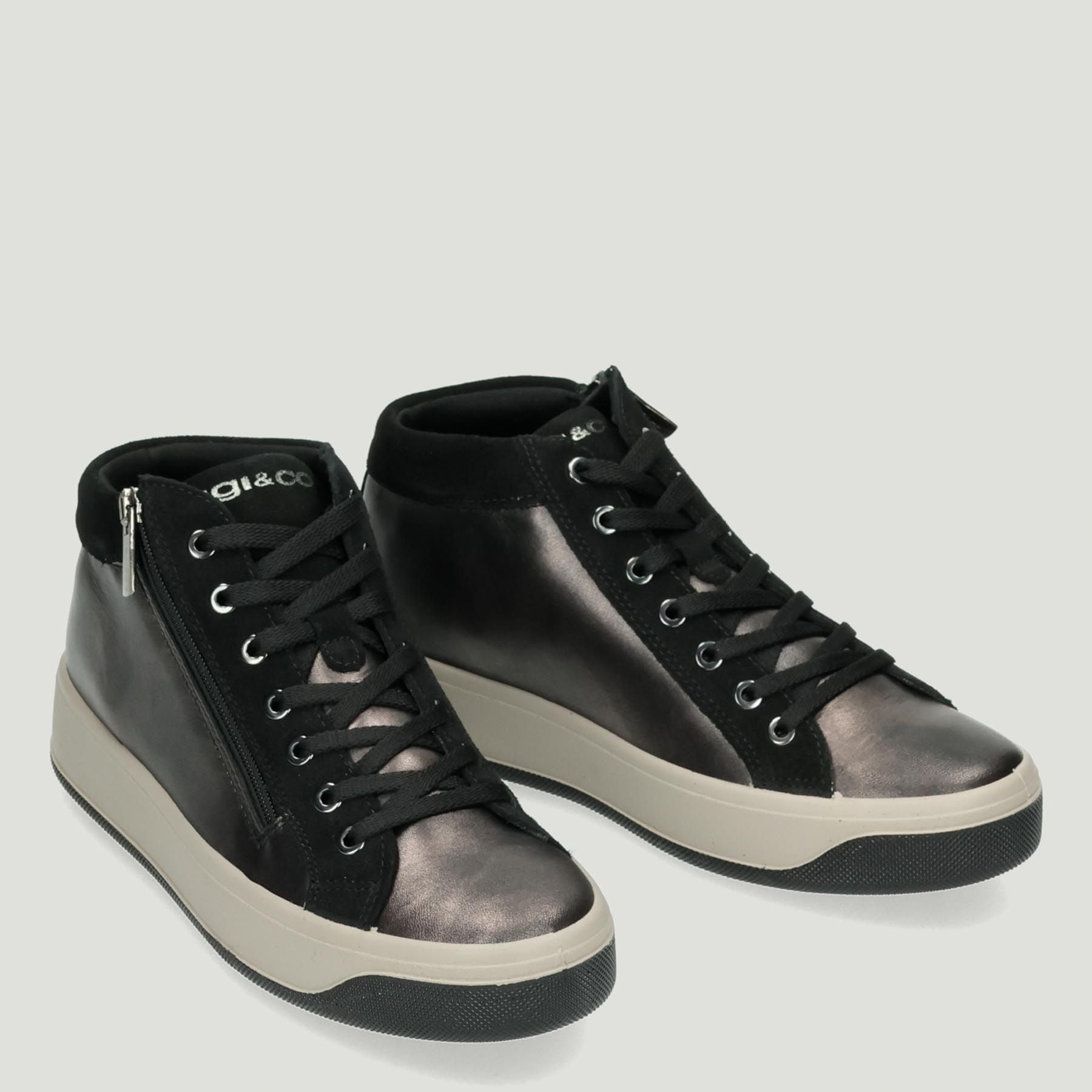 High-top sneakers with a gray laminated leather upper and black suede inserts. Lace-up and side zip closure. Fabric lining with removable leather insole. 4 cm rubber sole. Igi&Co women's Fall/Winter collection.