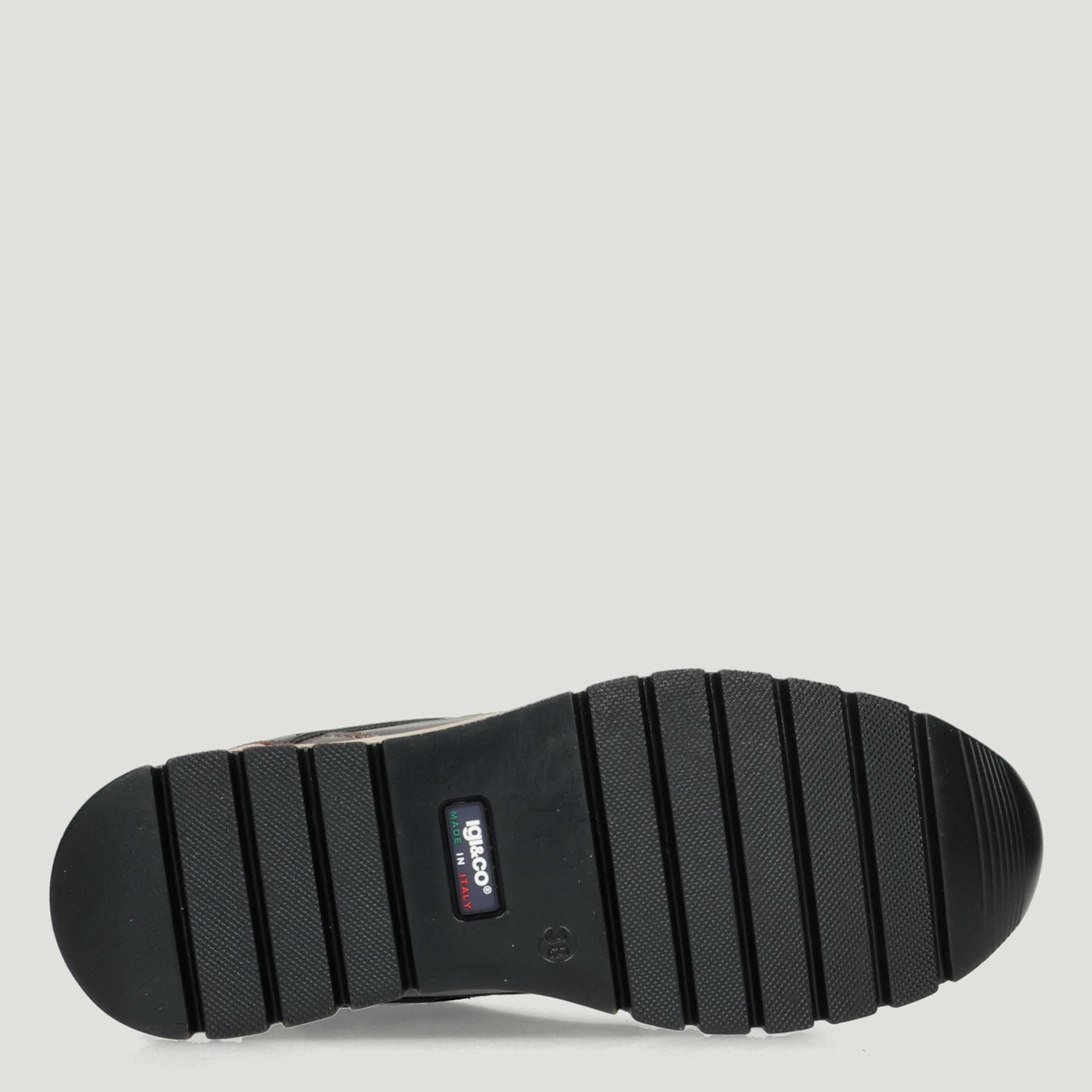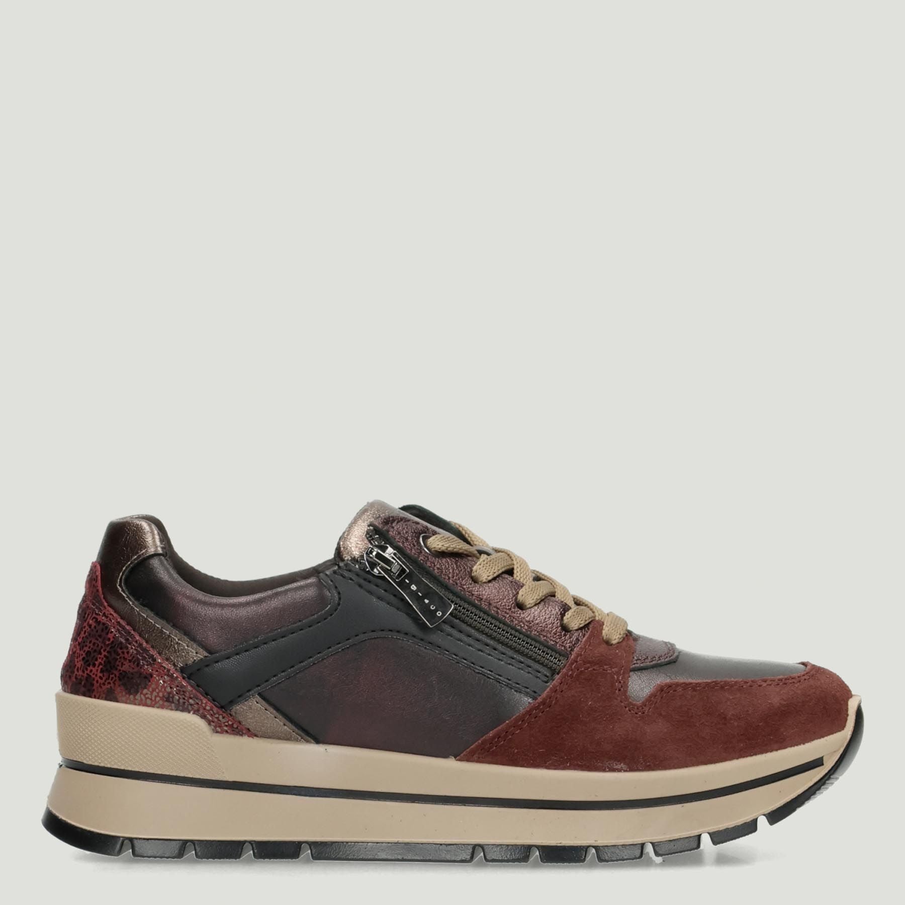 Sneakers with burgundy laminated leather upper and burgundy suede inserts. Side zip closure. Fabric lining with removable leather Memory Foam insole. 4 cm rubber sole. Igi&Co women's Fall/Winter collection.