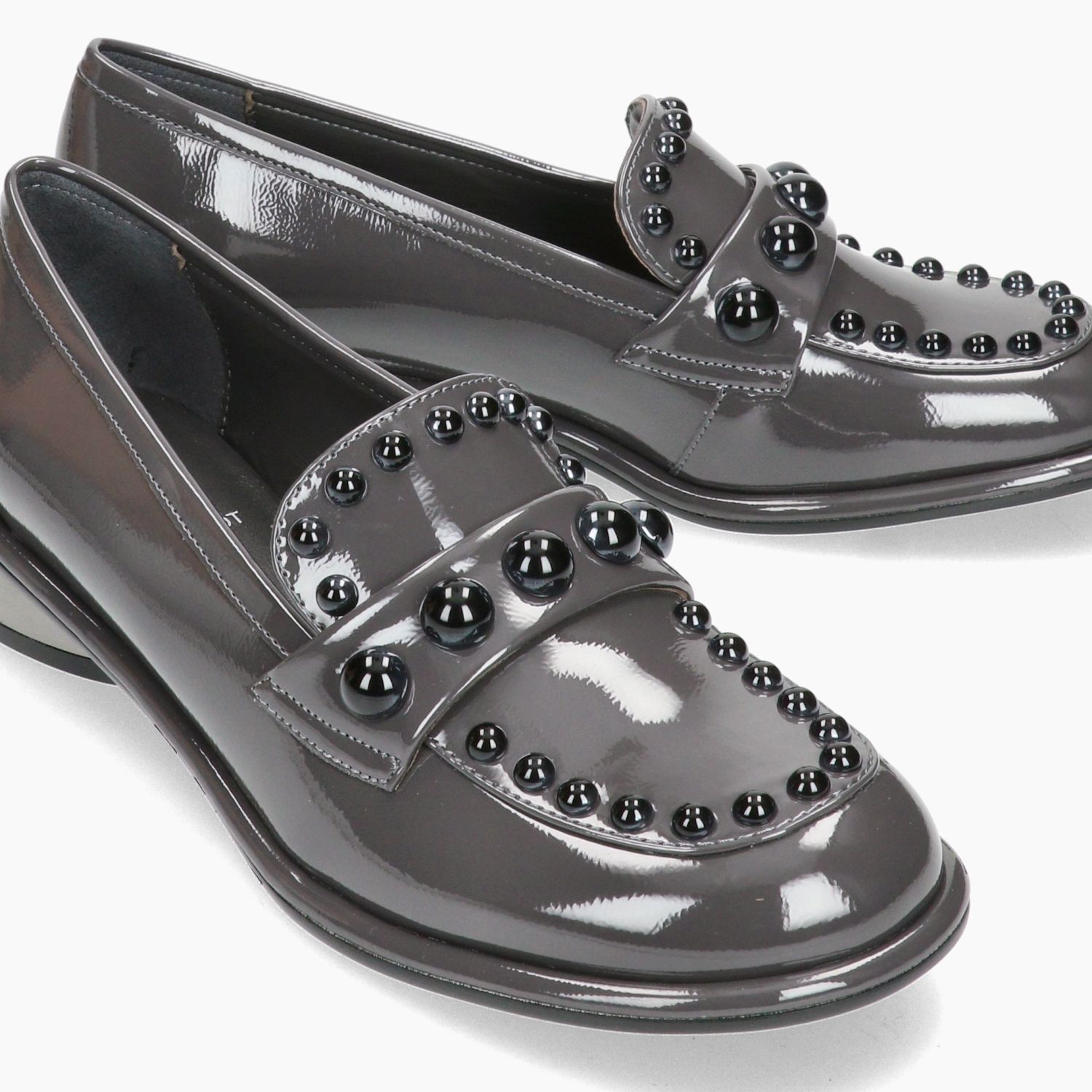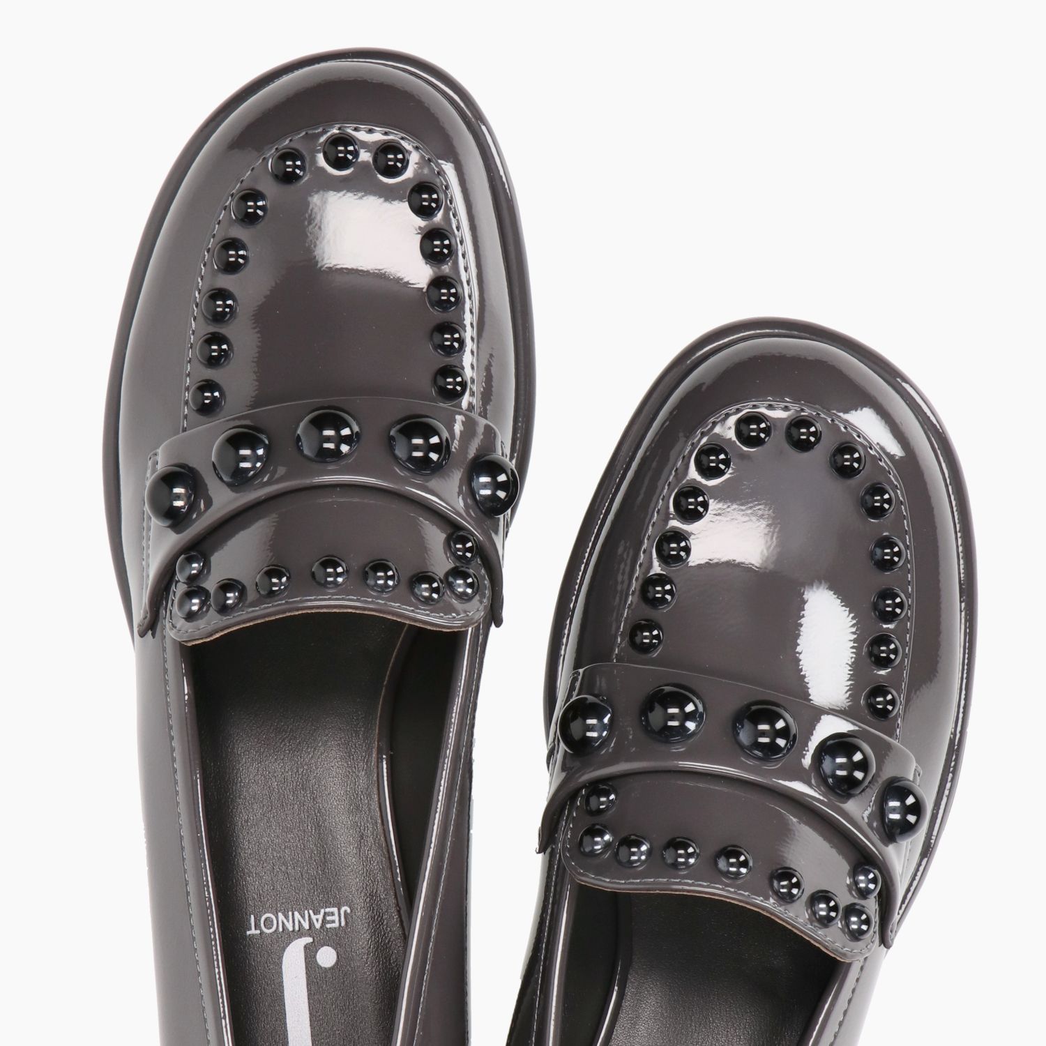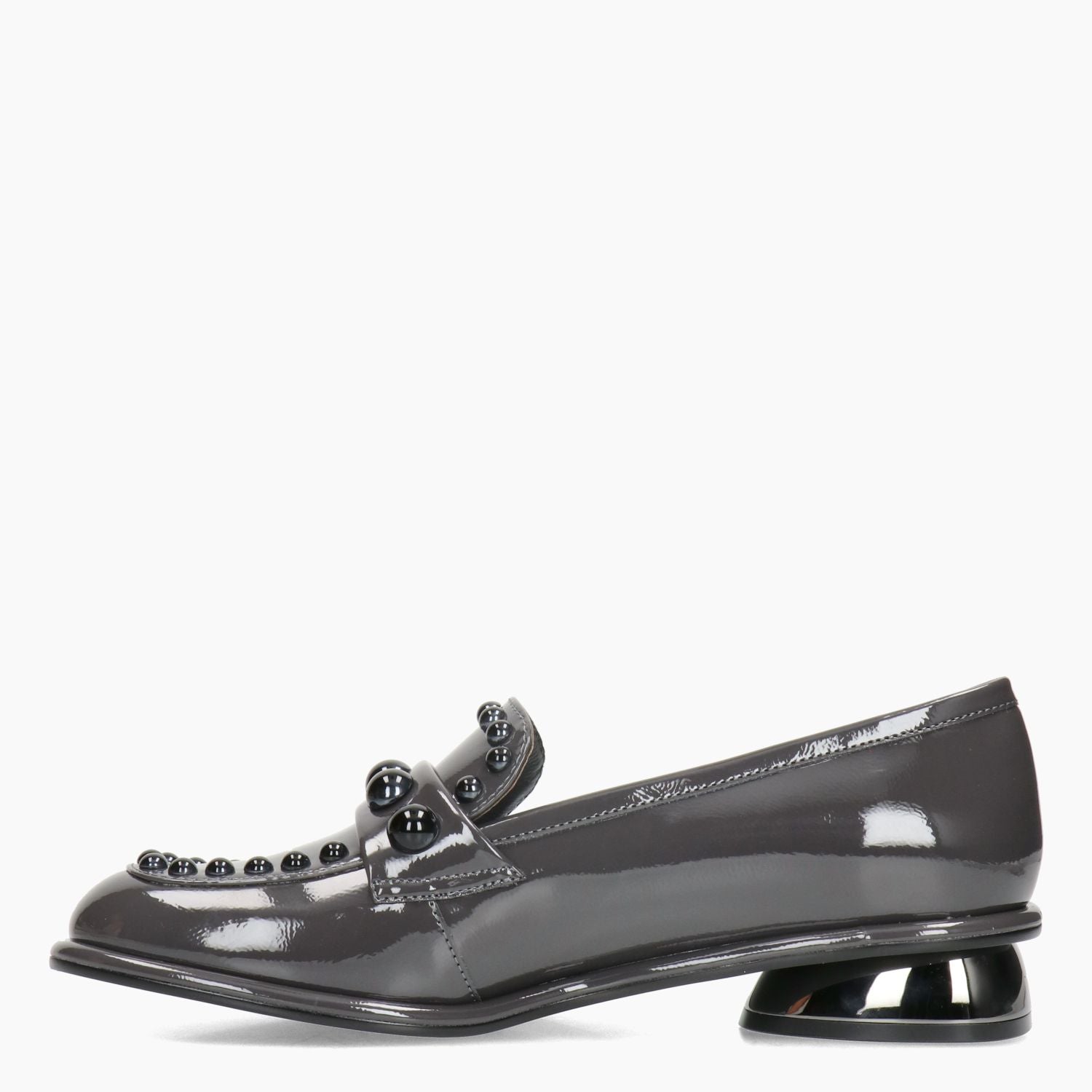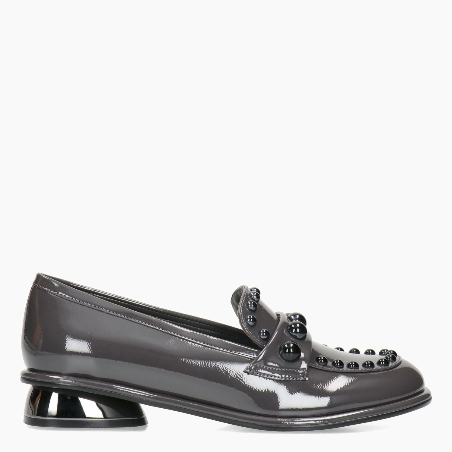 Gray patent leather loafer. Strap and trim with black spherical studs. Leather lining with non-removable insole. Rubber sole with 3 cm heel. Jeannot women's Fall/Winter collection.