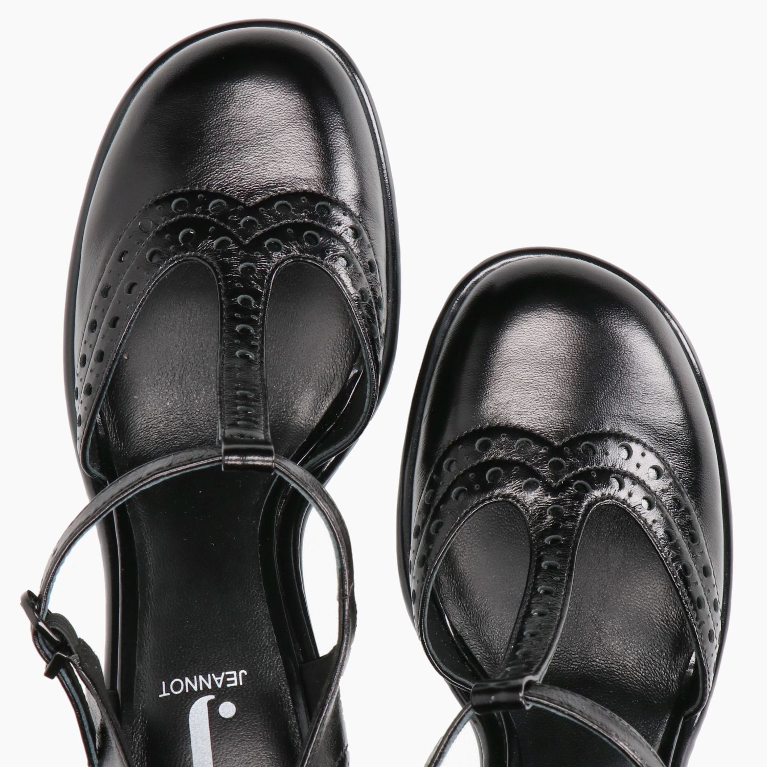 Black patent leather open-toe shoe. Adjustable T-strap at the ankle. Leather lining with padded insole. Rubber sole with 7.5 cm heel. Jeannot women's fall/winter collection.
