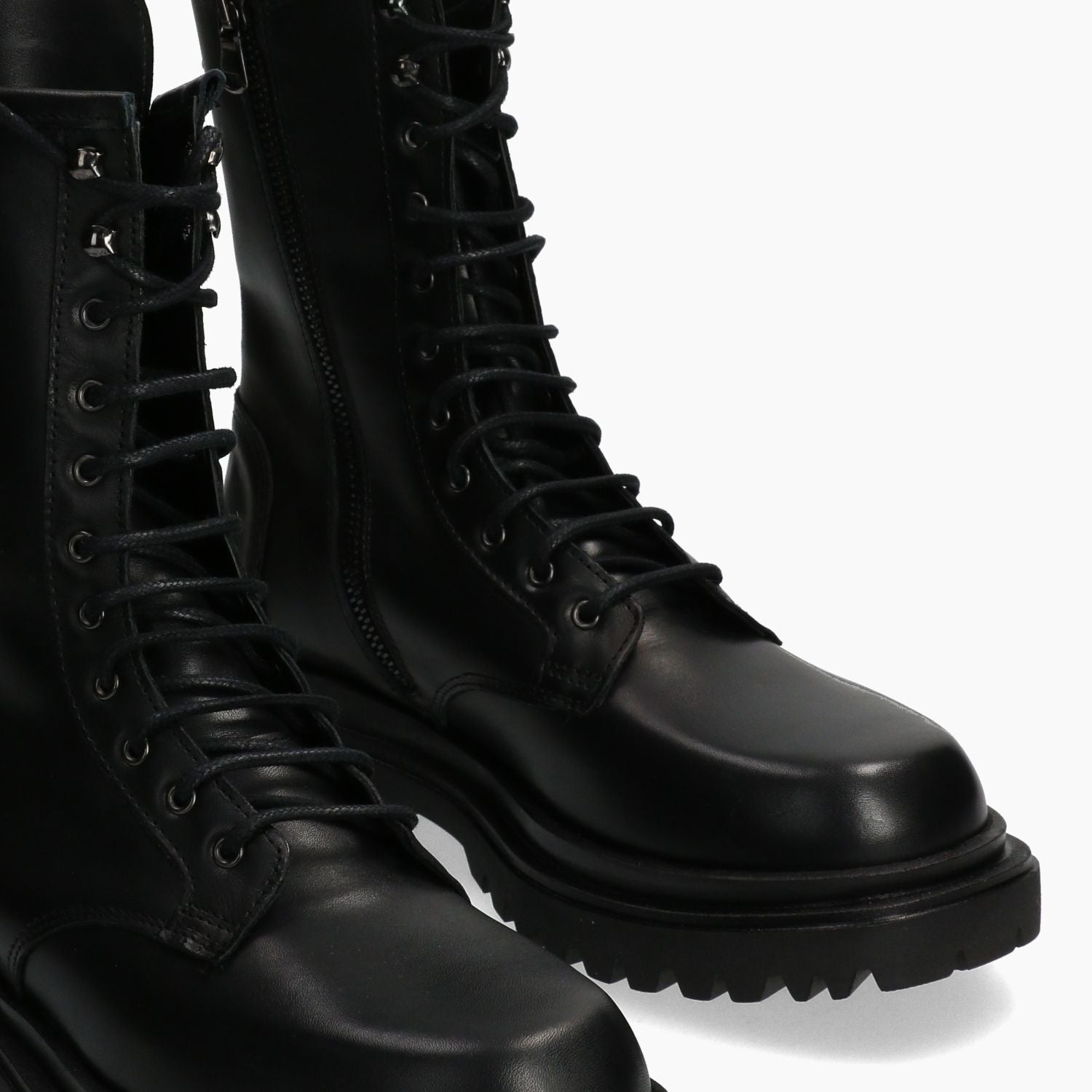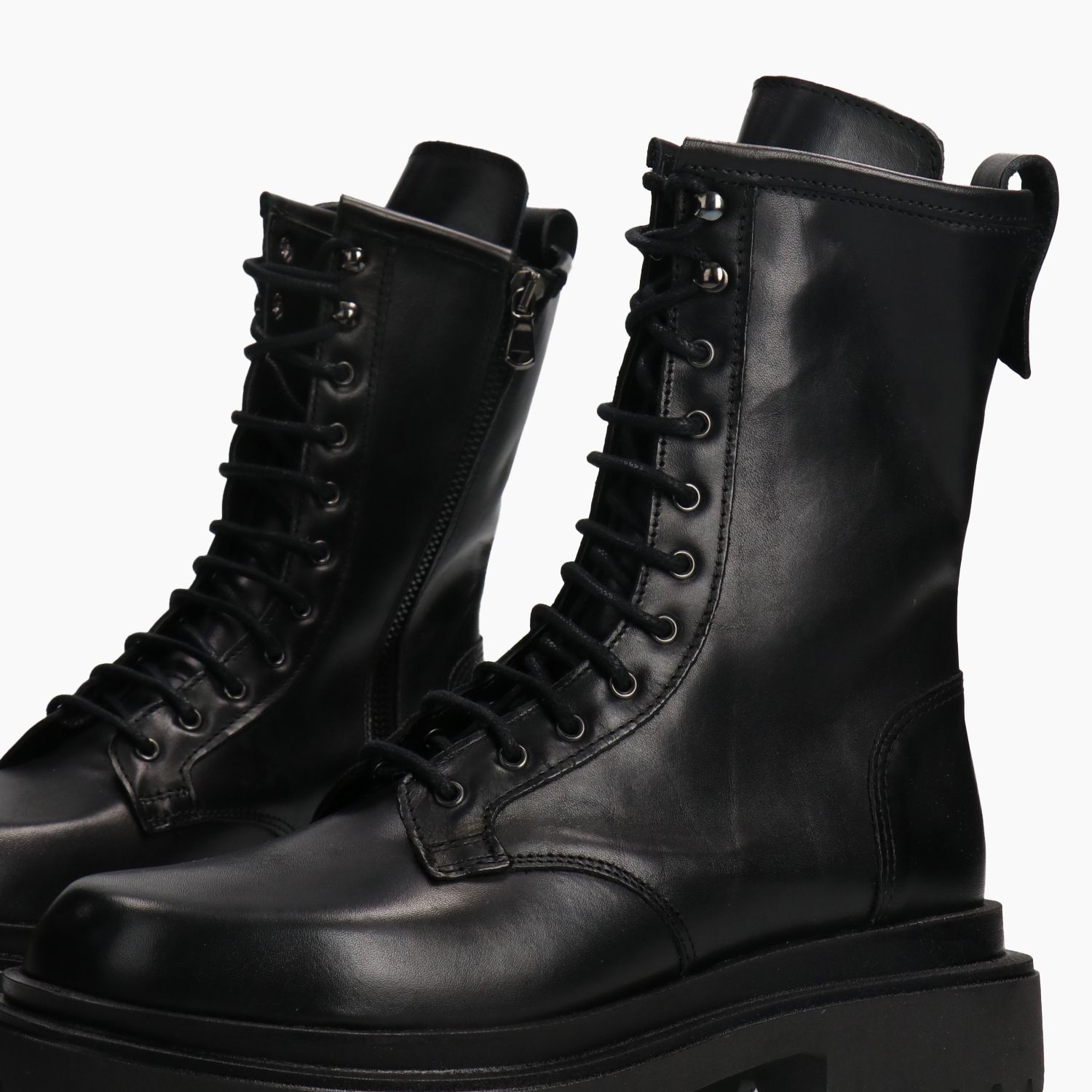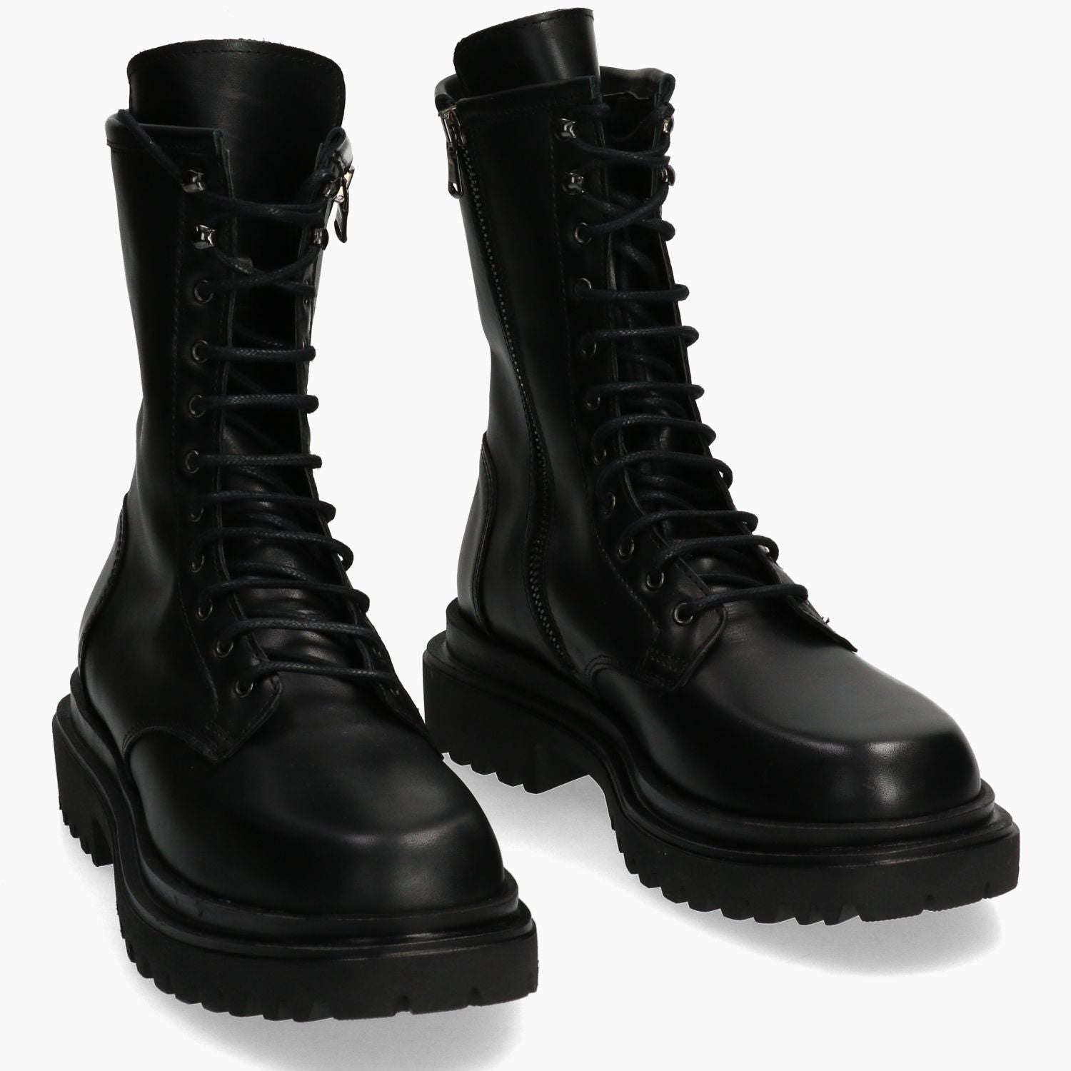 Black leather combat boots. Lace-up and internal zip closure. Leather lining. 4 cm rubber sole. KBR women's Fall/Winter collection.