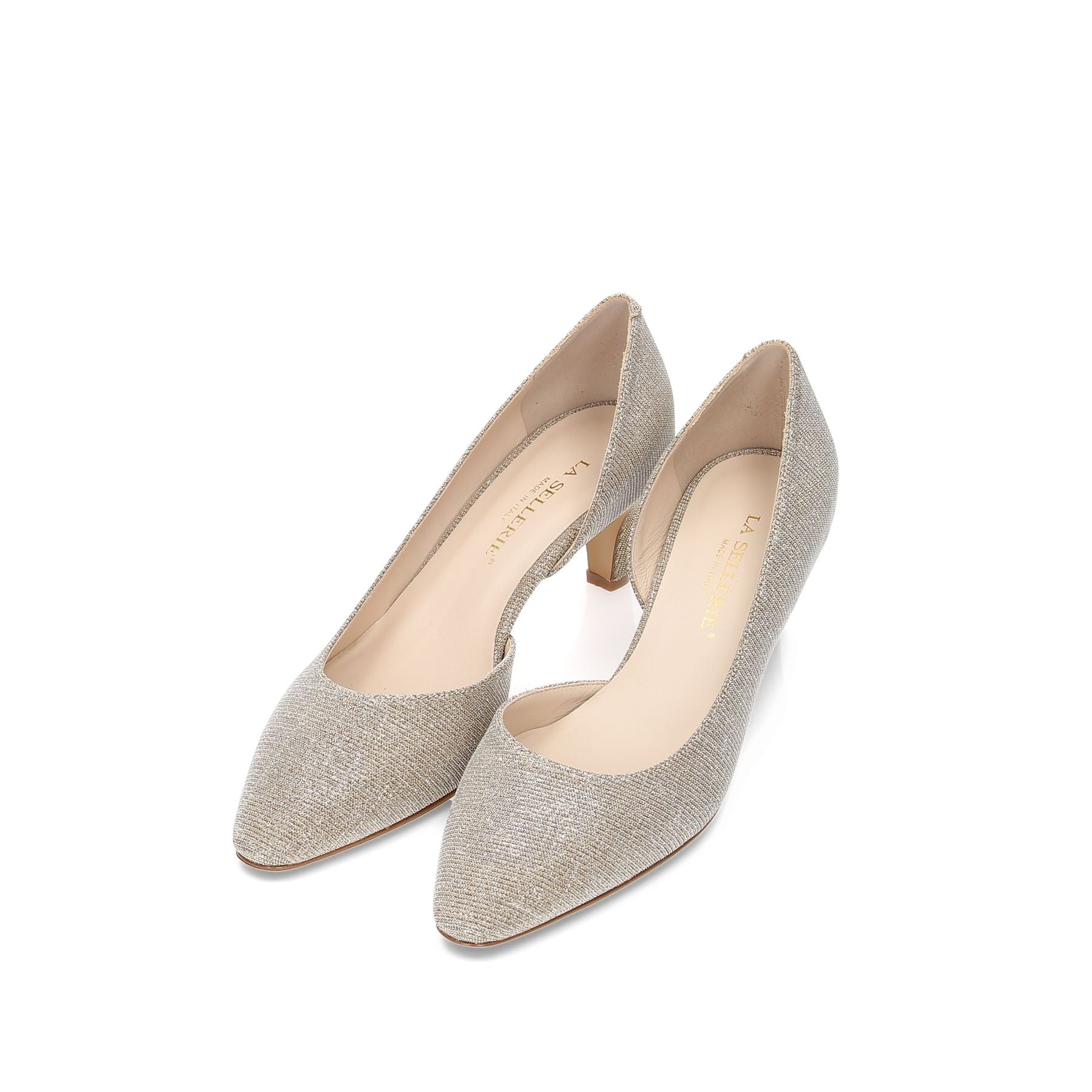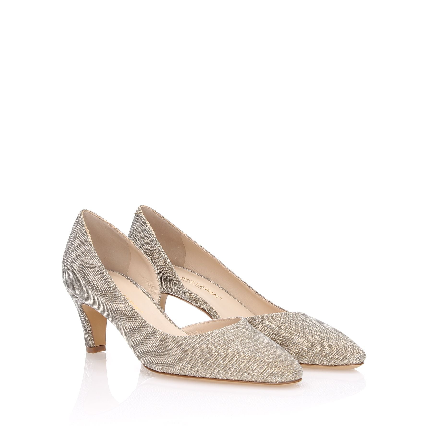 Gold laminated fabric décolleté with internal opening, 50 cm heel, leather sole.