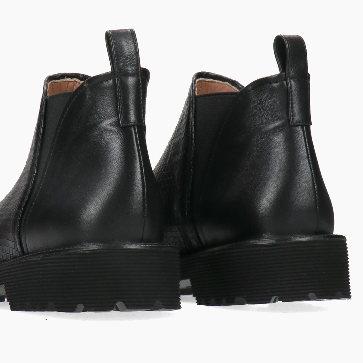 Black reptile-print leather ankle boot. Black elastic sides. Smooth leather heel. Leather interior. Vibram microporous rubber sole with 3 cm heel. La Sellerie women's Fall/Winter collection.