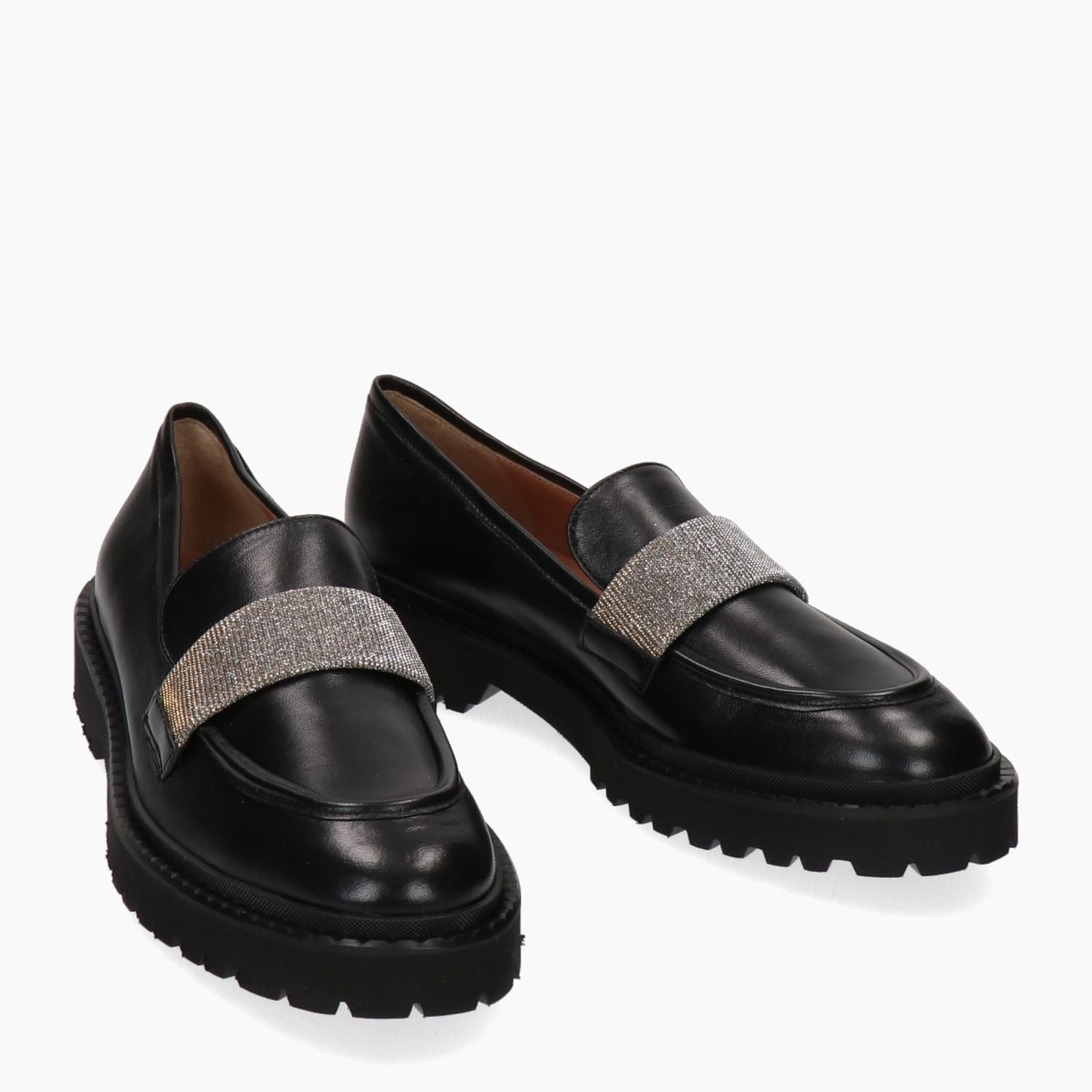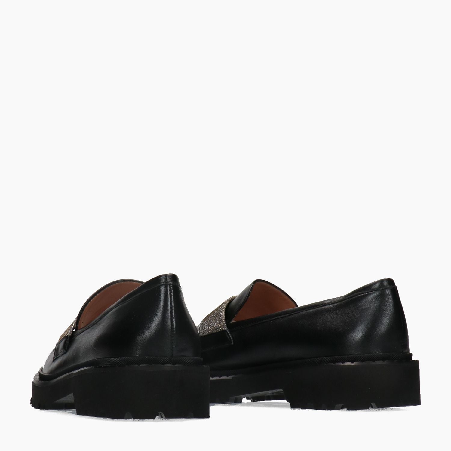 Black leather loafer with laminated fabric strap. Round toe. Leather lining. Non-removable insole. Black Vibram microporous rubber sole. 3 cm heel. La Sellerie women's Fall/Winter collection.