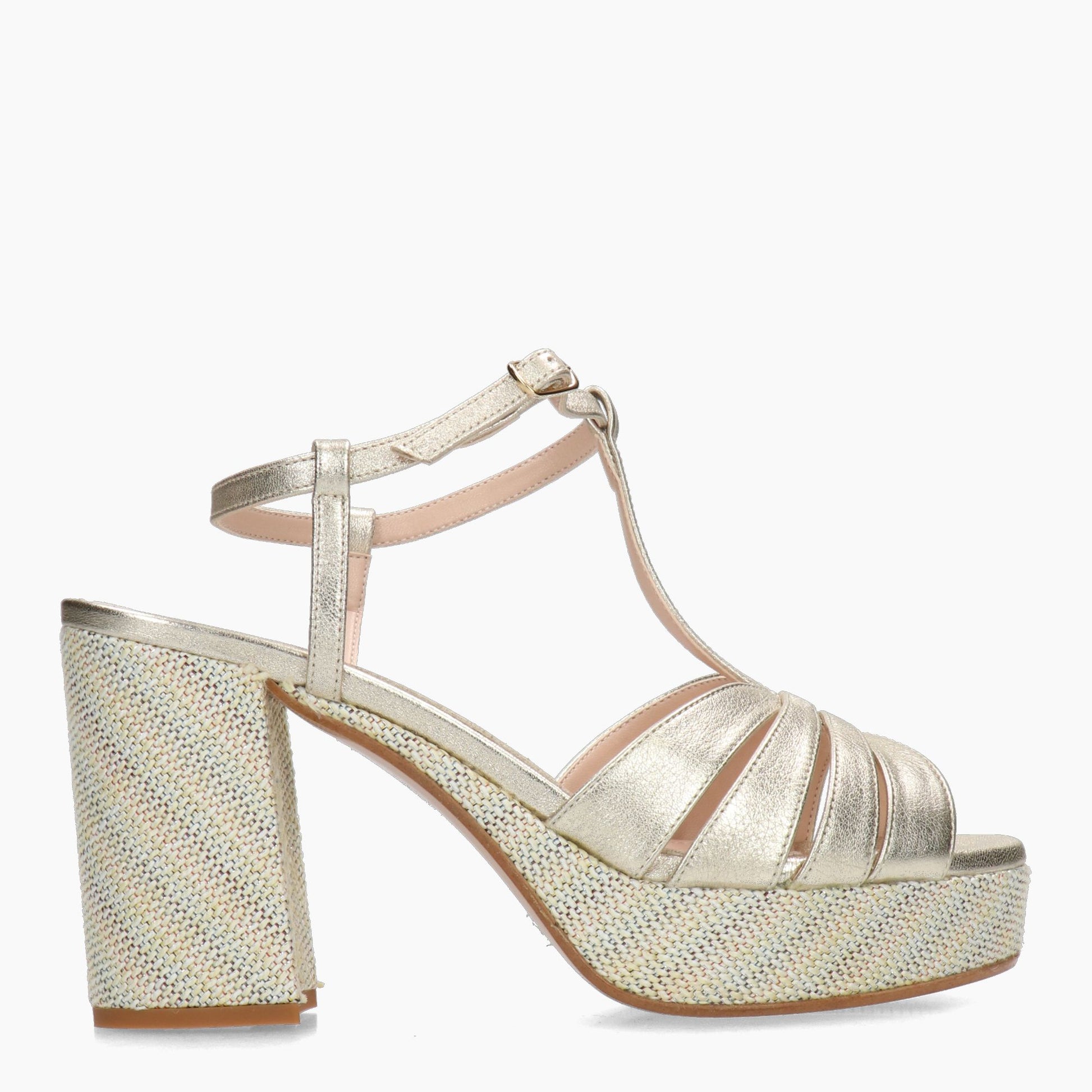 Gold laminated leather sandal. Adjustable buckle. Leather lining. Rubber sole with 8.5 cm heel and 3 cm platform covered in patterned fabric. Lara May Spring/Summer collection.