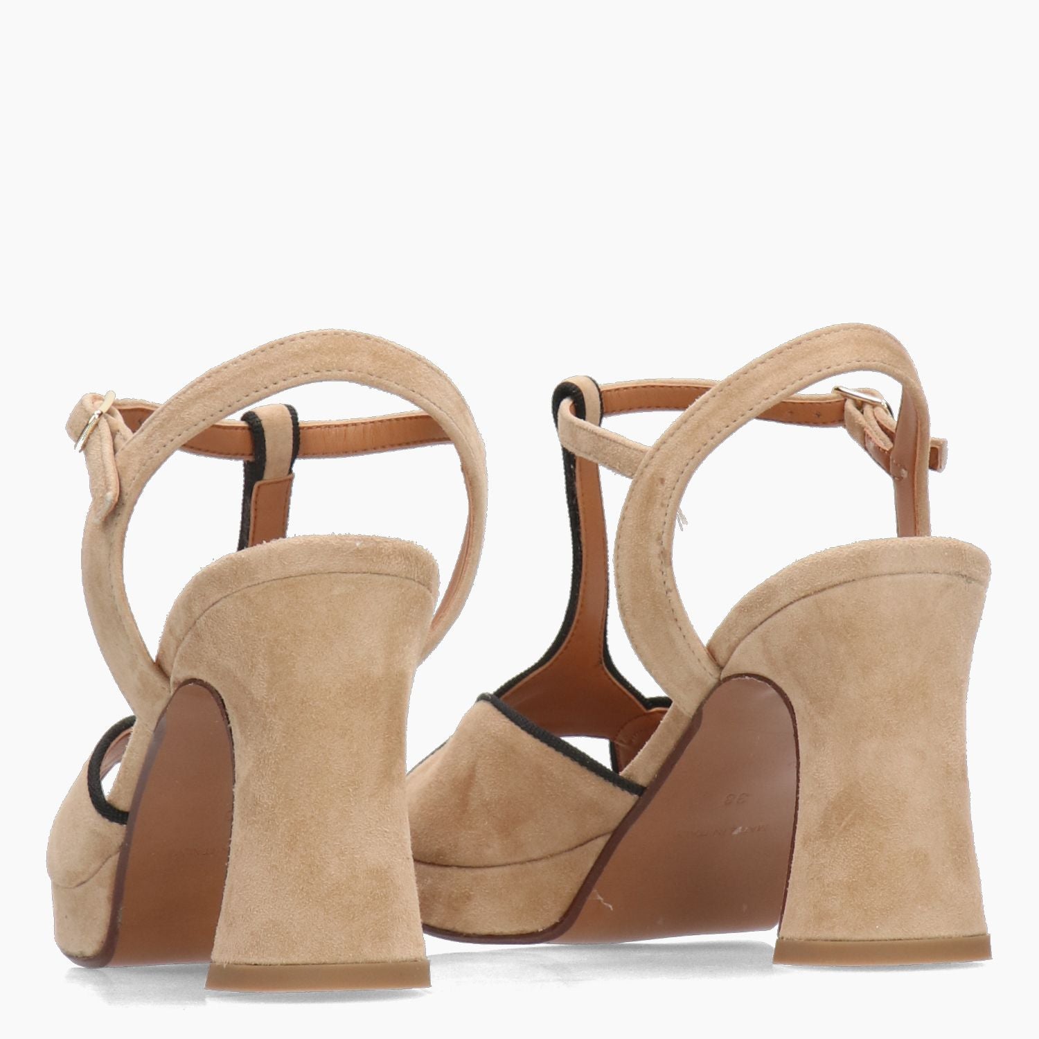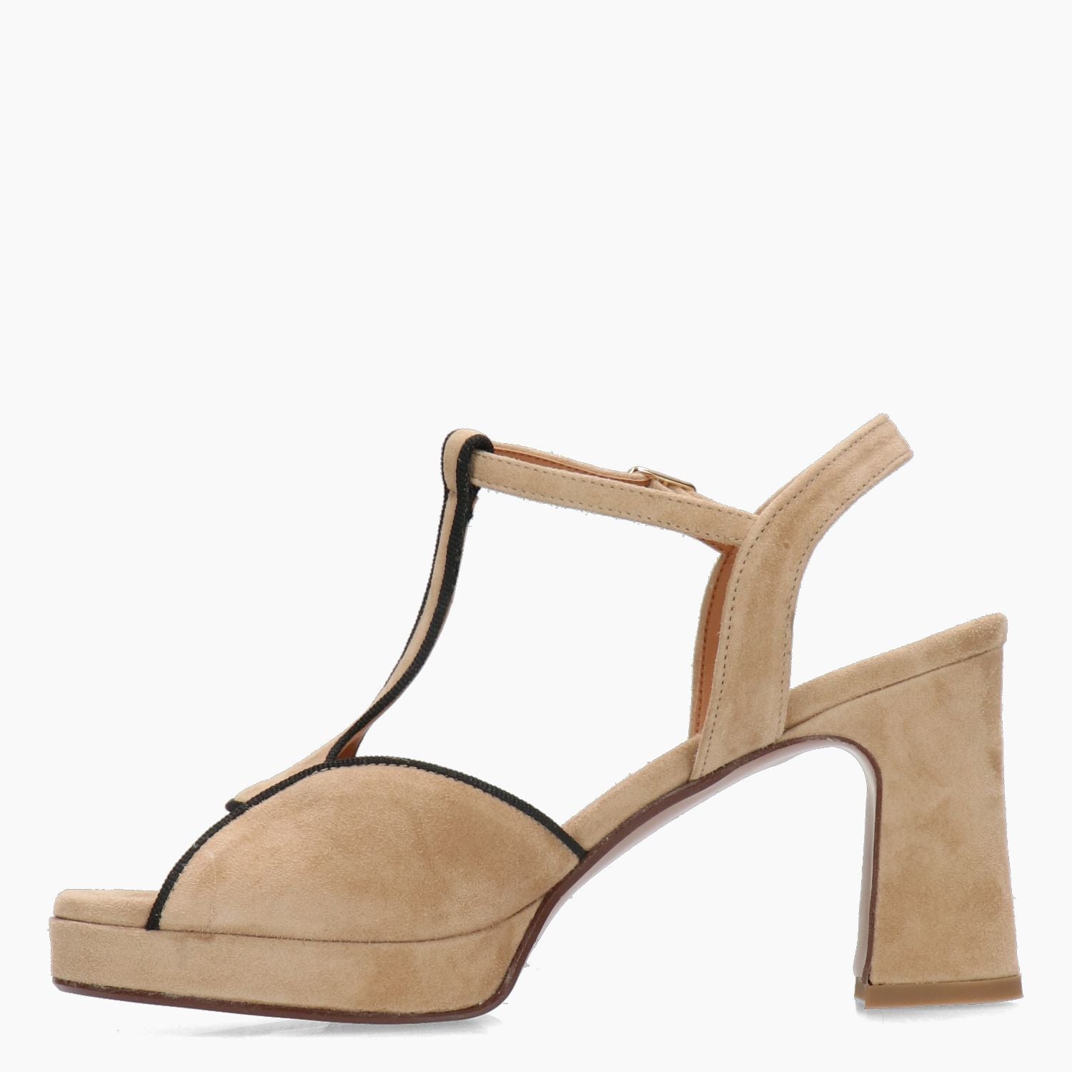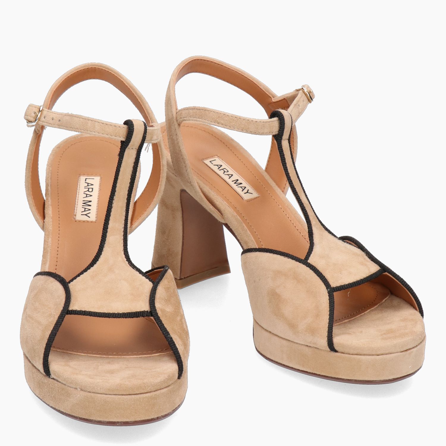 Beige suede sandal with black gross grain trim. Adjustable buckle. Leather lining. Rubber sole with 7 cm heel and 2 cm covered platform. Lara May Spring/Summer collection.