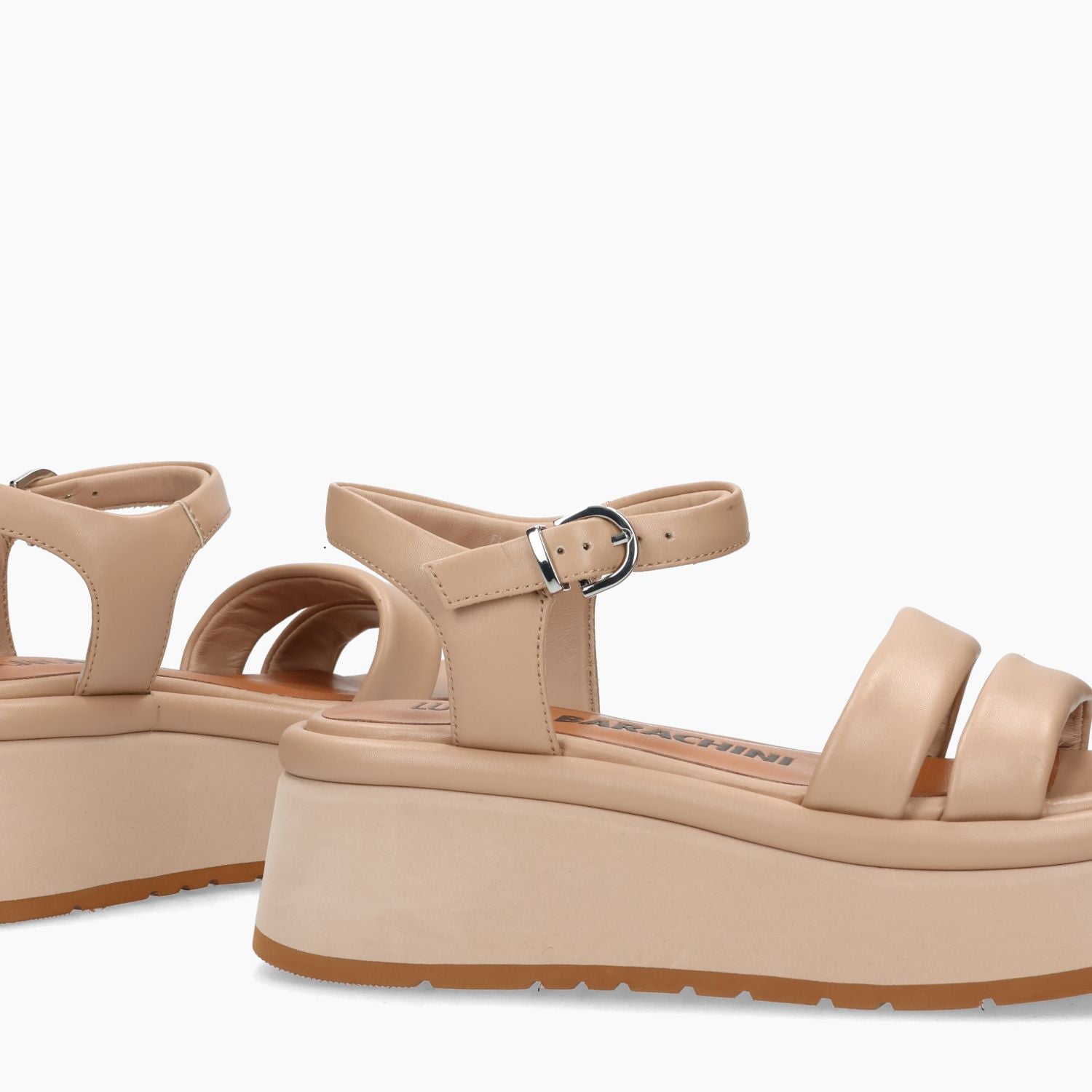 Powder pink leather sandal with adjustable ankle strap. Leather lining. Rubber sole with 6 cm wedge. Luciano Barachini women's Spring/Summer collection.