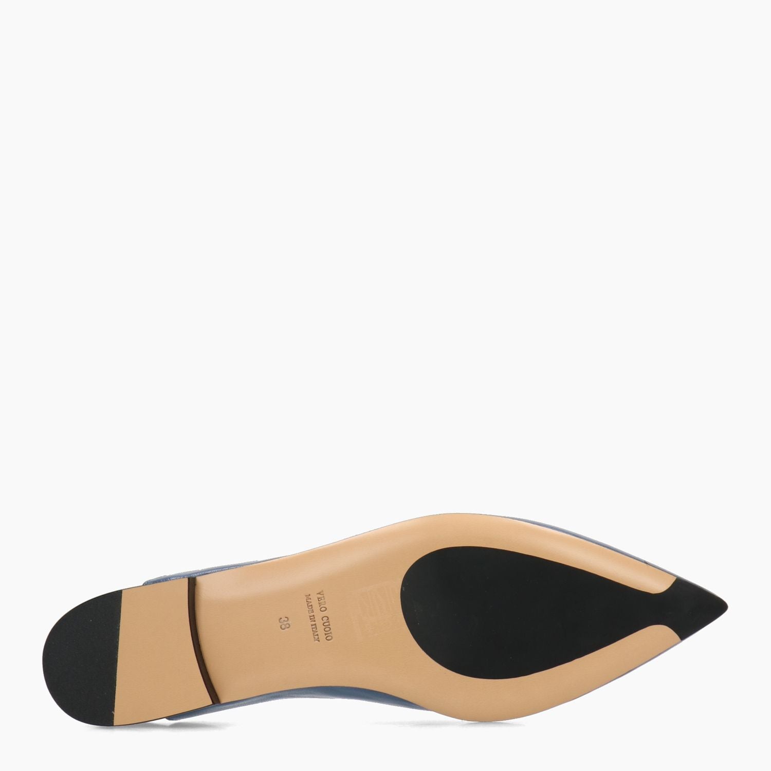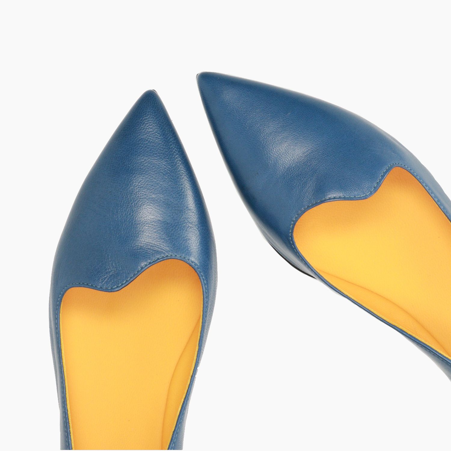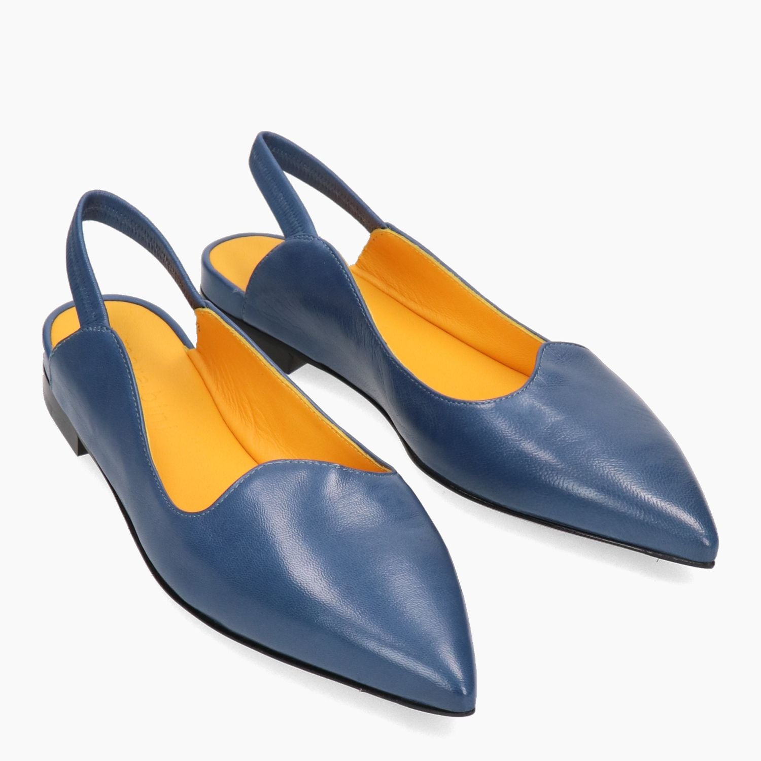 Jeans-colored leather slingback pump with elastic strap. Asymmetrical neckline. Leather lining. Leather sole with non-slip rubber insert. 2.5 cm heel. Mara Bini women's spring/summer collection.