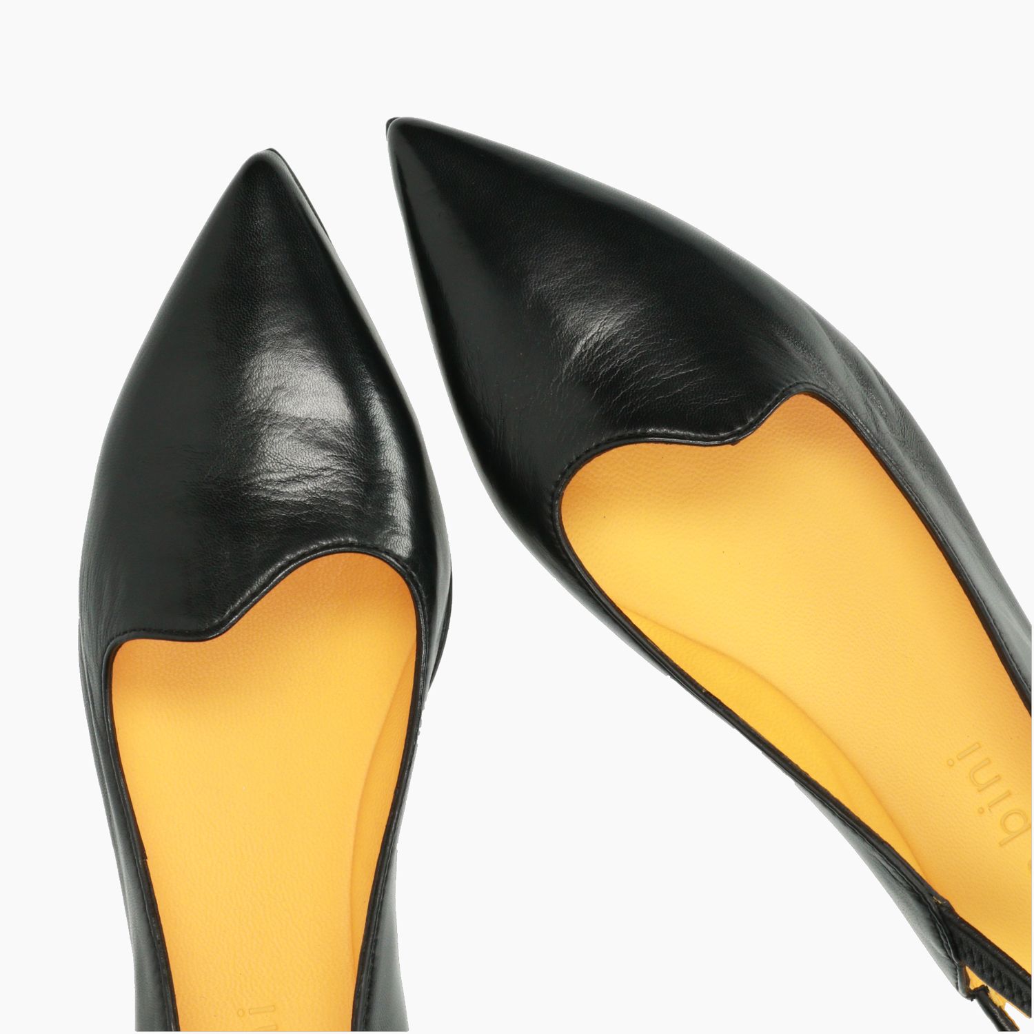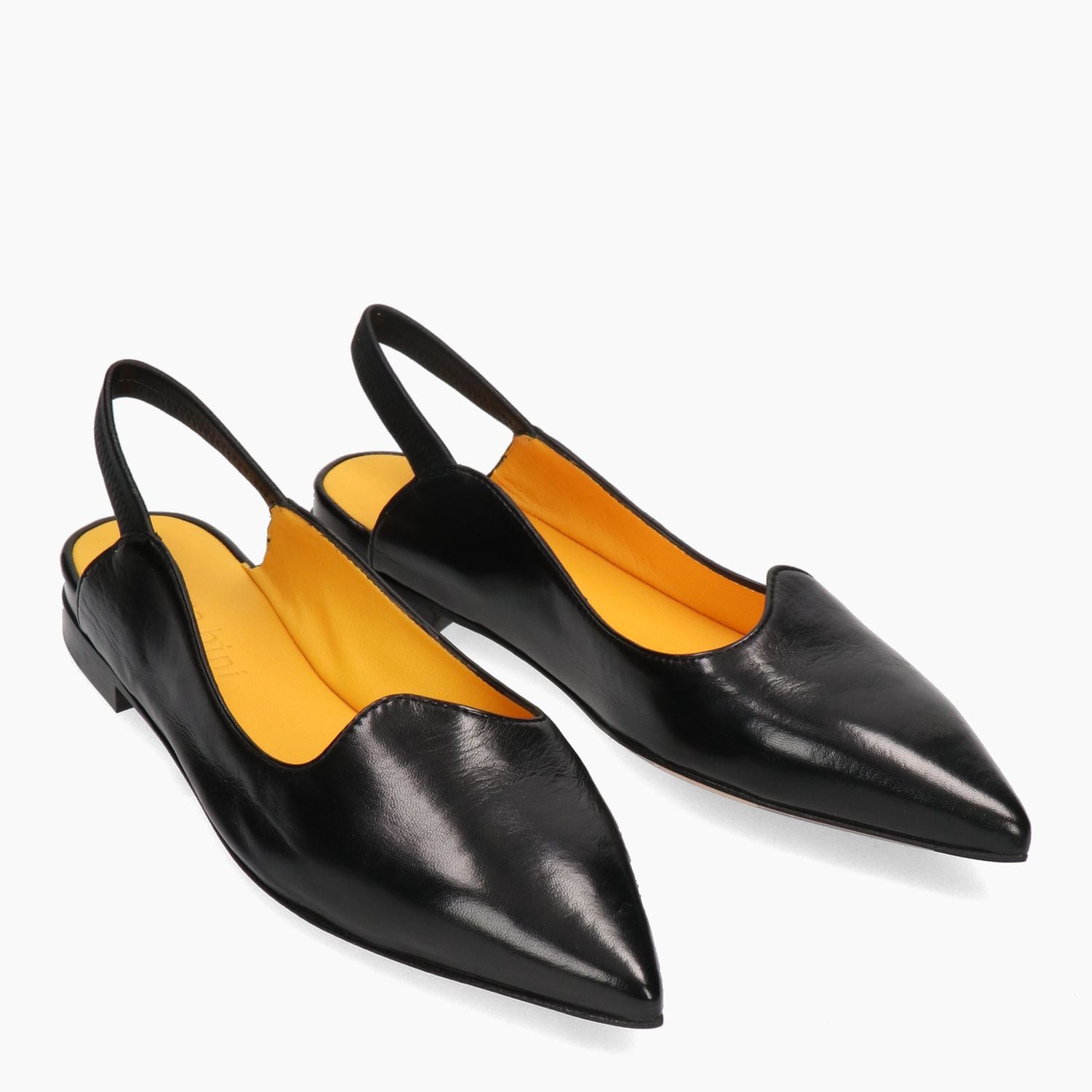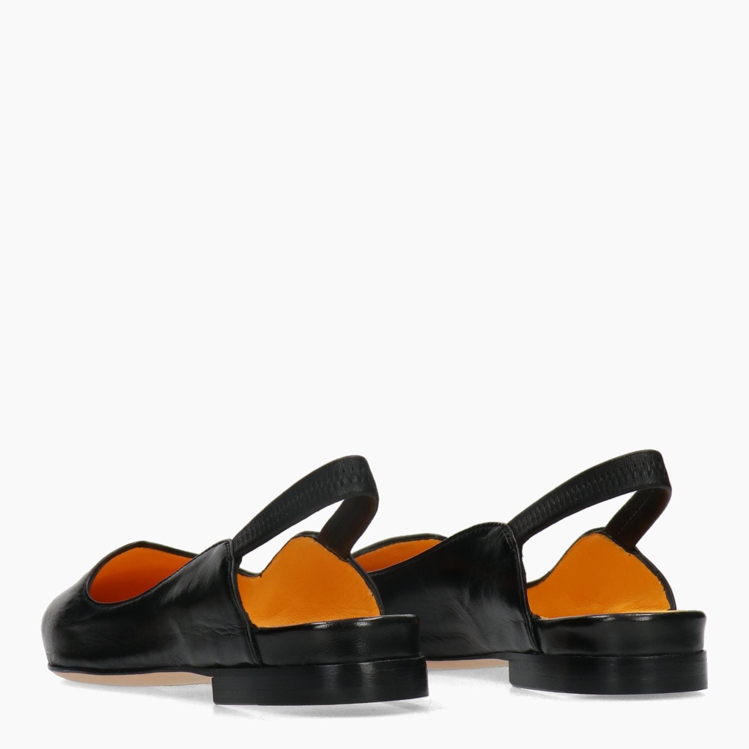 Black leather slingback pump with elastic strap. Asymmetrical neckline. Leather lining. Leather sole with non-slip rubber insert. 2.5 cm heel. Mara Bini women's spring/summer collection.