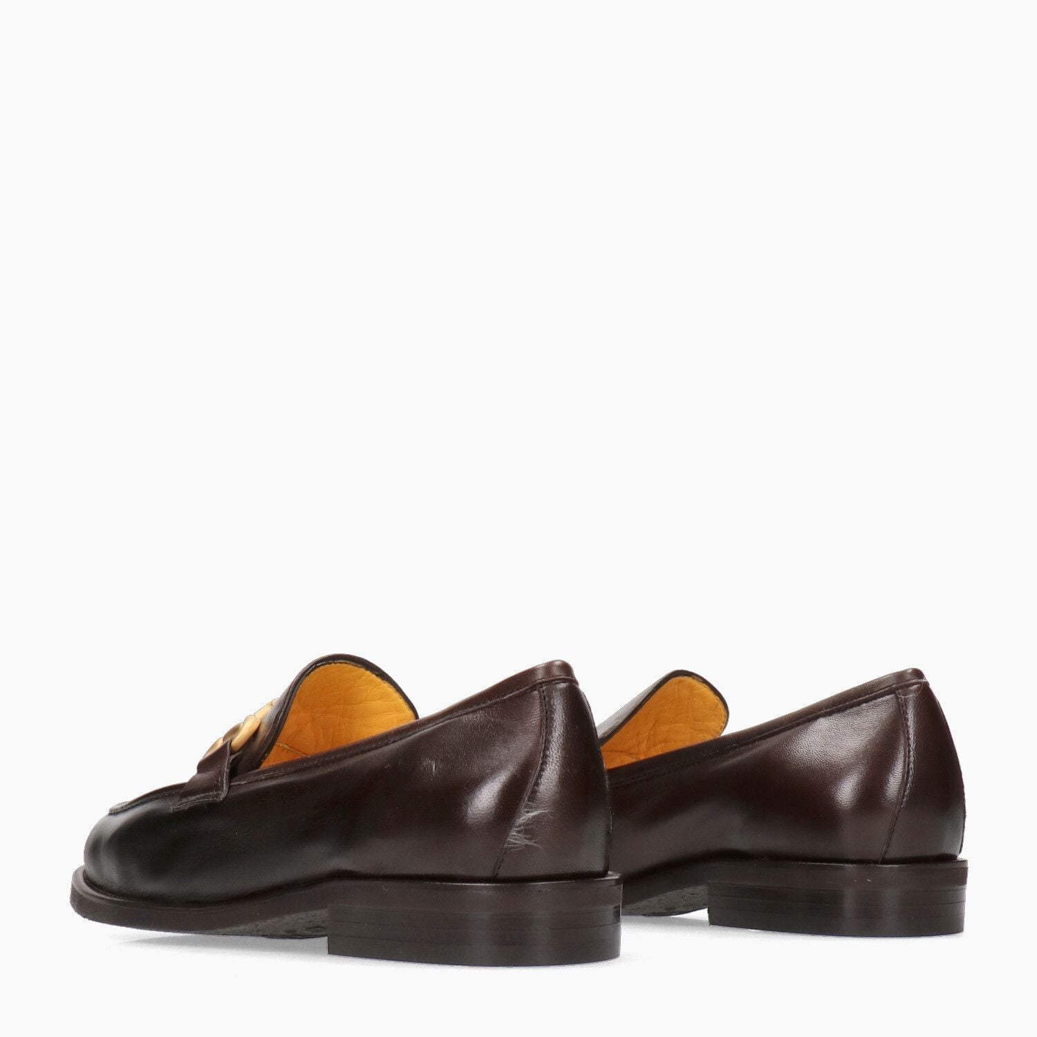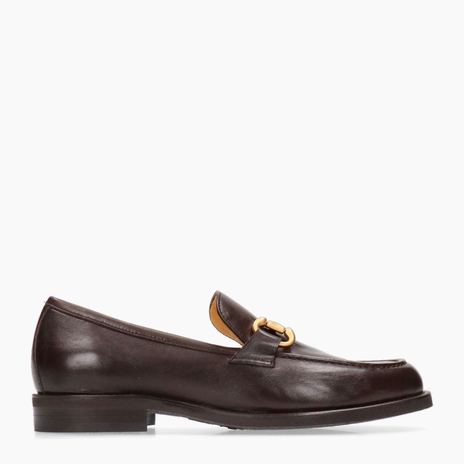 Leather loafer. Coffee-colored leather upper with brass-tone buckle. Round toe. Yellow leather lining. 2 cm heel. Rubber sole. Handcrafted slip-on style. Mara Bini women's Fall/Winter collection.
